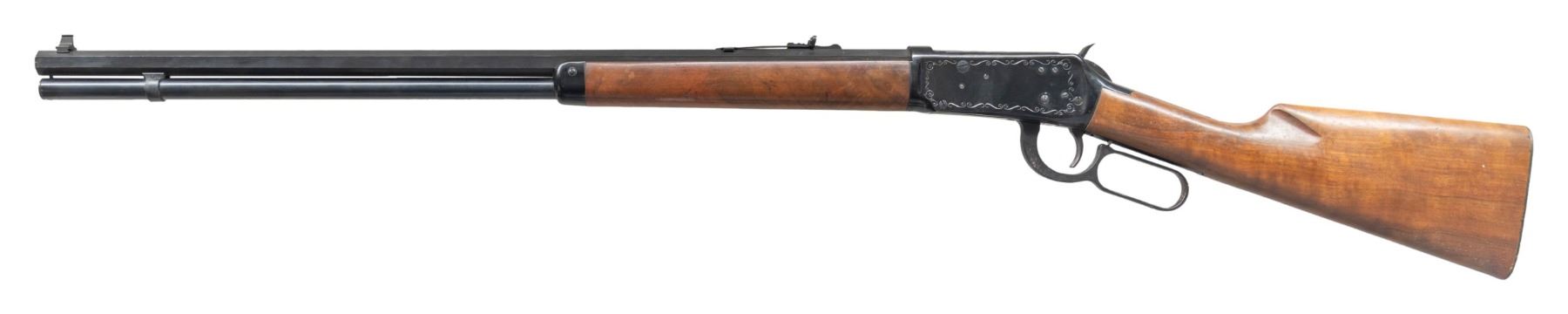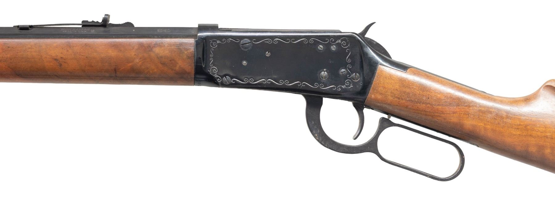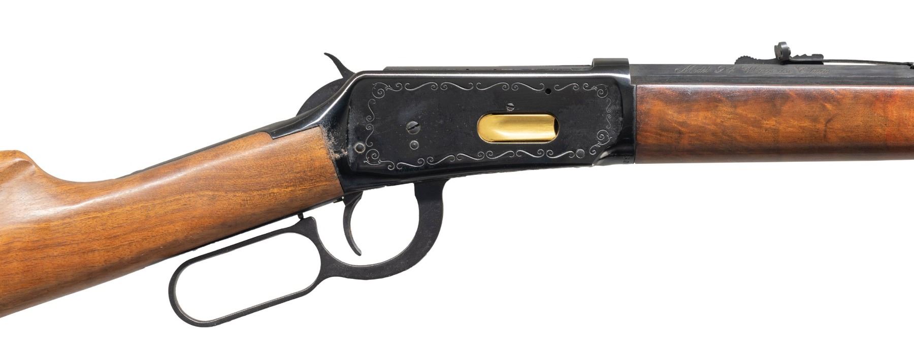 LEVER ACTION RIFLE. Cal. 30-30. S#3086597. Mfg. 1967. Bbl. 26" oct with dovetailed high bead front sight. Elevator adjustable rear sight. "Model 94 Winchester Classic" Marked on the right bbl flat. Receiver is decorated with a scroll border and gold plated loading gate. Straight grip plain walnut stock set with checkered steel shotgun buttplate. CONDITION: overall good. Bbl shows only a few minor handling marks. Receiver has some spots of oxidation with one heavy crust spot at the wrist. Good stock set with some handling marks. Buttplate has spots of oxidation present. Bright bore with distinct rifling. (25-1392/ZAL). CURIO. $400-600.