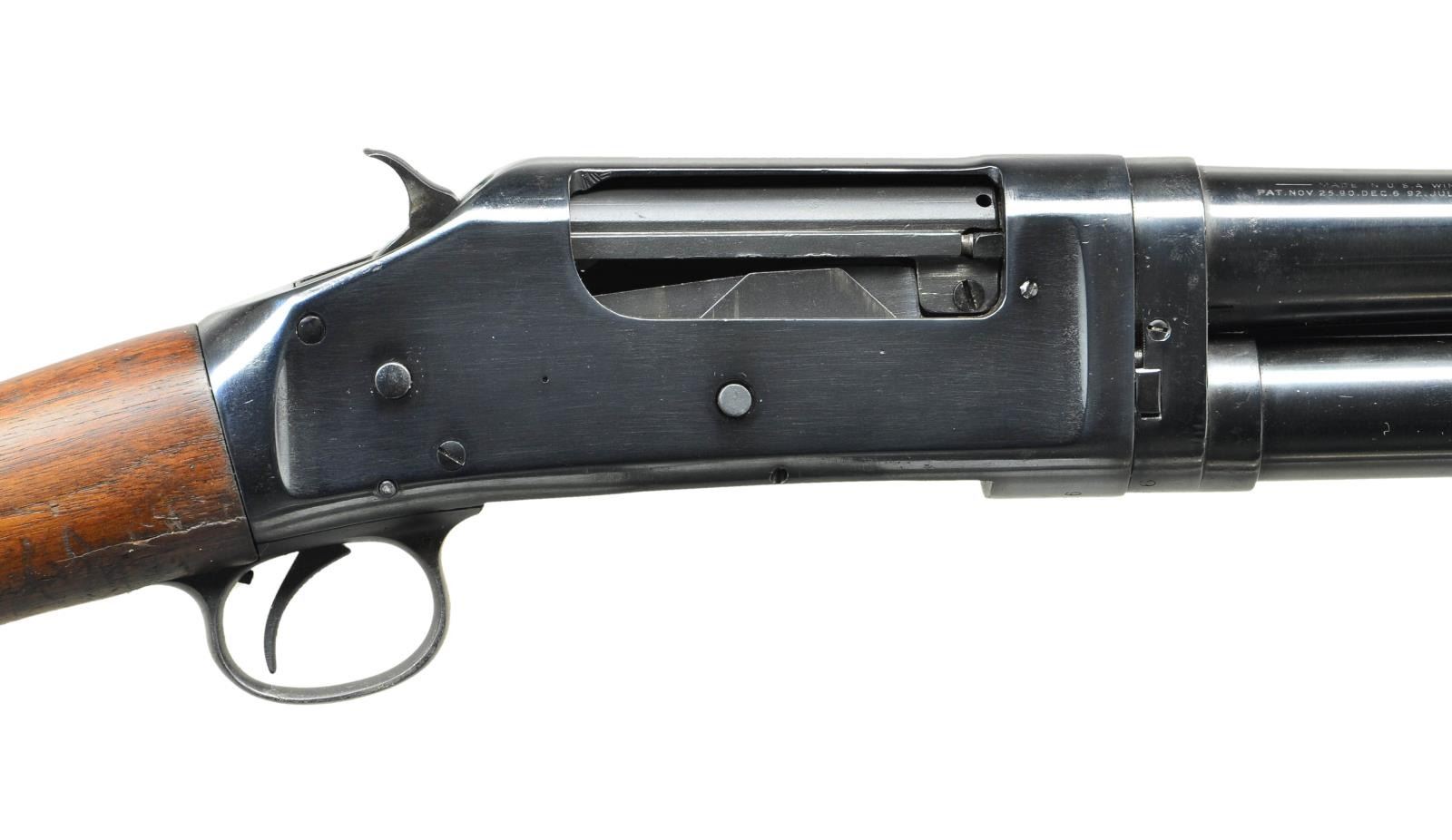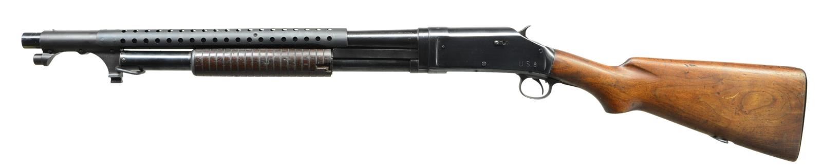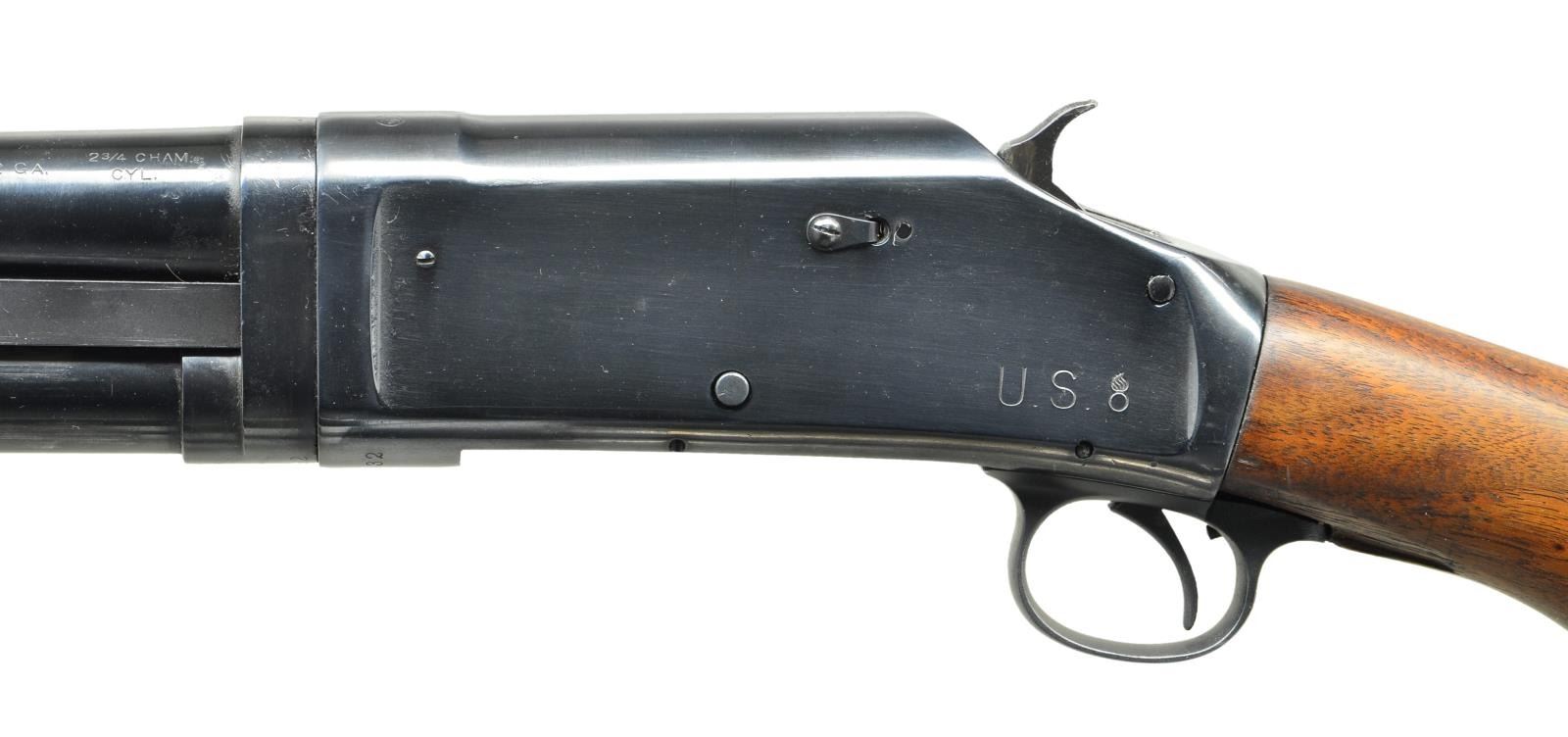 Cal. 12 Ga., 2 3/4". S# 953632. Bbl. 21" cyl. bore w/ 4 row reproduction handguard & bayonet lug. Takedown action. Left side marked "U.S." followed by flaming bomb ordnance mark. Sm. rnd. grooved forearm & pistol grip walnut stock w/ sling swivel & replacement steel shotgun buttplate. WWII era mfg. CONDITION: bbl. & action retain over 97% reblued finish showing areas of remaining pitting. Handguard has good matte finish. Forearm has dark worn appearance w/ cracks & missing chips on left side. Stock shows wear & handling marks w/ lg. chip & cracks around trigger guard tang. Action shows wear & will not always lock up properly. Good bright bore. PROVENANCE: From the estate collection of Charles P. Obremski. (22-1254/DS). CURIO. $800-1,200.