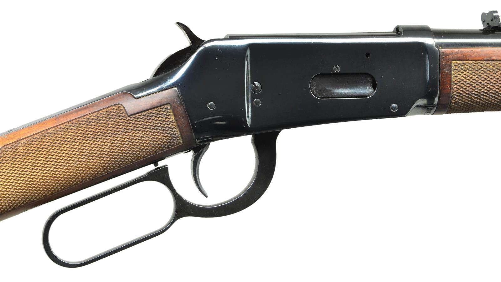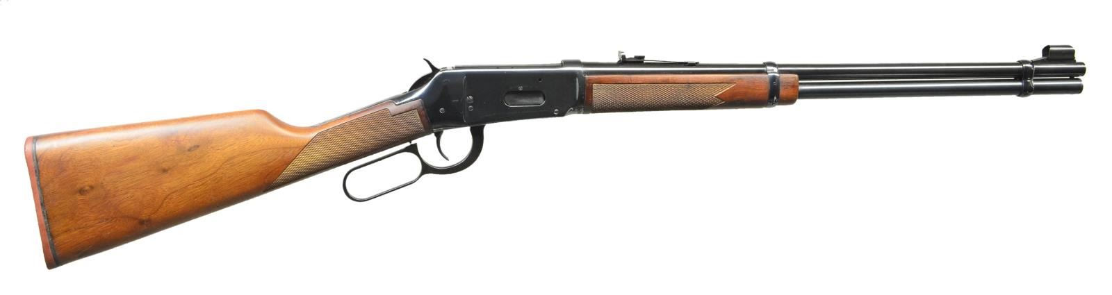 Cal. 375 Win. S#BB005585. Standard configuration w/ 20" bbl. & standard sights having usual Winchester nomenclature on left side at rear. Blued, reinforced 94 type action has S# on bottom. American walnut stocks w/ some burl figure feature thin Winchester rifle pad & checkering. UNATTACHED ACCESSORIES: 1 box 375 Winchester, 250gr Power-Point SPJ ammo. CONDITION: fine-very fine. Metal parts retaining over 90% original blue w/ considerable freckling evident on action. Stocks show some lifting of finish mostly on left side of butt. Bore is bright & shiny. Mechanically good. (22-2090/MGM). CURIO. $700-1,100.