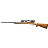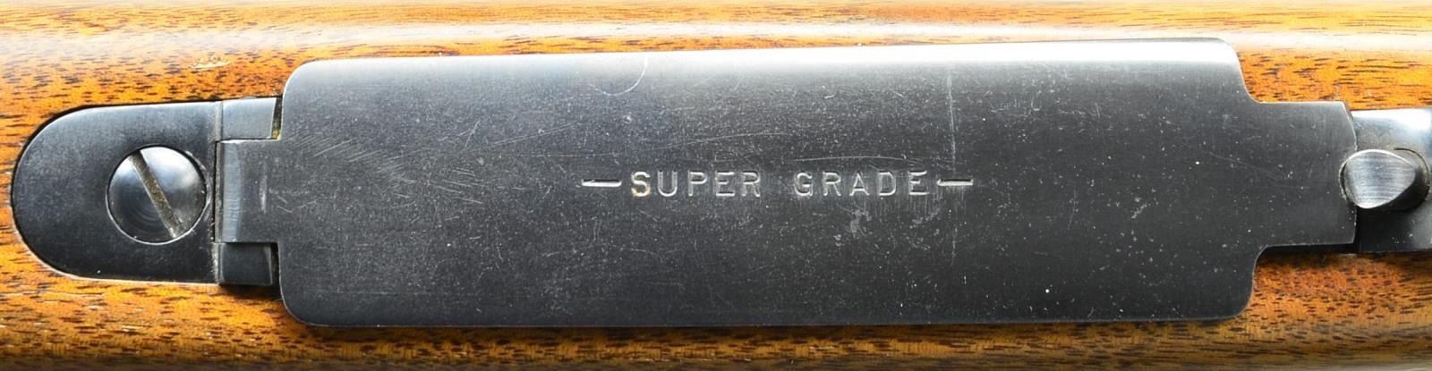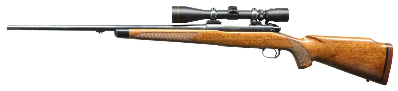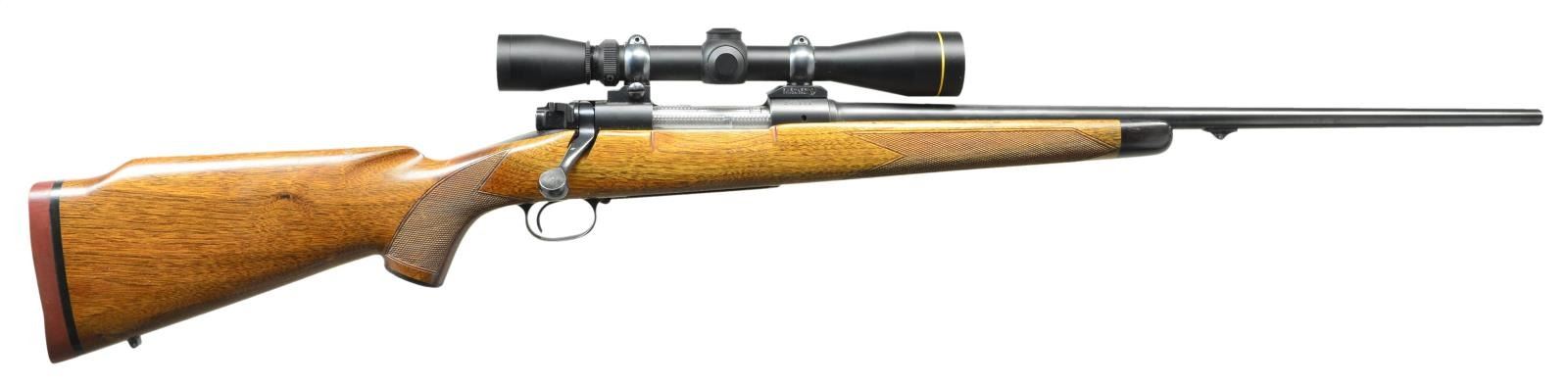 Cal. 270 Win. S# 248171. Bbl. 22" Winchester Featherweight marked w/ front sight removed & contoured to bbl. slot blank in dovetail. Mfg. 1953. Great looking example approximating Super Grade appearance. Nice refinish of metal to give soft matte finish to bbl., normal receiver finish & gloss on floorplate assembly. Floorplate marking has proper style "G" but dashes at ends of markings are straight lines rather than normal shape resembling top of an exclamation mark. Swivel studs are not Super Grade width (modern sporter size): front is on bbl. & rear is single screw in style just forward of solid red Winchester pad (13" LOP). Appears to be regular Monte Carlo stock w/ grip cap & pad added plus shaped area by ejection port. Bolt handle has 2 finely checkered panels plus fine jeweling on bolt body, extractor & follower. Factory checkering ending on forend just before added rosewood tip. Buehler 2 piece mount set w/ matte Leupold VX-II 3-9x40 Duplex reticle scope. CONDITION: very good to excellent overall as refinished to include metal & wood. Faint handling marks on stock. Small scratch on floorplate & edge of eyepiece; all other aspects near excellent including bore. A very nice sporter built on a classic American platform. (22-1832/NW). MODERN. $1,500-2,000