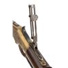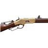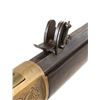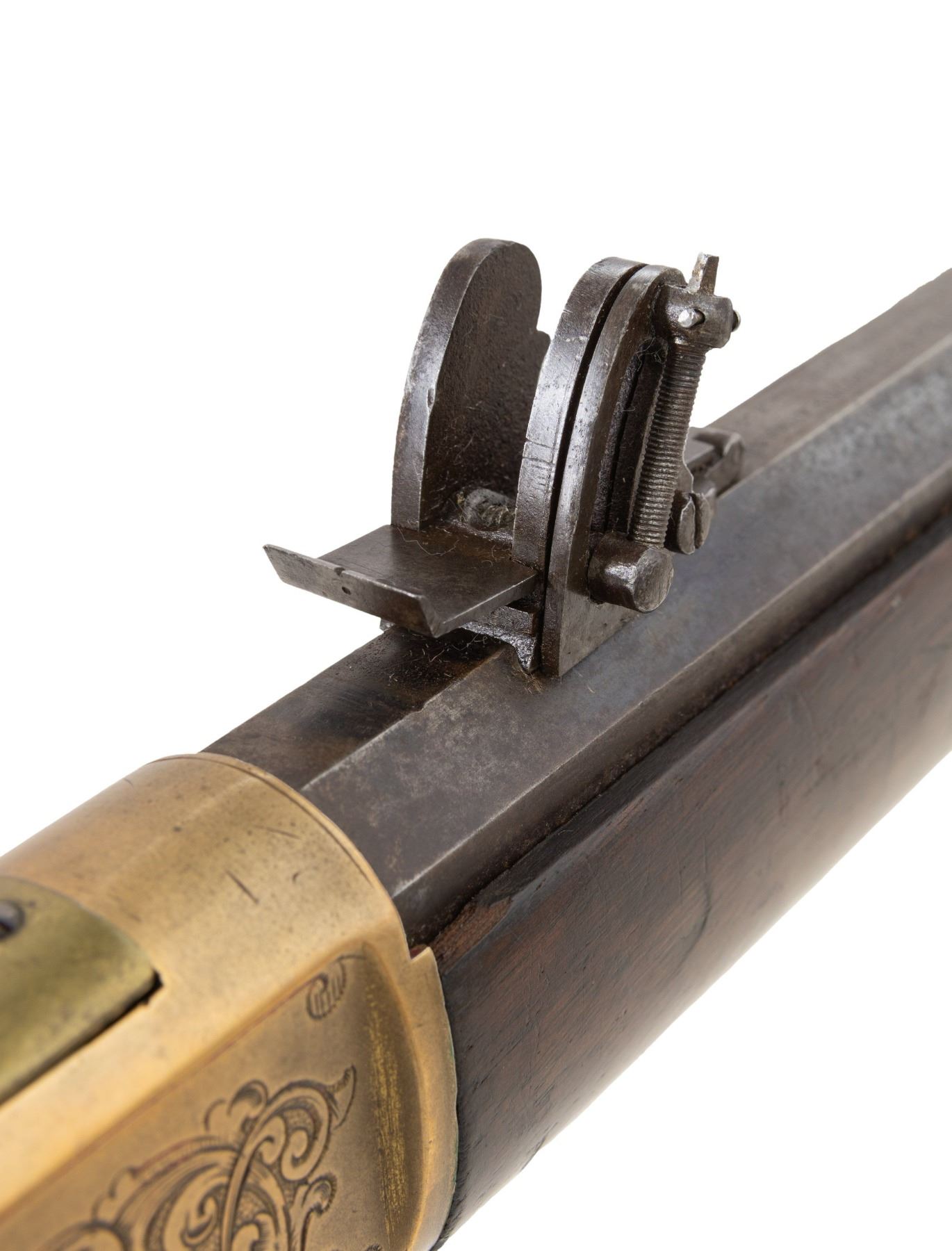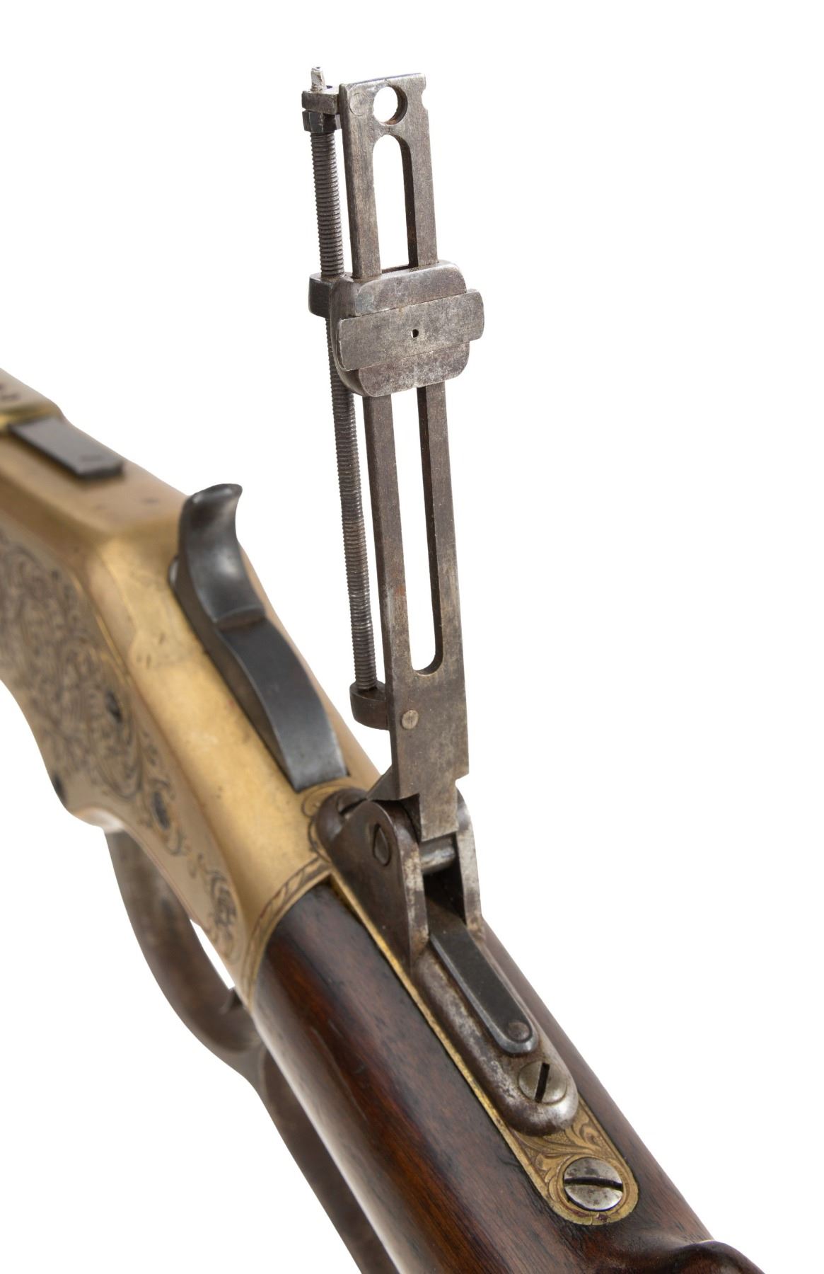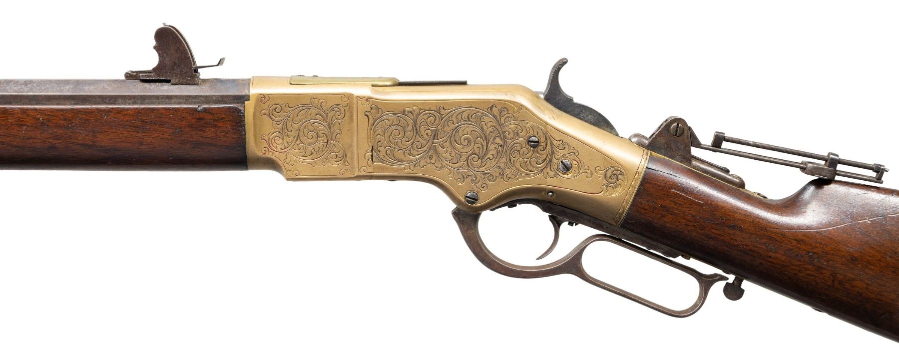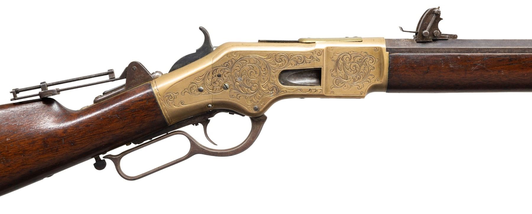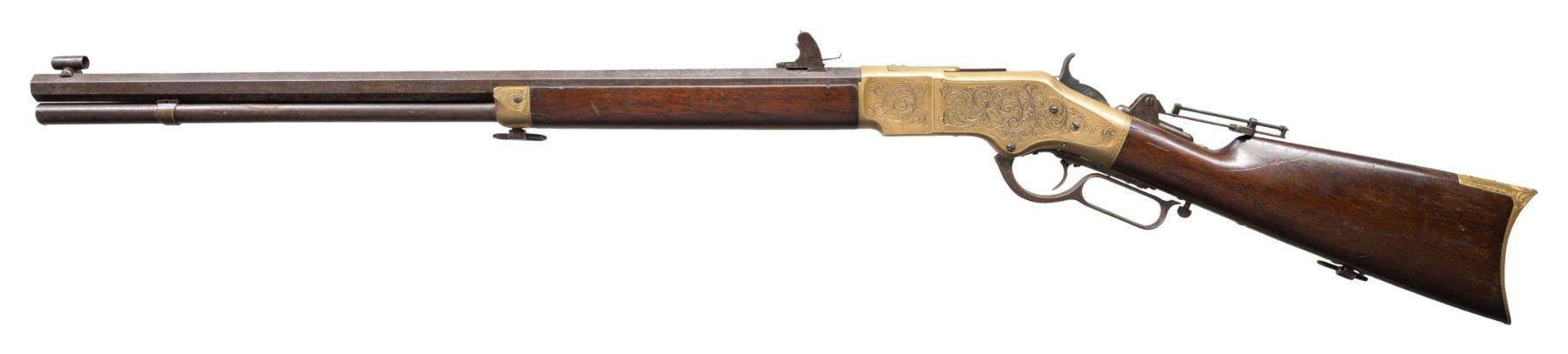 RIFLE. Cal. 44 HRF. S# 32105. Bbl. 24" octagon with King's Improvement patent marking. Globe front sight with an unidentified adjustable leaf rear sight and an early Sharps style vernier tang sight. Full length mag. Brass action generous coverage of New York style vine type foliate scroll hand engraving with punch dot backgrounds. Complimentary engraving extends to the brass forend cap and brass crescent trapdoor buttplate. Unusual features include an added sliding brass dust cover and added single set trigger. Walnut forearm and straight grip stock with sling swivels. Mfg. in 1870. CONDITION: bbl. and mag. tube blue has faded to mottled brown showing small dents on the mag. tube. Bbl. markings remain clear. Brass action has reacquired a mild patina. Lightly refinished stocks show scattered scratches and marks with small chips on both sides of forearm and right side of top tang at the action. Right side of the stock also has a small crack. Custom trigger has stiff function. Bore retains sound rifling showing scattered light pitting. (01-26434/DS). ANTIQUE. $3,000-4,500.