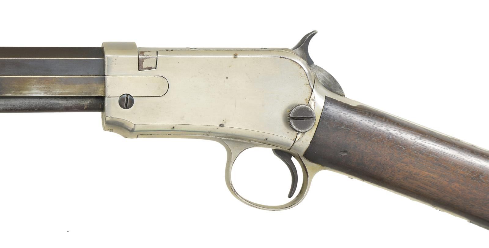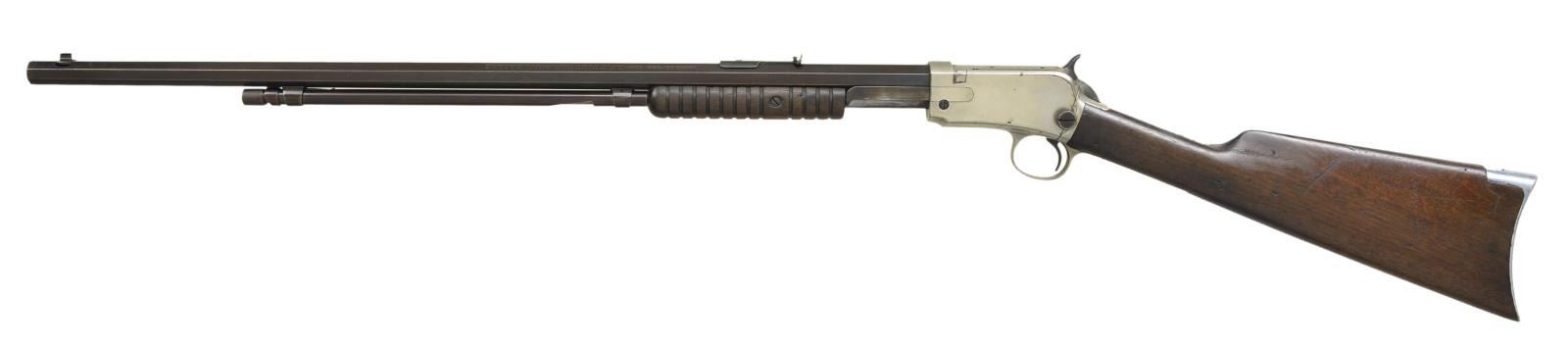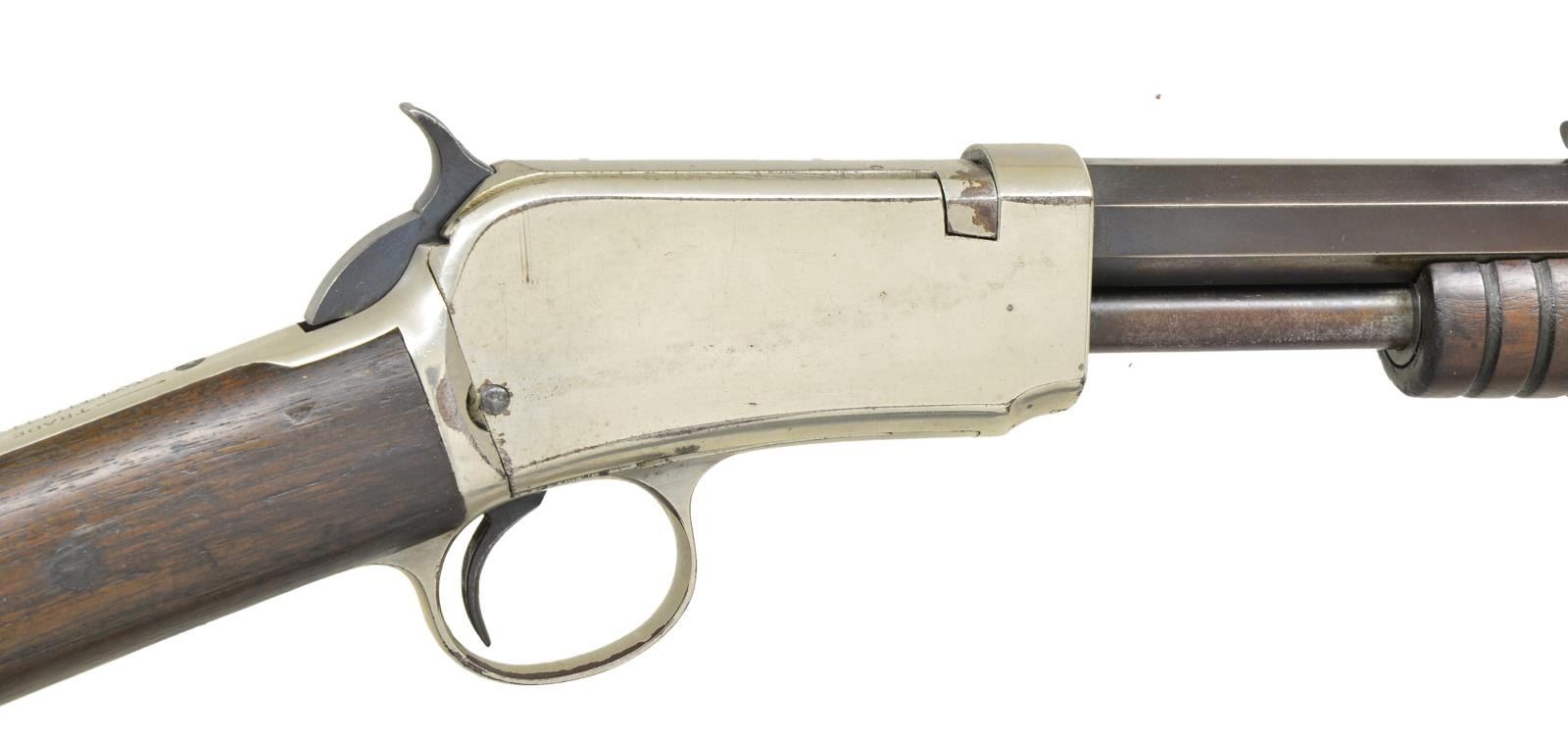Cal. 22 Short. S# 569146A. BBL. 24" octagon w/ M1890 sporting sights. Scarce & desirable nickel plated action & crescent steel buttplate. Grooved forend & straight grip walnut stock. Mfg. 1915. CONDITION: Bbl. & mag tube blue is turning brown showing slide wear. Action retains over 90% nickel showing small spots of loss, pin prick oxidation and small scratches. Wood has dark worn appearance showing dents & marks. Dark lightly pitted bore retains intact rifling. (22-1871/DS). CURIO. $2250-3000.