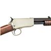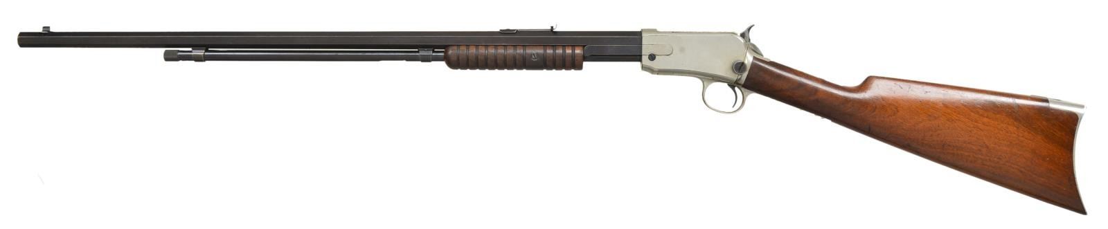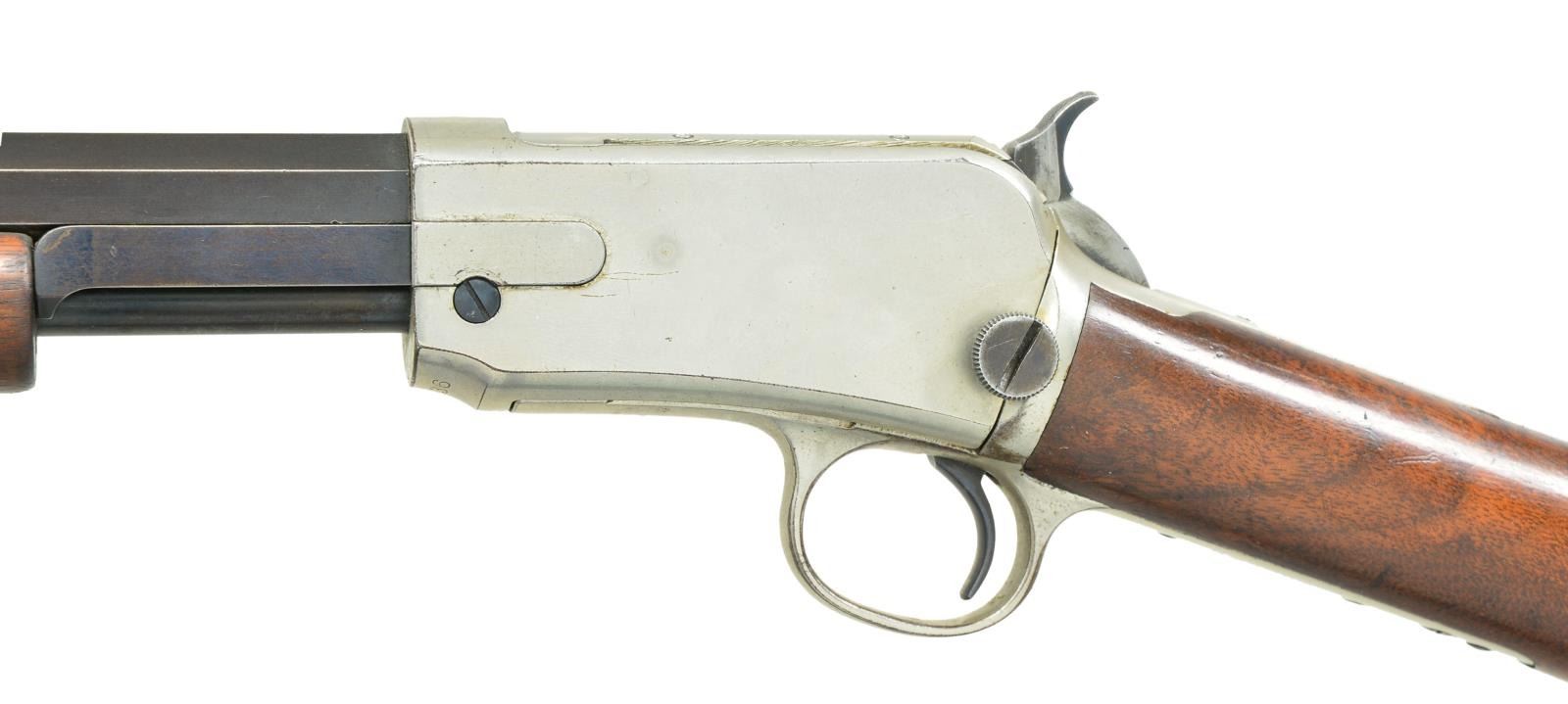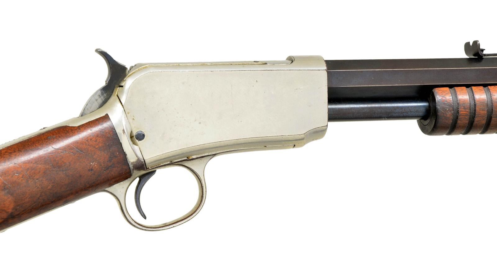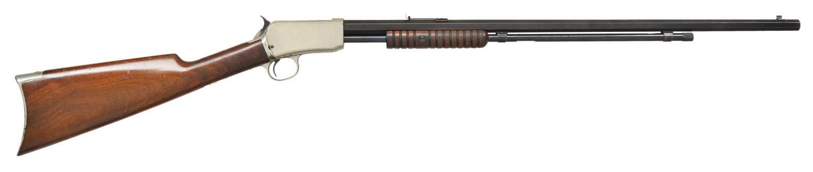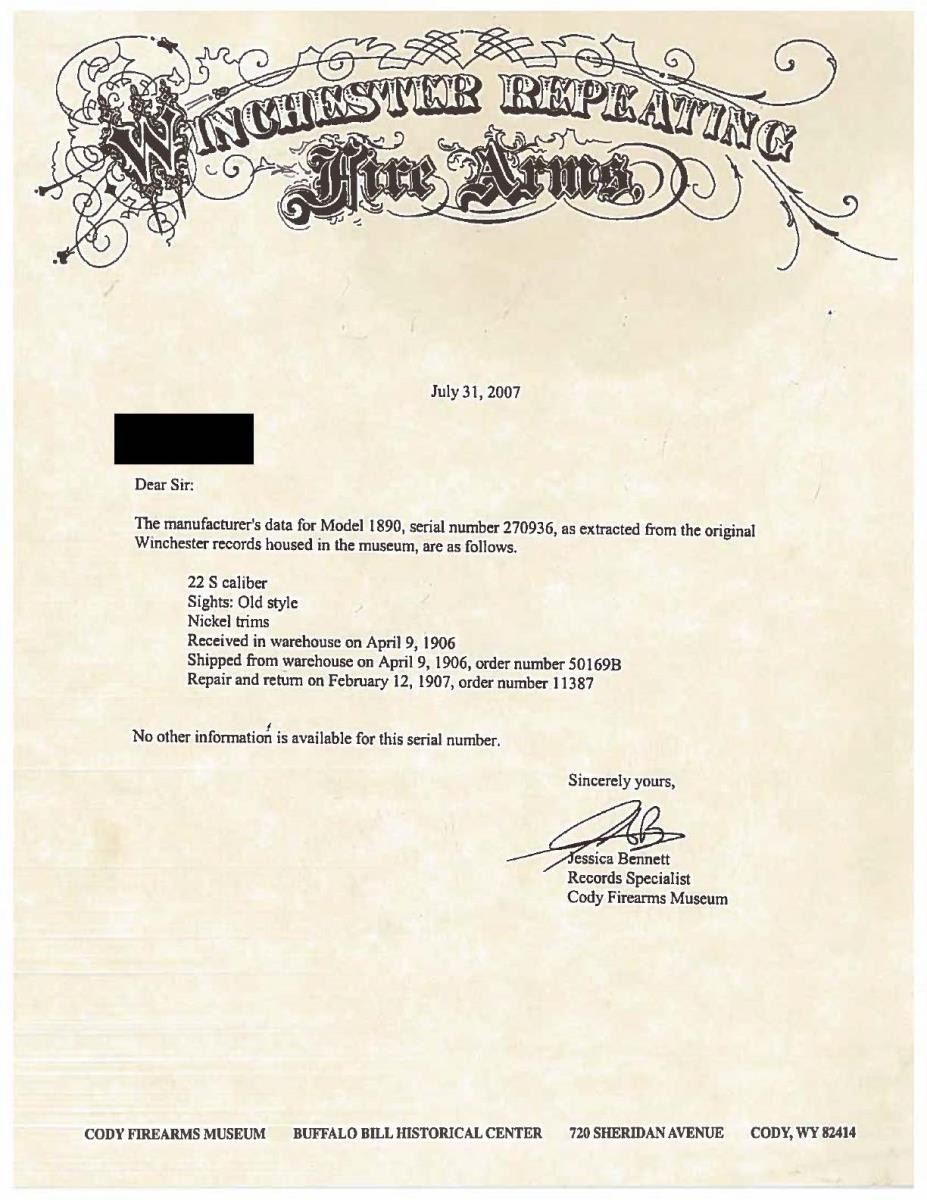 WITH FACTORY LETTER. Cal. 22 Short. S# 270936. BBL. 24" with M1890 sporting sights. Action and buttplate have nickel finish. Bbl. & mag tube are blued. Very late 2nd model with mortised breech block. Grooved forend & straight grip walnut stock. UNATTACHED ACCESSORIES: Cody firearms Museum letter stating the following; "22 S caliber / Sights: Old Style / Nickel trim / Received in warehouse on April 9, 1906 / Shipped from warehouse on April 9, 1906, order number 270936 / Repair & return on February 12, 1907." CONDITION: Action retains over 90% nickel. Buttplate has much of the nickel finish showing scattered spots of loss. Original bbl. & mag. tube blue shows wear and fading to brown. Original wood finish shows light wear and scattered handling marks .Lightly pitted bore has largely intact rifling. (22-1865/DS). CURIO. 3500-4500.