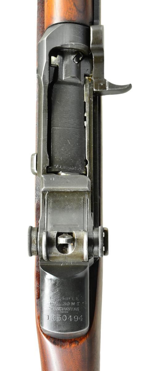 Cal. 30-06. S# 1350494. 24" bbl. stamped w/ Winchester proof & "4". Action has Winchester markings on rear, "Battle Range" sight & "WRA" marked bolt. Trigger group w/ milled guard is also marked "WRA", as is hammer & operating rod. Stock has "WRA" & ordnance marks on left side; "P" on grip. CONDITION: good as refinished. Metal w/ nearly all new blue finish showing high edge wear. Stock w/ heavy oil refinish, markings fairly weak. Shiny bore. Throat ga. is 1, muzzle ga. is 1.8. Mechanically good. PROVENANCE: From the estate collection of Charles P. Obremski. (22-1371/MGM). CURIO. $800-1,200.