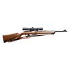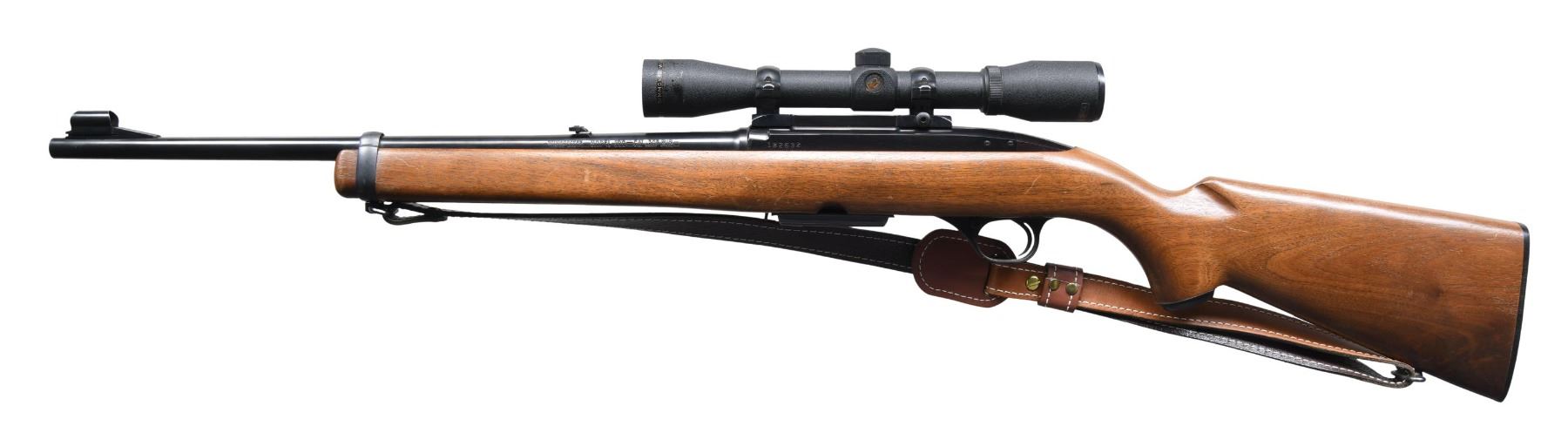 Cal. 308 Win. S# 182632. Bbl. 19", round. Hooded, ramp-bead front sight with folding leaf rear sight. Simmons Whitetail classic 4x32 matte-finished scope with a duplex reticle on Redfield mounts. Band-fastened walnut carbine stock with steel grip cap and plastic buttplate. Leather sling on the original swivels. Mfg. 1967. MAGS: 1 detachable 4-rd. CONDITION: 98% original blue. Stock has a lightly worn finish, showing numerous scratches and marks. Scope has clear optics. Very good, bright bore. (24-3156/DS). CURIO. $500-800.