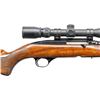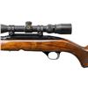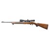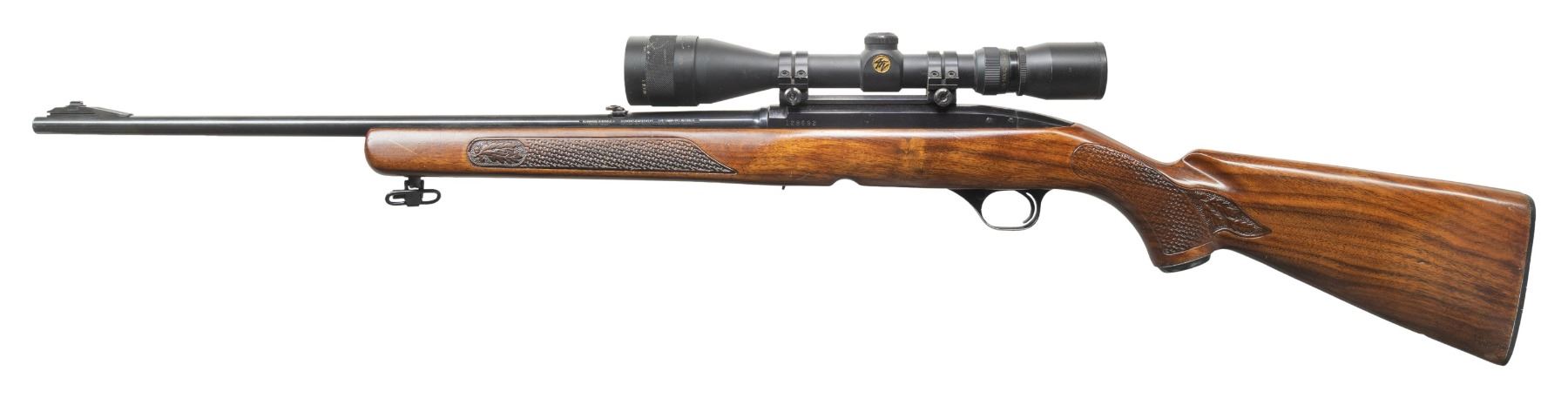 Cal. 308. S# 128592. Bbl. 21 1/2". Model 100 semi-automatic rifle mfg. by Winchester in 1965. Left side of the bbl. exhibits standard markings denoting the model and cal. designations. Metal components exhibit a blue finish overall, save for on the alloy trigger guard, which exhibits a black enamel type finish. Bolt assembly is polished in-the-white. 1-piece wood pistol grip stock, featuring woven pattern panels terminating in oak leaf and acorn carving at the forearm and wrist, with a blued steel grip cap and checkered black synthetic buttplate. Stock features an added layer of finish. Underside of forearm features an added sling swivel. Toeline of buttstock is cut for a sling swivel, which is absent. Ramped, dovetailed, and aluminum beaded blade front sight with dovetailed flip-up U-notch rear sight. Receiver features an added scope rail fitted with 2-rings, featuring a Simmons ATV (All Target Variable) 4.5-14x40mm WA / AO scope. Mag. is absent. CONDITION: metal components retain the majority of their original factory blue finish, exhibiting some light edge wear and superficial handling marks, with scattered spots of light to mild surface oxidation present overall. Bolt shows scattered spots of age related discoloration overall. Bright bore, exhibiting scattered spots and patches of light to mild pitting, while retaining well defined rifling throughout. Proper manual mechanics. Stock shows scattered marks and some impressions from handling and storage, but otherwise remains sound. Scope retains a clear and sharp optic. (25-5311/MLW). CURIO. $450-650.