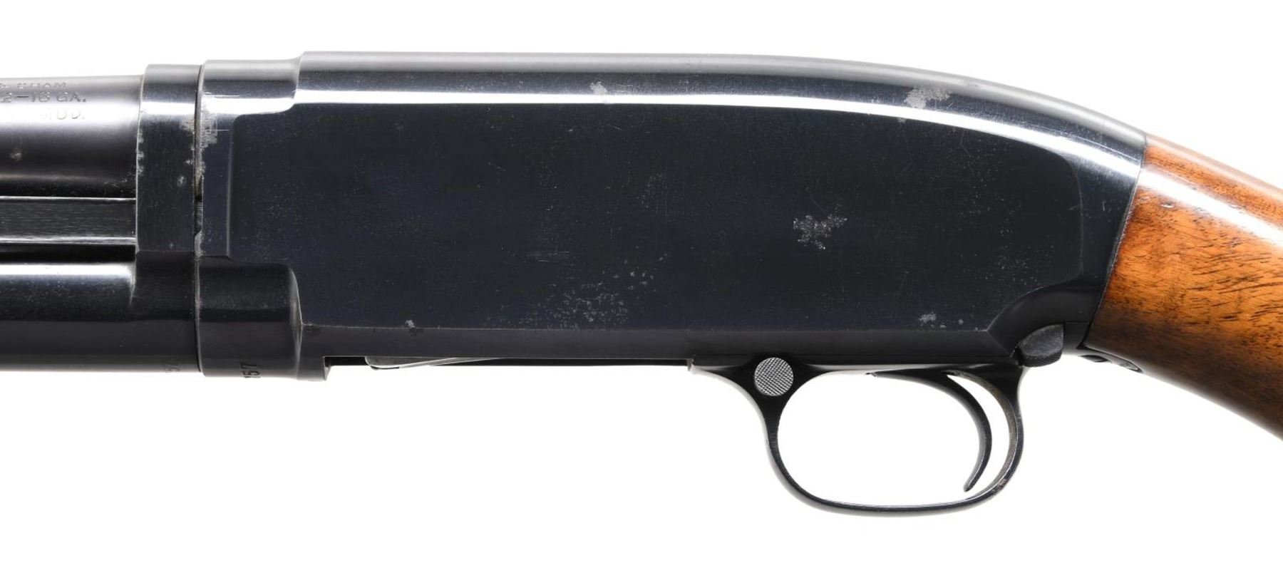 Cal. 16 GA. S# 846757. Bbl. 28". Model 12 pump-action shotgun, mfg. by Winchester in 1940. Left side of the bbl. is marked "WINCHESTER PROOF STEEL", followed by the Winchester trademark logo and "2 2/3" CHAM./ -MODEL 12- 16 GA./ MOD.", with Winchester's mfg. and patent information marked on the right. Metal components exhibit a blue finish overall, save for the bolt, which is polished "in the white." Plain wood pistol grip buttstock and grooved wood forend. Aluminum bead front sight. Matching numbers are present on the receiver and bbl. CONDITION: metal components retain the vast majority of their original factory blue finish, exhibiting few spots of light wear and thinning, with scattered light to mild surface oxidation present overall. Mirror bore. Wood furniture shows some scattered marks and minor impressions from handling and storage, but otherwise remains sturdy and serviceable. (24-2033/MLW). CURIO. $400-600.