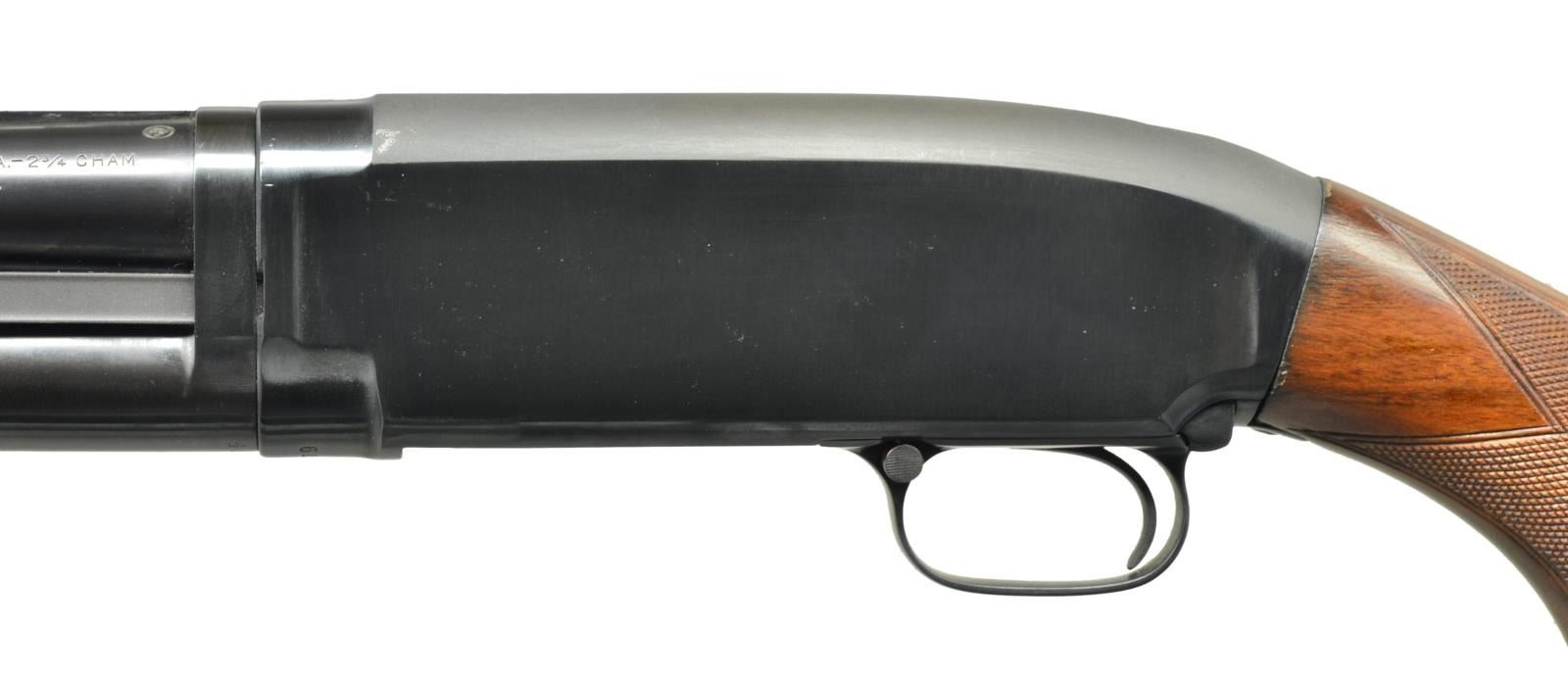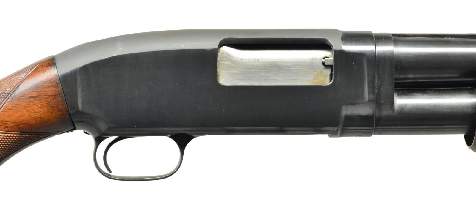 Cal. 12 Ga., 2 3/4". S# 928679. Bbl. 26" proof steel w/ solid rib & factory cyl. choke. Red target front sight w/ steel mid bead. Checkered beavertail forearm & uncapped pistol grip checkered stock. LOP: shortened to 13 1/8" over aftermarket Hawkins red ventilated pad. Mfg. 1942. CONDITION: 98% nicely reblued metal finish. Original forearm finish shows numerous dents, scratches & handling marks. Stock has very good refinish w/ freshened checkering. Good mechanics. Headspace ring has taken up two notches. Nice bright bore. (21-2268/DS). CURIO. $500-750.