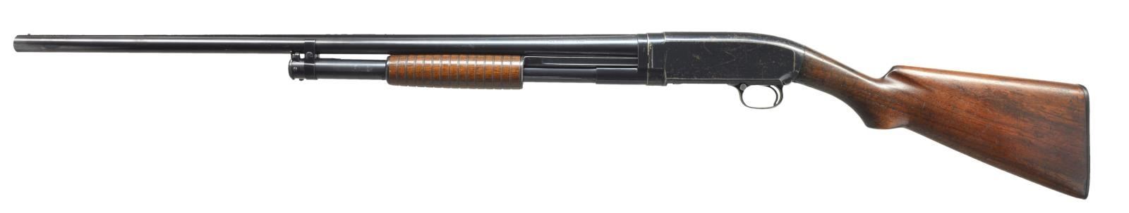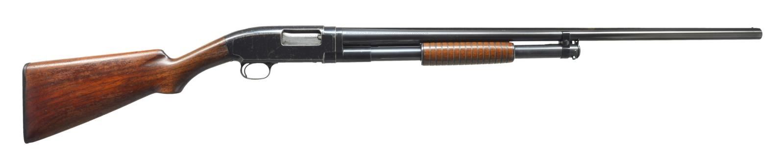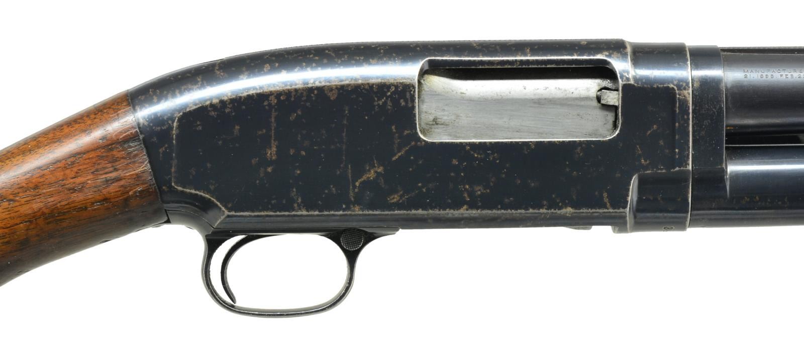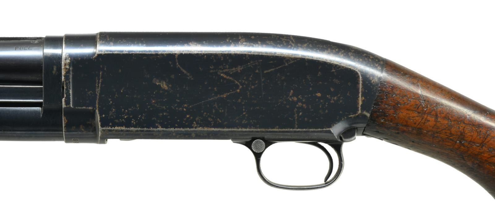 Cal. 16 Ga. S# 344689. Bbl. 28" of Nickel Steel w/ solid rib. Fixed Full choke & steel bead. Sm. rnd. grooved forearm & early style pistol grip stock. LOP: is shortened to 13 1/2" w/ reattached buttplate. 1923 Mfg. CONDITION: bbl. & mag. tube retain 90% blue showing slide wear & sm. spots of freckling. Receiver retains 70% blue mixing w/ spots of flaking. Forearm has good original finish showing sm. marks. Stock has added finish over peeling original finish showing numerous scratches, marks & sm. dents w/ sm. chips around trigger guard tang. Very good bright bore. (21-1971/DS). CURIO. $400-600.