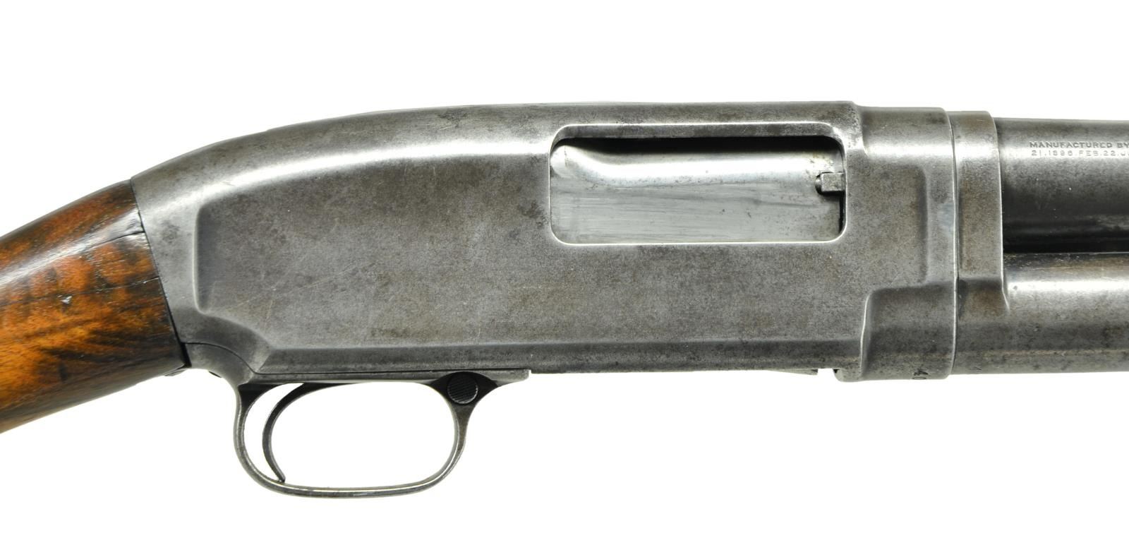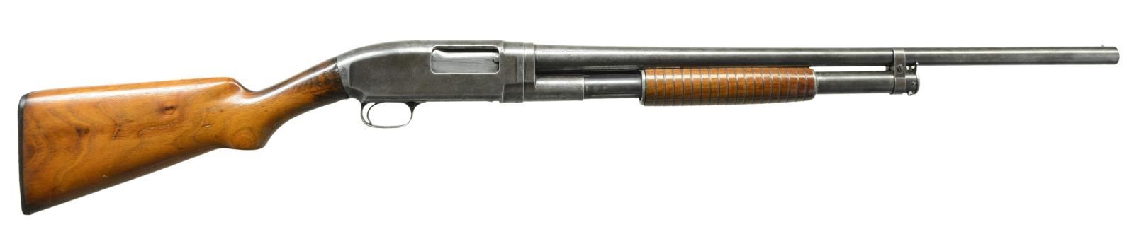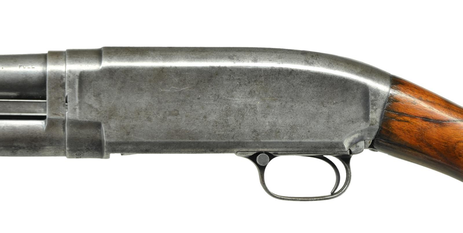 Cal. 12 Ga. S# 406516. Bbl. is nickel steel plain cut to 25 3/4". Original choke marking was full. Steel bead. Sm. rnd. grooved forend. Early style half pistol grip stock. LOP is shortened to 13 1/8" over replacement Winchester buttplate. Mfg. 1925. CONDITION: Metal has faded to gray showing scattered light pitting. Forearm has good refinish. Heavily sanded & refinished stock is undersized at action w/ several cracks extending from receiver. Hammer will drop before action is locked, must be repaired to be safe. All adj. is taken up on take down ring. Good, bright bore. (21-1997/DS). CURIO. $400-600.