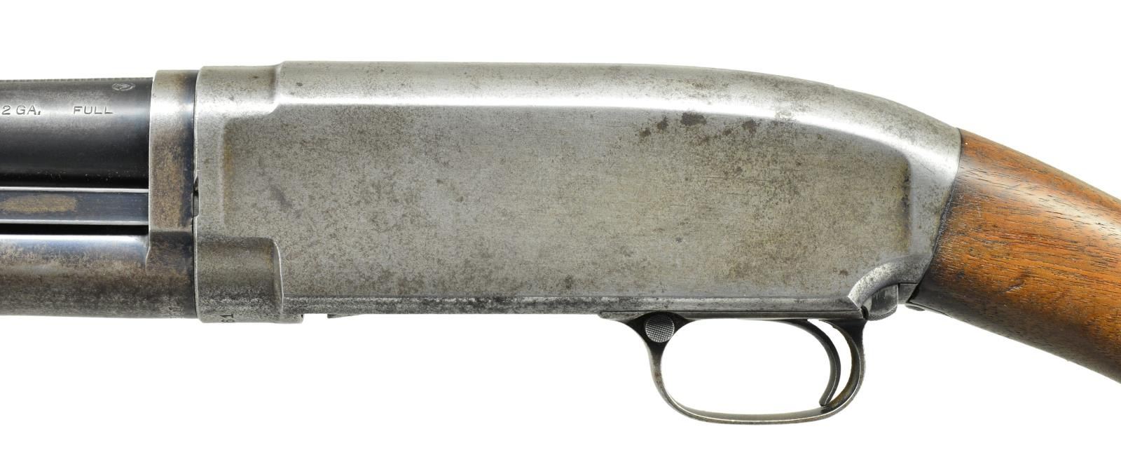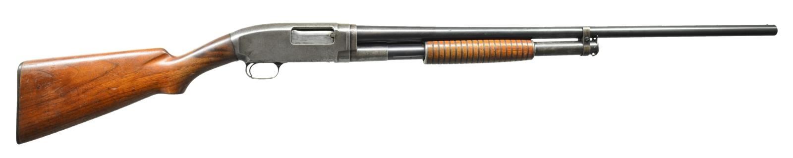 Cal. 12 Ga. S# 478561. Bbl. 30" of nickel steel w/ added full length matting. Fixed Full choke & steel bead. Sm. rnd. grooved forearm & early style pistol grip stock. LOP: 13 5/8" over original buttplate. 1927 Mfg. CONDITION: receiver & extension have faded to gray showing corrosion & scattered light pitting. Bbl. & mag. tube retain 80% lightly worn blue. Wood has worn finish w/ numerous scratches & marks. Bore shows spots of very light pitting. (21-2181/DS). CURIO. $300-400.