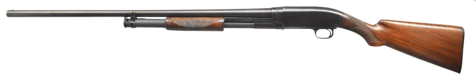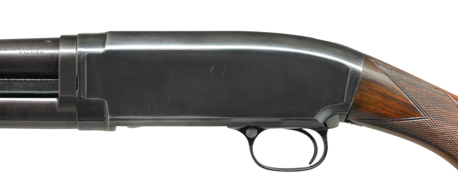 Cal. 16 Ga., 2 3/4". S# 532639. Bbl. 28" w/ added full length matting. Fixed Mod. choke & steel bead. Replacement sm. rnd. forearm of fancy walnut w/ 2 panel Tournament style checkering. Early style pistol grip walnut stock w/ added Tournament style checkering. LOP: 13 1/2" over replacement buttplate. CONDITION: bbl. & action have dull faded reblued finish w/ slight plum cast on bbl. Mag. tube has matte finished reblue. Stock & forearm have good finish. Stock is broken at toe w/ a 2 3/4" added wood repair & has sm. chips around trigger guard tang. Good bright bore. Action shows considerable wear. (21-2012/DS). CURIO. $400-600.