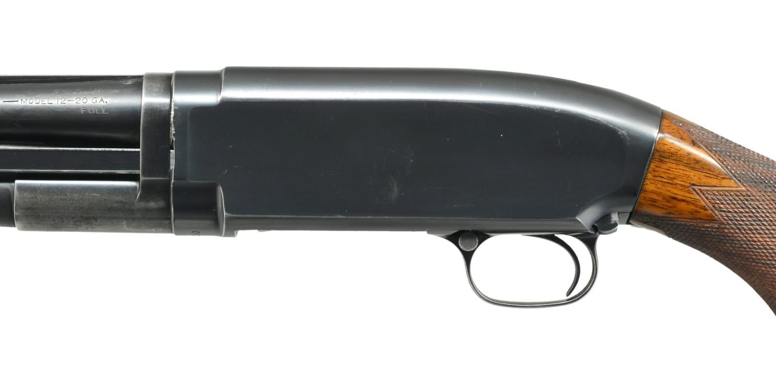 Cal. 20 Ga., 2 3/4". S# 750150. Bbl. 28" of Winchester Proof Steel & solid rib. Fixed Full choke. Brass & white front sight w/ white mid bead. Custom sm. rnd. forearm of fancy walnut w/ Trap grade style wrap around hand checkering. Pistol grip walnut stock has added warp around hand checkering w/ contrasting flared grip cap. LOP: 13 7/8" over Win. buttplate. 1937 Mfg. CONDITION: Over 80% dull lightly faded blue showing slide & carry wear w/ take up scratches on receiver. Stock & forearm have very good refinish. Head space ring has 1 notch taken up. Good bright bore. (21-2051/DS). CURIO. $400-600.