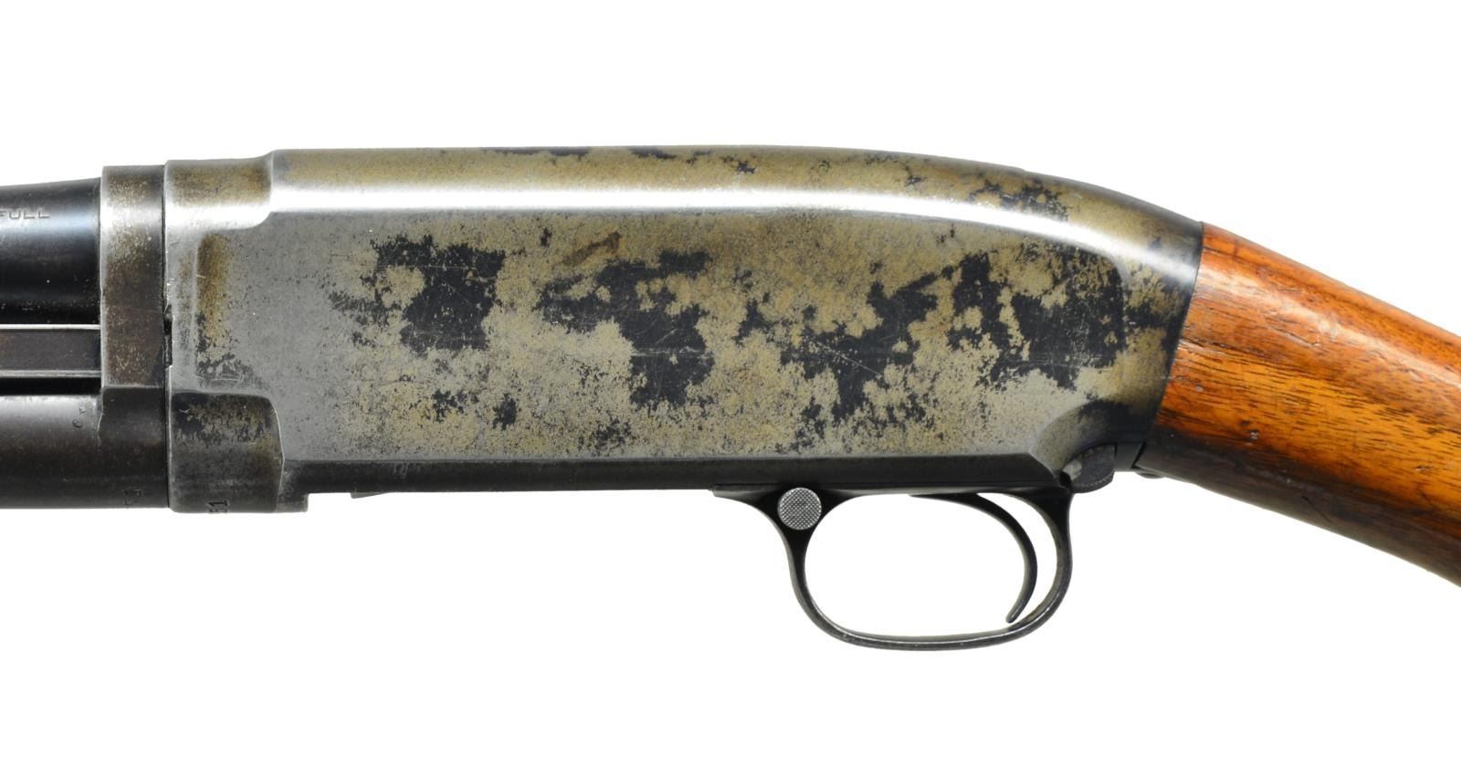 Cal. 20 Ga. 2 3/4". S# 1770899. Bbl. 28" of proof steel w/ solid rib & white target front sight. Fixed full choke. Breech bolt has added machine jeweling. Beavertail forearm & straight grip stock of fancy walnut w/ target style checkering. LOP measures 13 1/8" over a replacement buttplate & 1 1/2" wood spacer. Mfg. 1959. CONDITION: 70% fading blue showing spots of freckling & light corrosion. Wood has worn finish showing scratches & marks. Good mechanics. Bore is generally bright showing some fouling. (21-2280/DS). CURIO. $400-600.