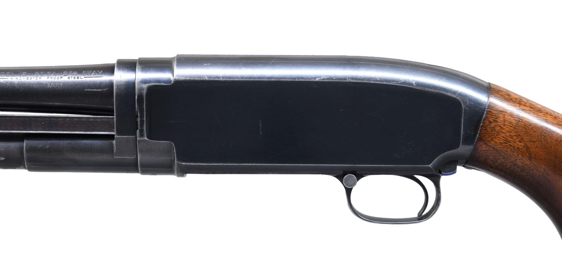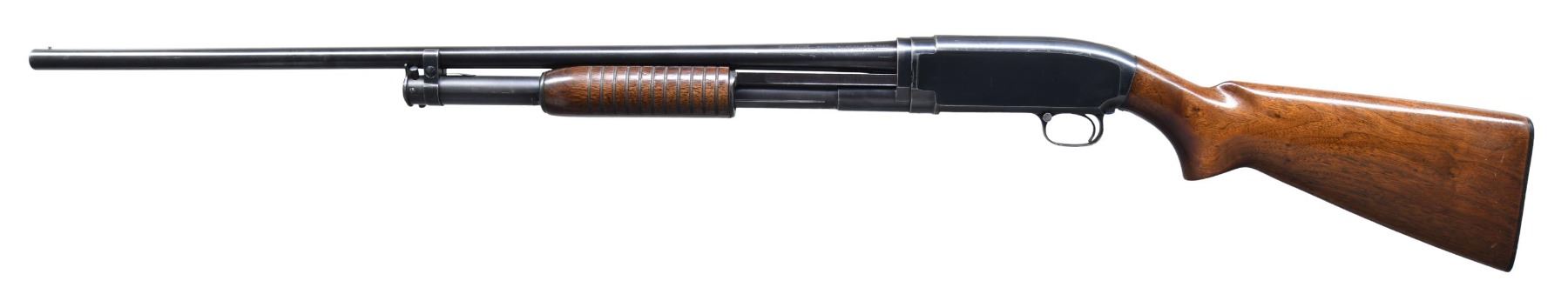 Cal. 20 ga. 2 3/4". S#. 1449964. Bbl. 28" plain w/ fixed Mod. choke & steel bead. Flat bottom grooved forearm & pistol grip walnut stock. LOP: 14" over original buttplate. Mfg. 1954. CONDITION: over 80% lightly worn blue showing edge & carry wear. Wood has added finish over scratches & marks w/ a small chip right of action. Sound mechanics. Very good bright bore. (25-954/DS). CURIO. $500.-800.