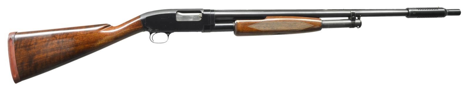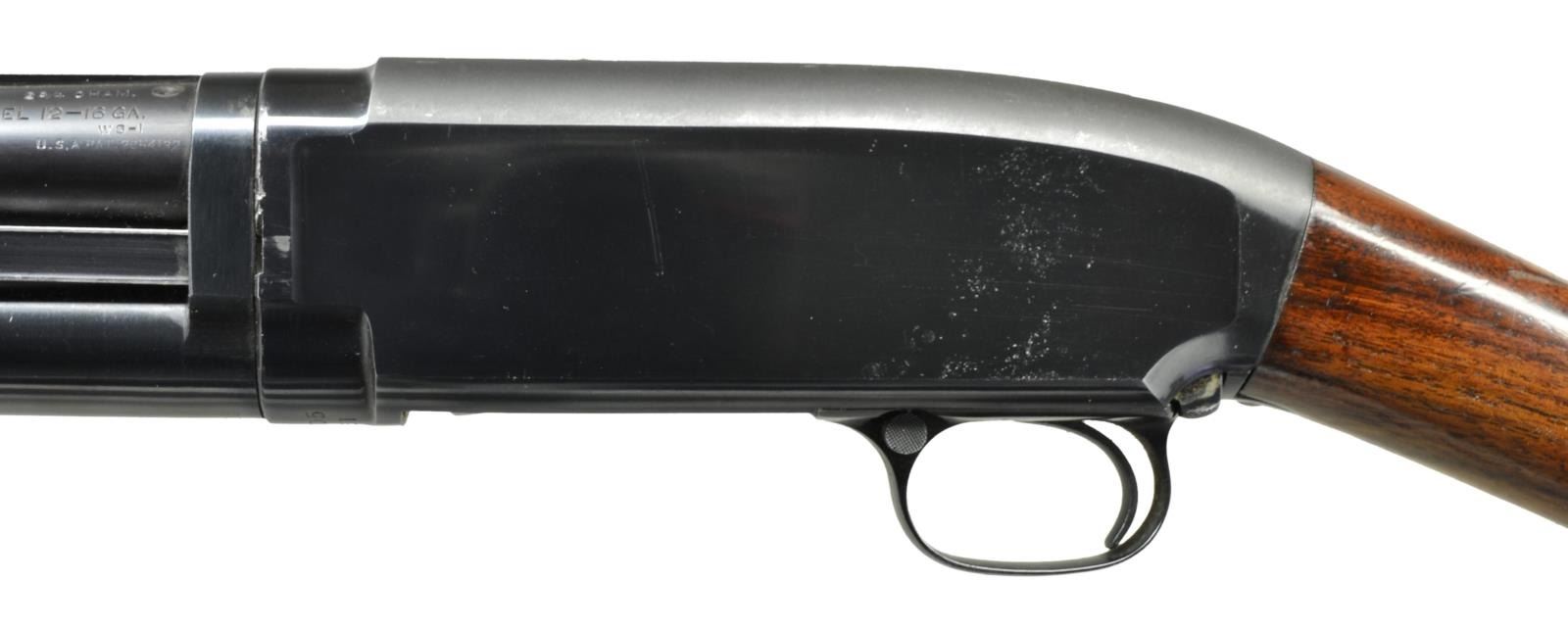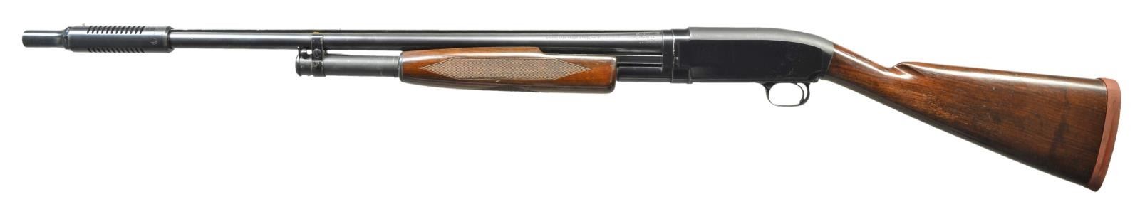 Cal. 16 Ga., 2 3/4". S# 816705. Bbl. proof steel solid rib bbl. is shortened to 27 1/4" over an aftermarket Cutt's Compensator w/ Mod tube. Steel front & mid beads. Receiver below S# is marked "SKEET". Original checkered beavertail forearm. Field stock altered to straight grip. Stock is shortened to LOP: 14" over an added Jostam pad. 1940 Mfg. CONDITION: over 85% original blue showing slide wear w/ scratches, takedown marks & spots of finish loss on receiver. Forearm has lightly worn original finish & checkering showing handling marks. Stock has touched up finish in wrist area showing scratches & handling marks. Very nice bright bore. (21-2266/DS). CURIO. $400-600.