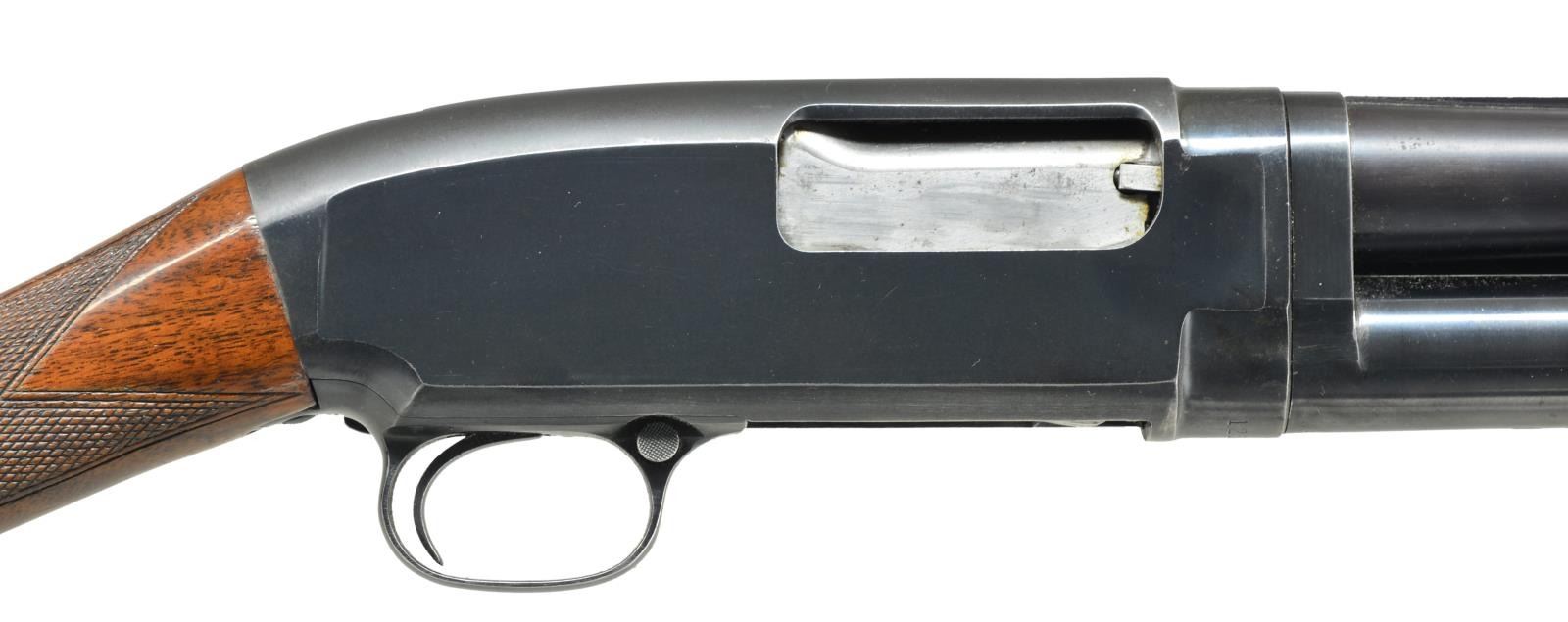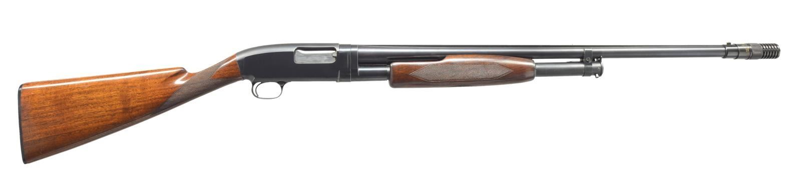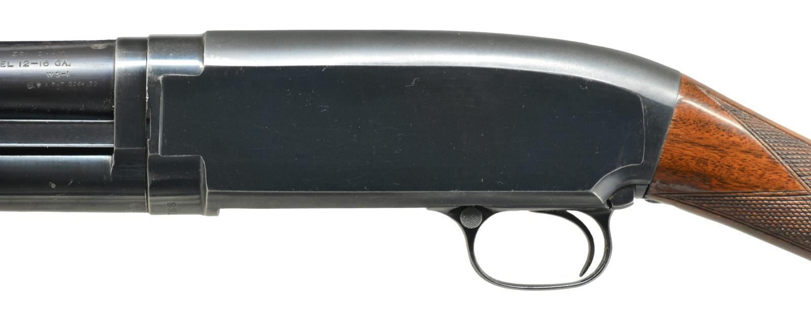 Cal. 16 Ga., 2 3/4". S# 1236788. Bbl. w/ solid rib shortened to 27 1/4" over aftermarket Poly-Choke. Original choke marked "WS-1". Brass target front sight w/ steel mid bead. Beavertail forearm & straight grip walnut stock w/ factory checkering. LOP: 13 7/8" over original buttplate. 1950 Mfg. CONDITION: over 80% lightly faded blue showing carry & slide wear. w/ scattered handling marks. Stock & forearm have lightly worn original finish showing scattered scratches & marks. Good bright bore. (21-2080/DS). CURIO. $400-600.