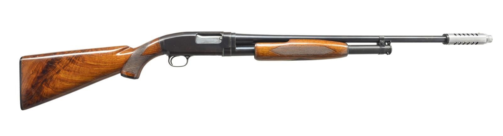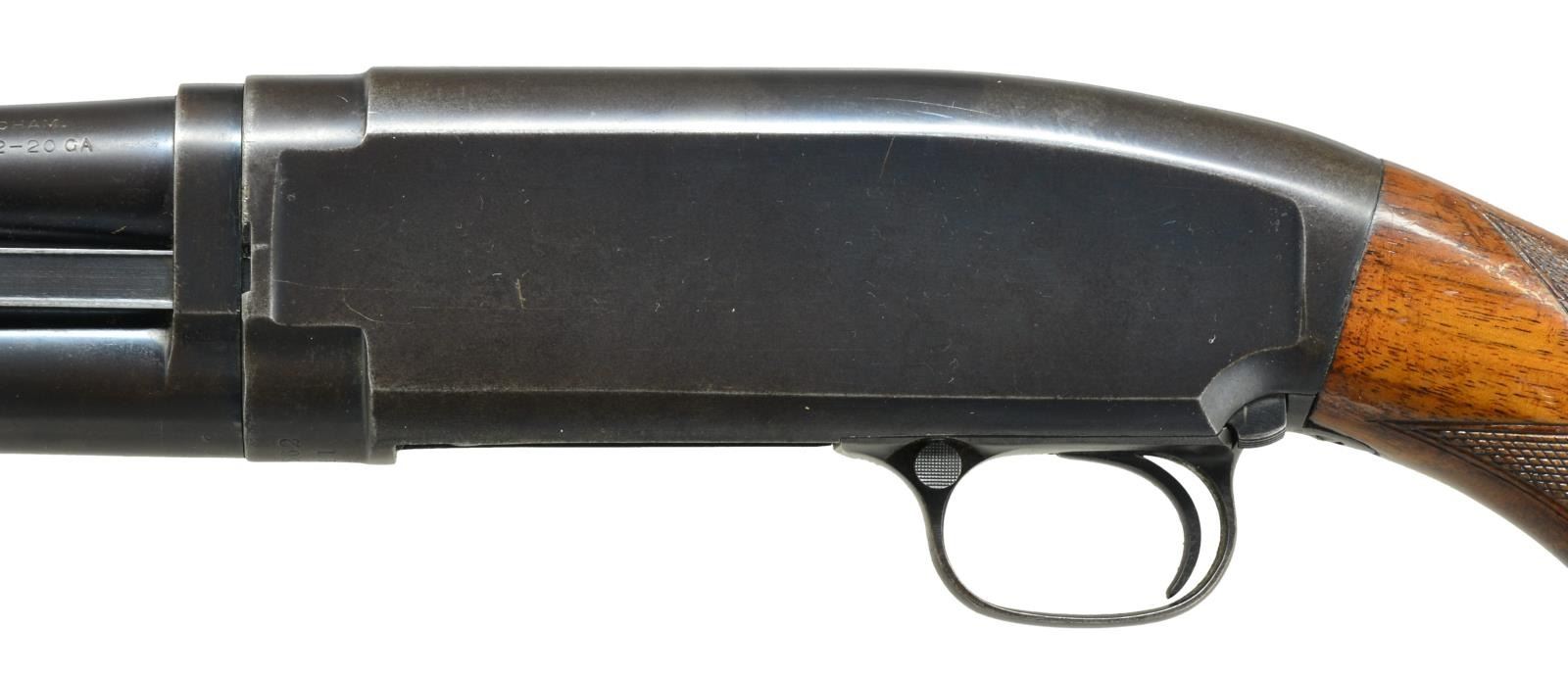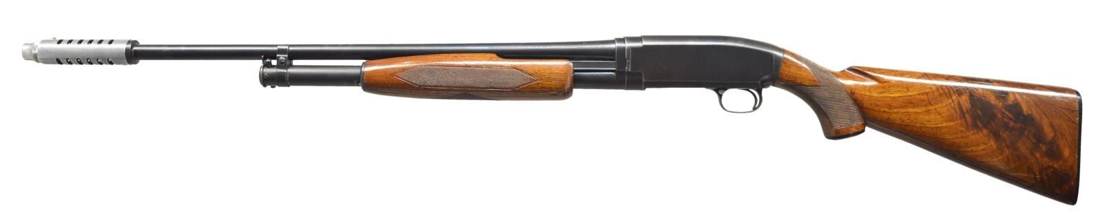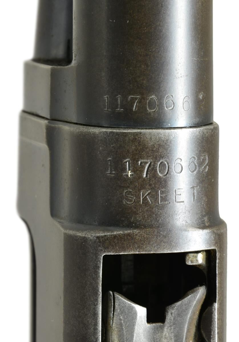 Cal. 20 Ga., 2 3/4". S# 1170662. Bbl. plain, 26" over factory installed Cutt's Compensator w/ spreader tube (no factory choke marking). Steel bead. Receiver below S# stamped "SKEET". Beavertail forearm & hard rubber capped checkered Skeet style of fancy walnut. LOP: 14" over original buttplate. 1948 Mfg. CONDITION: 70% dull fading blue showing slide & carry wear w/ spots of freckling. Refinished stock & forearm show moderately worn checkering w/ numerous scratches, dents & marks. Good bright bore. (21-2428/DS). CURIO. $450-650.
