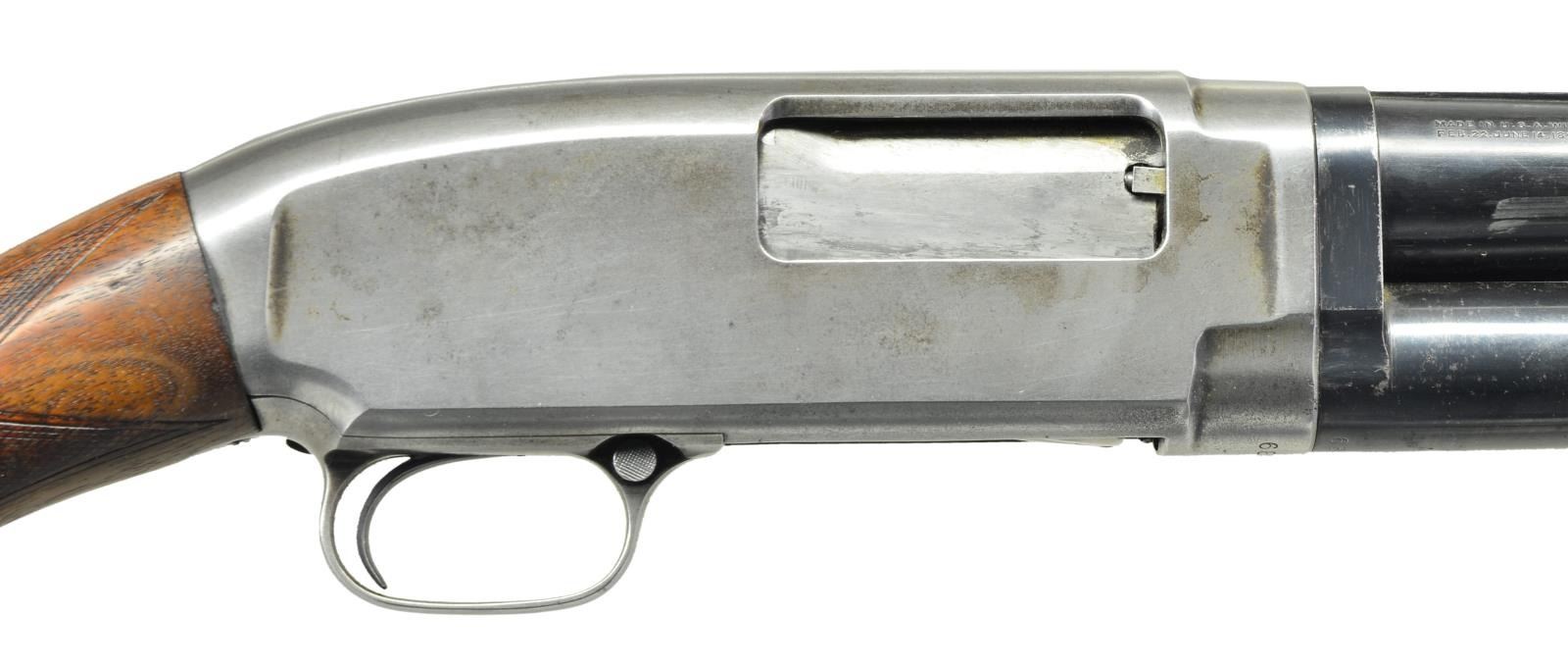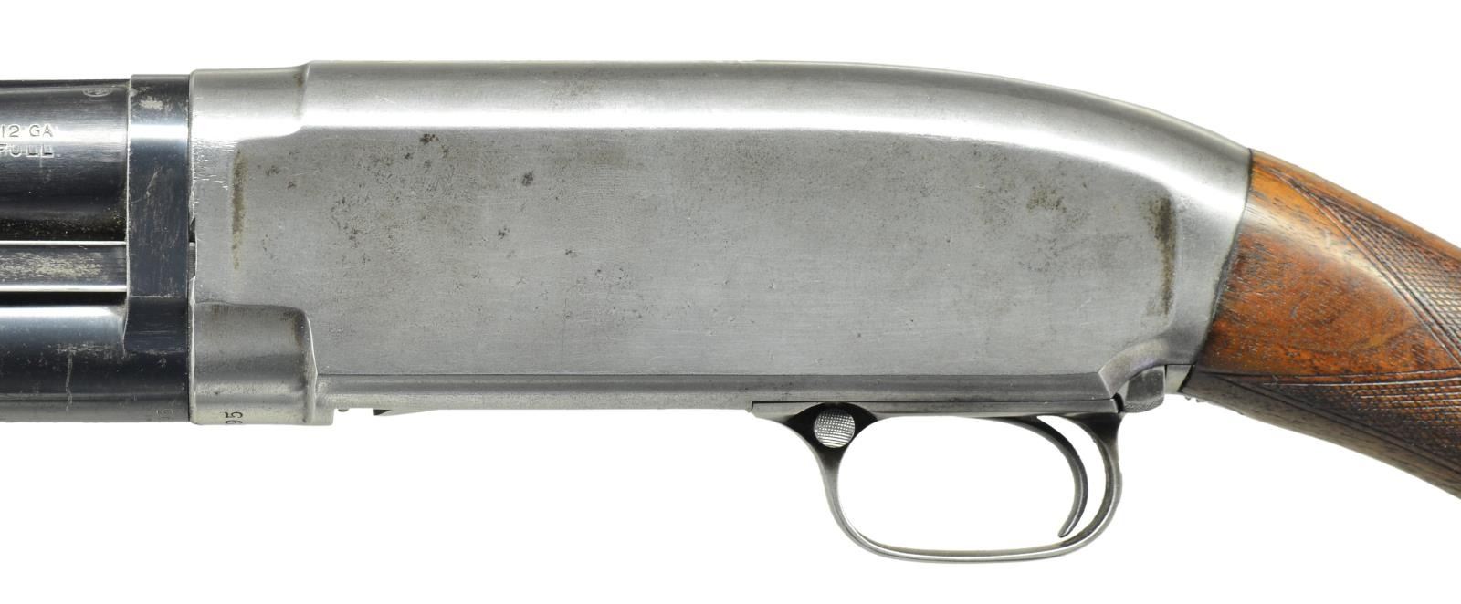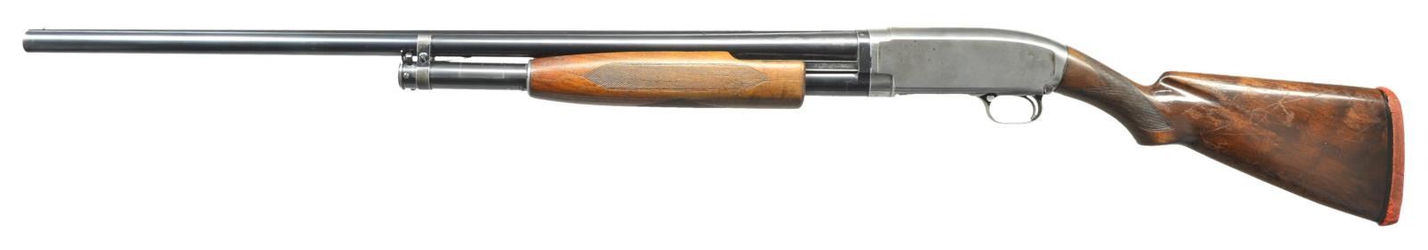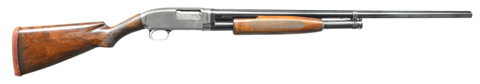 SHOTGUN. Cal. 12 Ga., 2 3/4". S# 684795. Bbl. 30" of proof steel, solid rib, steel bead & fixed Full choke. Receiver extension is marked "STANDARD TRAP". Factory checkered walnut beavertail forearm. Early style pistol grip stock w/ factory trap checkering. Stock is shortened w/ LOP: 14 3/8" over a unmarked solid red pad. 1935 Mfg. CONDITION: bbl. & mag. tube assembly retain 70% lightly faded blue. Action has faded to gray showing spots of corrosion. Wood has worn finish & checkering w/ numerous scratches & marks. Recoil pad is age hardened & cracked. Head space ring is taken up 2 notches. Bore shows some very light darkening. (21-2077/DS). CURIO. $400-600.