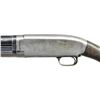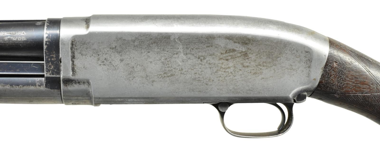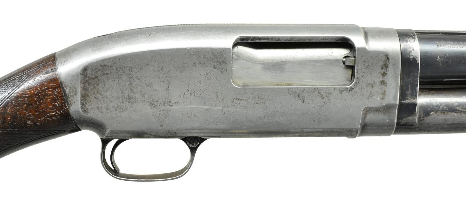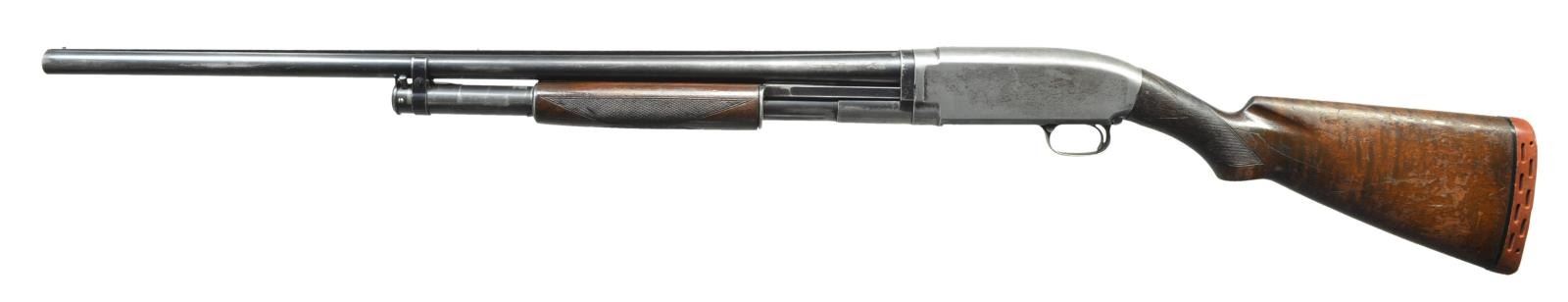SHOTGUN. Cal. 12 Ga. S# 678160. Bbl. 28" Nickel Steel w/ solid rib & fixed Mod choke. Steel front bead w/ brass mid bead. Receiver extension marked "STANDARD TRAP". Sm. rnd. forearm w/ trap style wrap around checkering. Early style pistol grip stock w/ factory checkering. LOP is 14 3/8" over an aftermarket Jostam pad. Mfg. 1944. CONDITION: bbl. & mag. tube retain 70% fading blue showing spots of corrosion. Action finish has faded to gray. Original wood finish shows heavy wear w/ numerous scratches & marks. Stock has cracks & chips around action. Good mechanics. Headspace ring is taken up 2 notches. Bore shows some light pitting. (21-2335/DS). CURIO. $400-600.