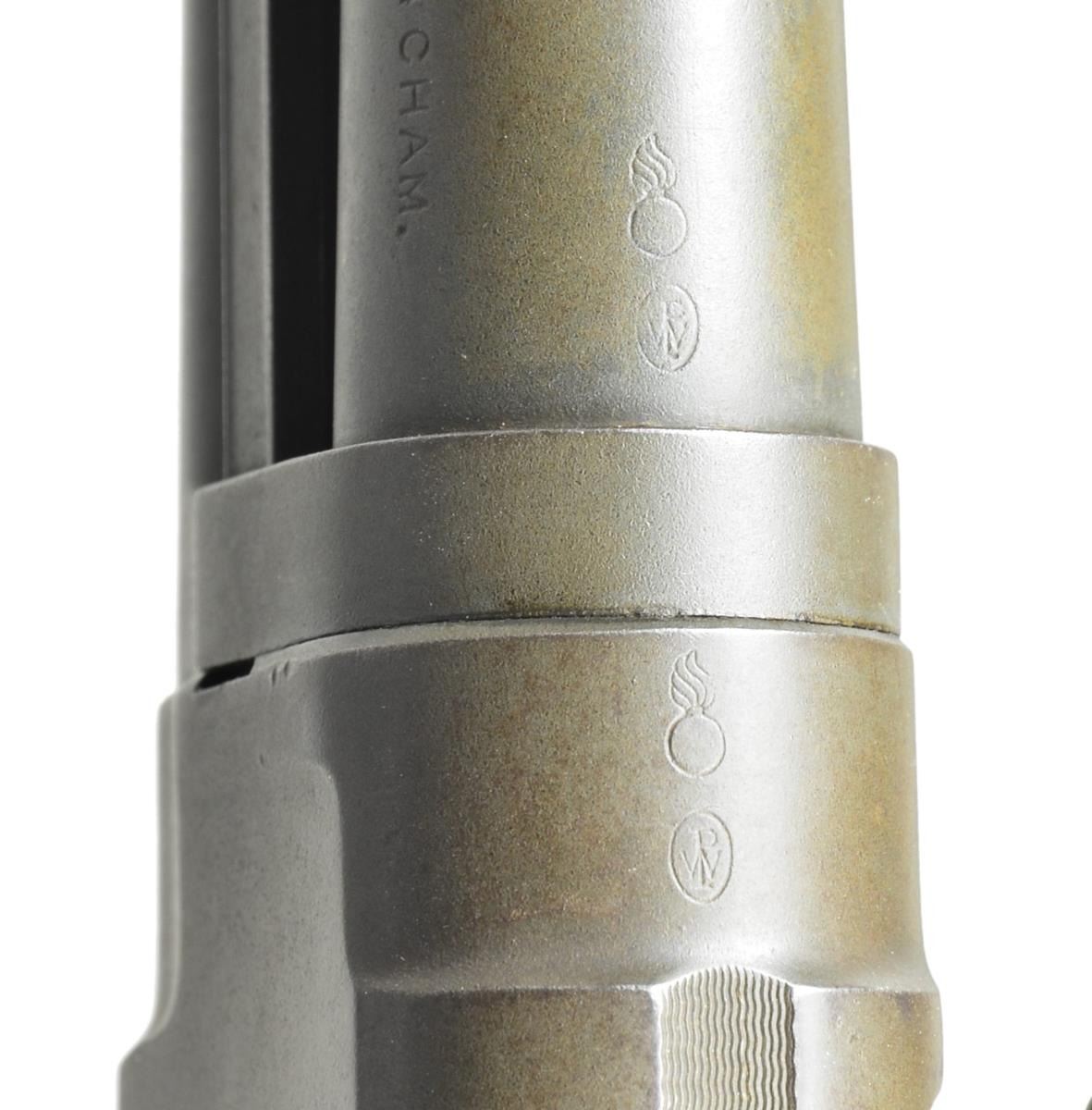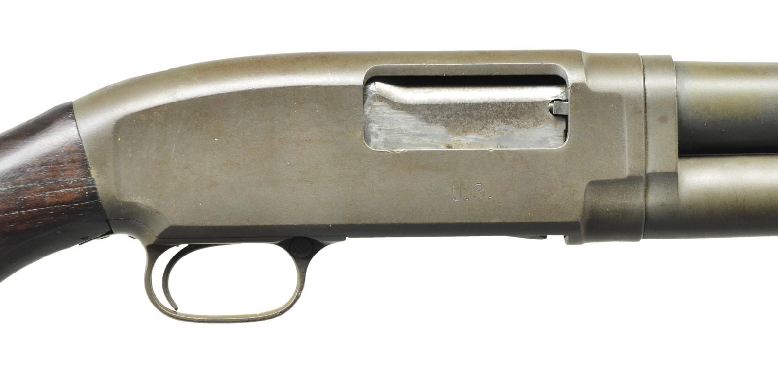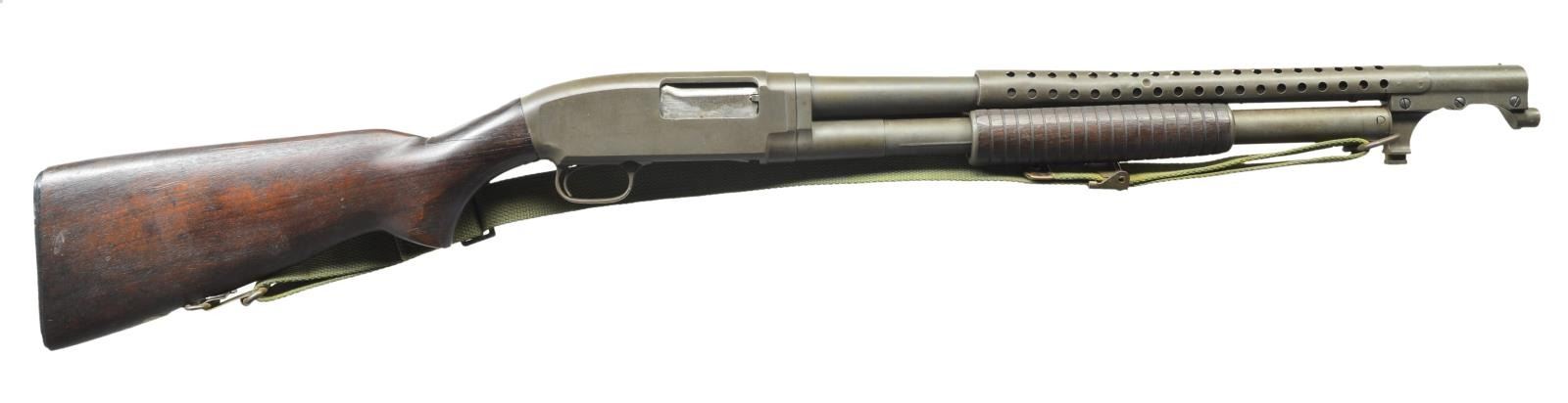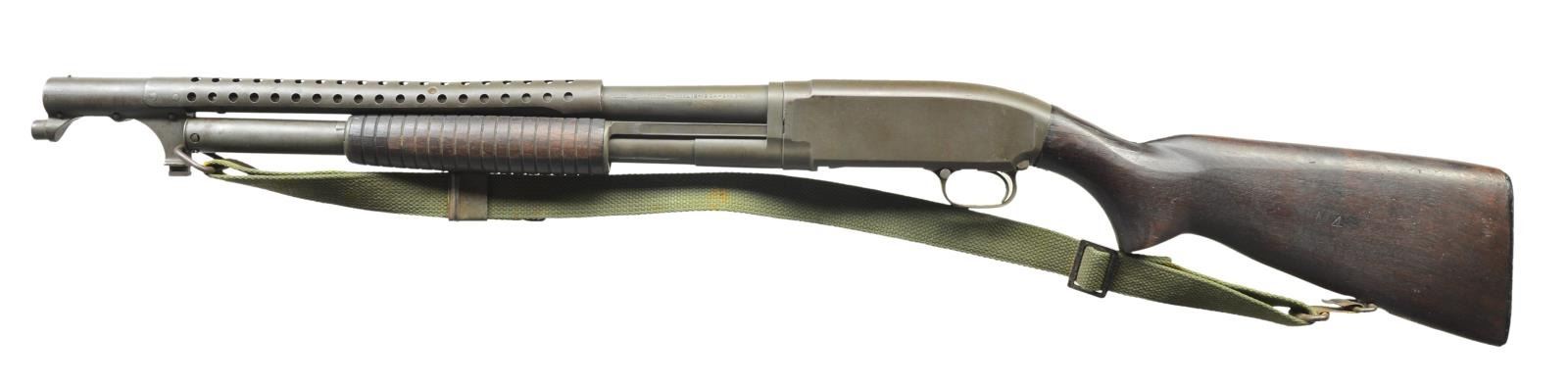 Cal. 12 Ga. 2 3/4". S# 958676. Bbl. 21" cyl. bore w/ 4 row handguard & bayonet lug. WWII production w/ parkerized finish. Top of bbl. & receiver have flaming bomb ordnance acceptance marks. Right side of frame marked "U.S.". Sm. rnd. grooved forearm & pistol grip stock w/ replacement buttplate. Stock shows some reshaping. Left side stamped "US" over "A4". Toeline has white painted "9". Web sling on original swivels. CONDITION: 80% dull lightly worn, parkerized finish. Wood has dark stain appearance showing reshaping w/ chips & cracks at head. Sound mechanics. Bright, near excellent bore. (22-313/DS). CURIO. $2,000-3,000.