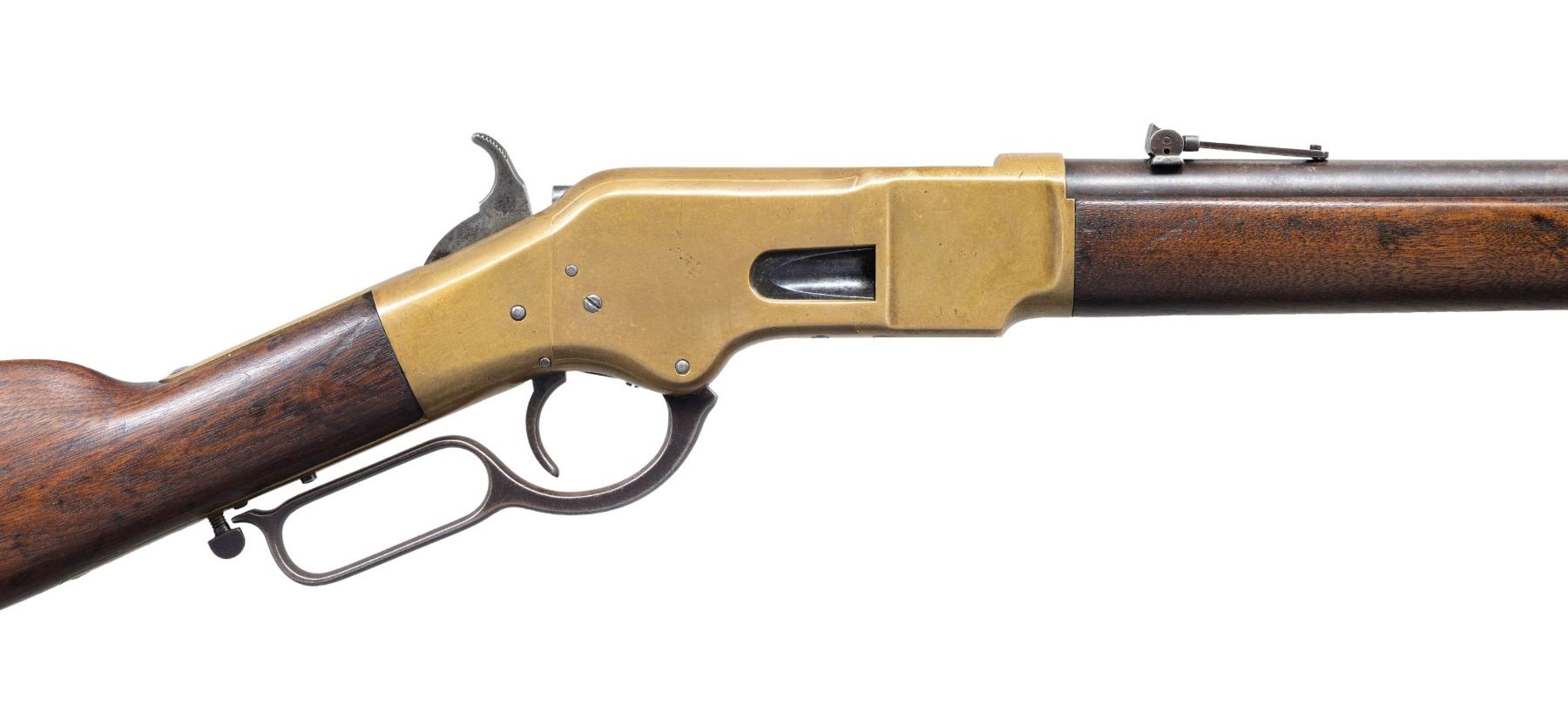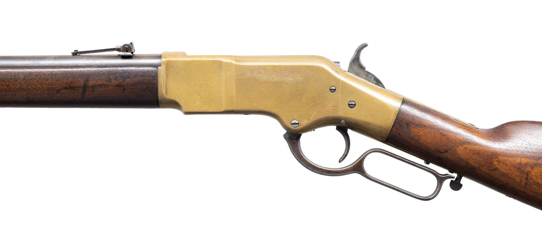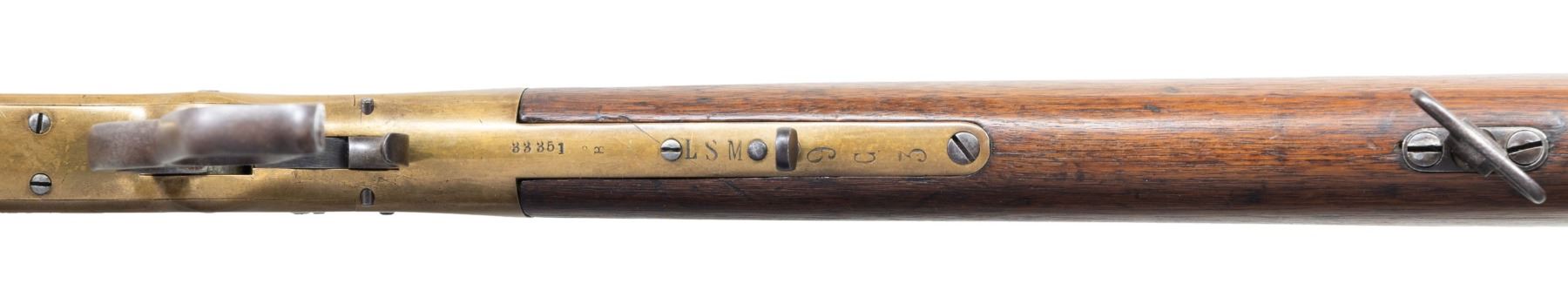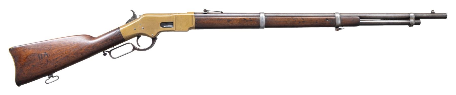 MARKED LEVER ACTION MUSKET. Cal. 44 HRF. S# 33351. "The Battle of Liberty Place" happened on the streets of New Orleans on September 14 of 1874. Also known as The Battle of Canal Street it was a defining event in the post Civil War reconstruction period. The Democratic Conservative White League attacked the Republican Metropolitan Police for control of the city to end reconstruction in Louisiana. Thousands of citizens marched up Canal Street and were met with 500 Metropolitans and their Winchester repeaters. Shots were exchanged and the Metropolitans and police allies retreated leaving behind numerous Model 1866 repeaters. This rifle has markings consistent with the Model 1866 repeaters that were seized by the insurgents. The White League defeat deposed Government William Pitt Kellogg. The victory was short lived as President Ulysses S. Grant ordered the army to reinstate Kellogg three days later. Bbl. 27" rnd. with blade front sight and folding leaf rear sight. 7/8 length mag. tube. Brass action. Lower tang is marked "LSM" for the Louisiana State Militia, followed by rack # "9C3". 2-band fastened walnut forearm and straight grip stock with brass trapdoor musket buttplate and sling swivels. UNATTACHED ACCESSORIES: information pertaining to the Battle of Liberty Place. CONDITION: bbl. finish has faded to mottled gray showing some very light pitting. Brass shows evidence of cleaning and is reacquiring a mild patina showing scratches and marks. Heavily sanded and refinished wood shows scratches, dents, and marks, with initials "HA" cut into the right side. Sound action. Lightly pitted bore retains intact rifling. PROVENANCE: The Esteemed Norm Greenberg Collection. (01-27713/DS). ANTIQUE. $7,000-10,000.