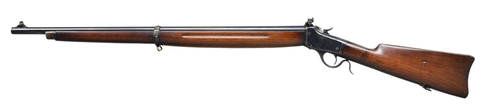 Cal. 22 Short. S# 127862. Bbl. 28". “US/FLAMING BOMB” marked on upper tang. Blade front w/ Lyman receiver sight attached right side. Perch belly finger groove forend w/ Bbl. band & forend cap. Straight grip smooth buttstock w/ sling swivel. CONDITION: metal retains about 80% blue with gray/brown buttplate, fading finish on band & cap, w/ light rust left side receiver. Stock set has an added coat of finish over a gouge left side butt. Bore has visible but worn rifling & light pitting but remains shiny. (22-5995/CW). CURIO. $700-900.