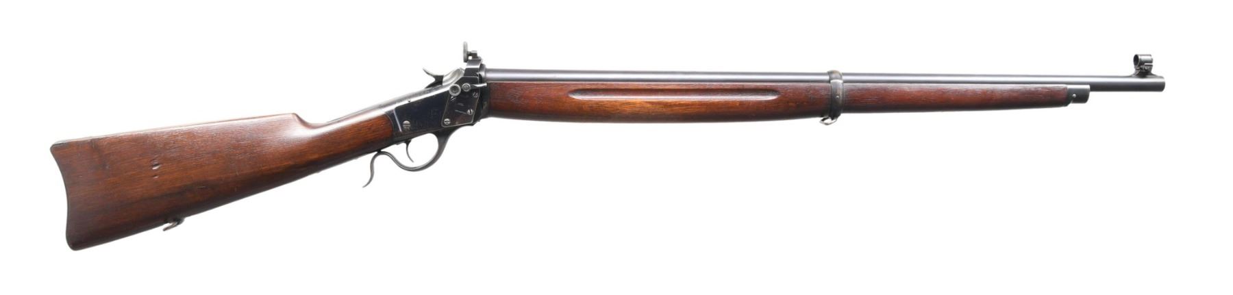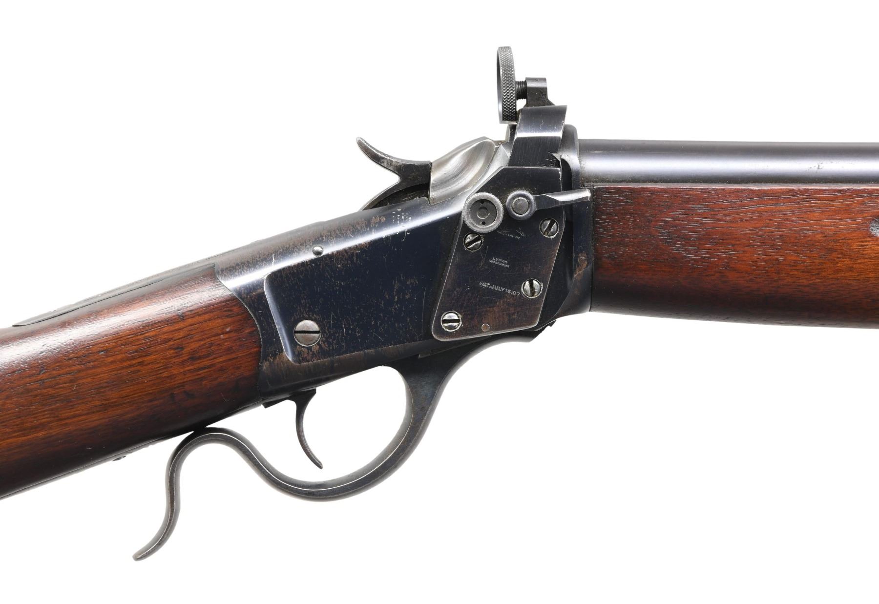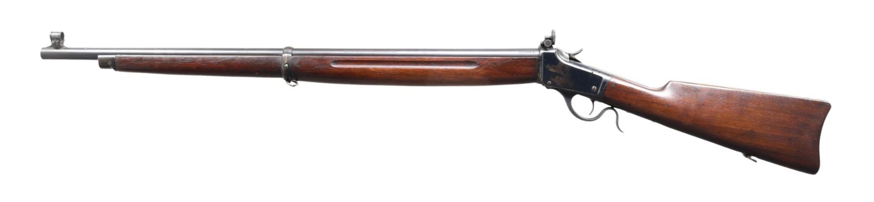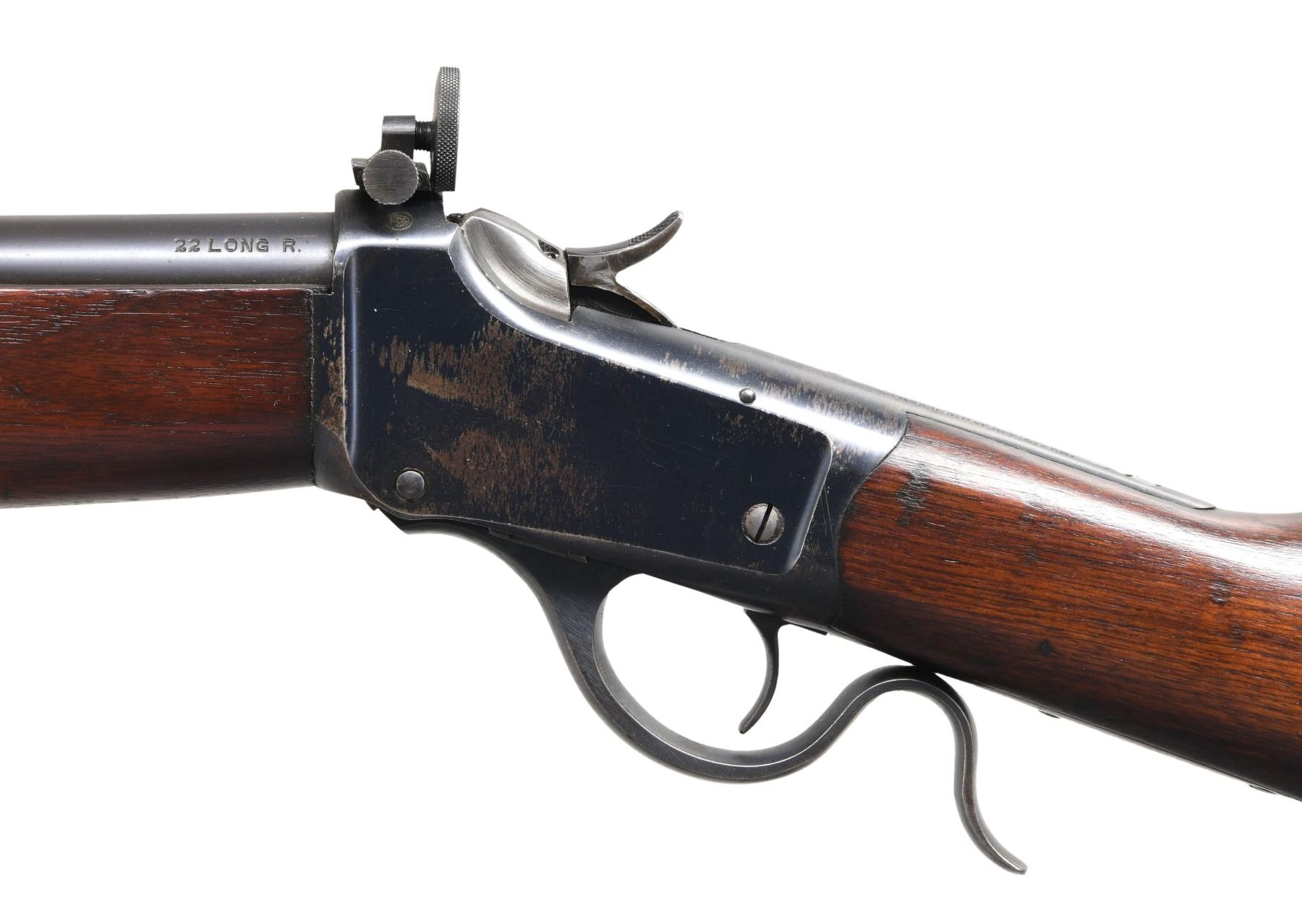 RIFLE. Cal. 22 LR. S# 125406. Bbl. 28". Model 1885 Winder Musket single shot breechloading rifle, mfg. by Winchester post-1920. Left side of the bbl. is marked with Winchester's mfg. and patent information, with the cal. designation "22 LONG R." marked at the breech. Metal components exhibit a blue finish overall. Plain wood pistol grip buttstock with wood musket length forend. Lyman globe front sight, with Lyman adj. aperture rear sight. CONDITION: metal components retain the majority of their original factory blue finish, exhibiting areas of wear and thinning that show through to a brown patina, as well as scattered superficial handling marks and some scattered spots of light to mild surface oxidation overall. Mirror bore, exhibiting well-defined rifling throughout. Wood furniture shows scattered handling marks and impressions from handling and storage but otherwise remains sturdy and serviceable. (24-5688/MLW). CURIO. $1,000-1,500.