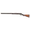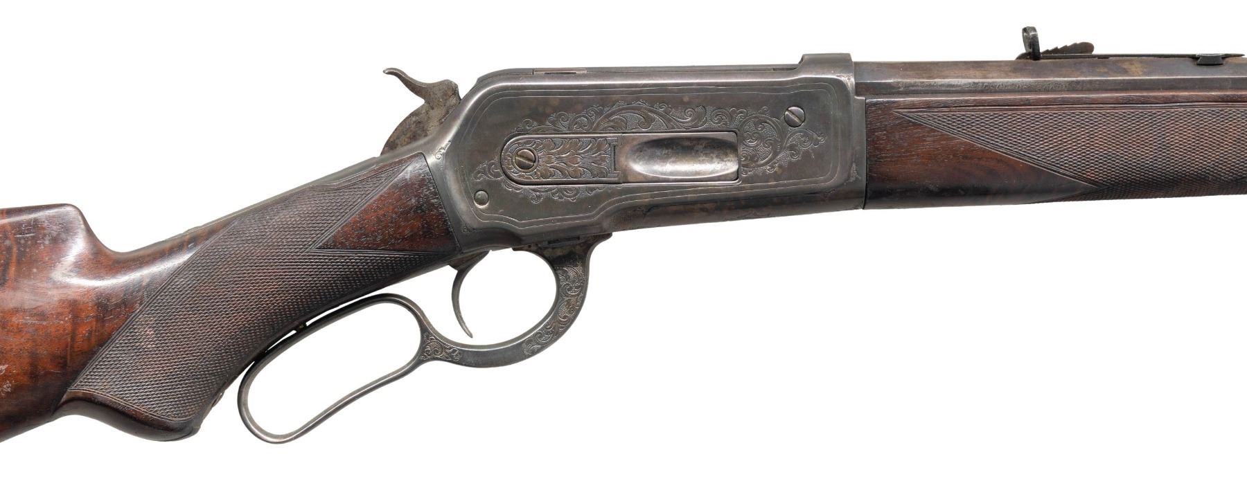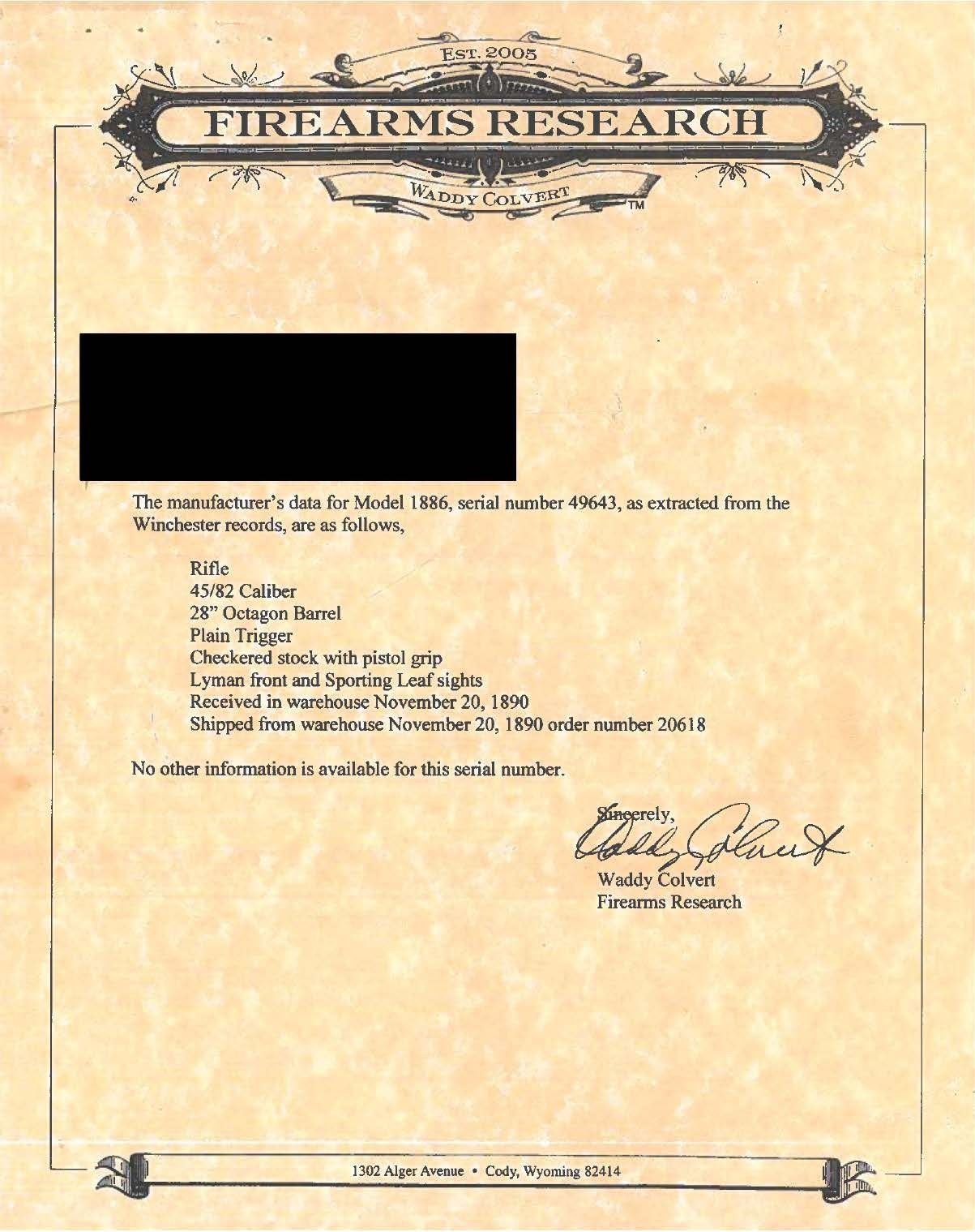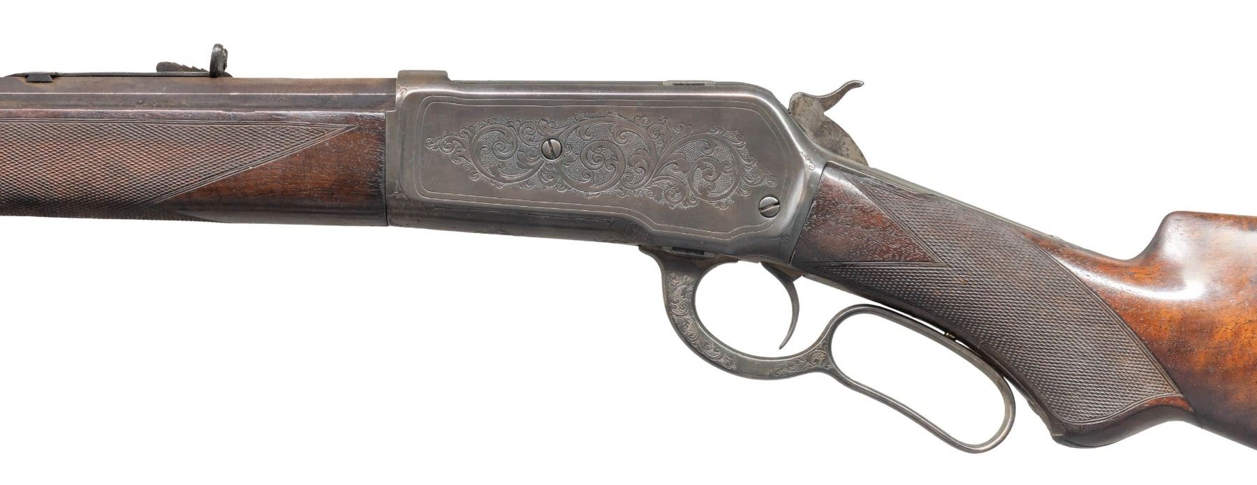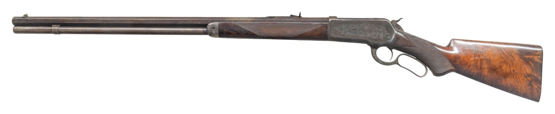 LEVER ACTION RIFLE. Cal. 40-82. S# 49643. Bbl. 28" octagon, 2" longer than standard. Original sporting sights. Full length mag. Sides of receiver have foliate scroll engraving with punch dot backgrounds and double straight line borders. Complimentary engraving extends to the lever, breech end of bbl., forearm, and steel shotgun buttplate. Forearm and pistol grip stock of fancy walnut with ebony grip insert, Style H factory checkering, and shotgun style buttplate. Left inside of lower tang is marked with assembly # "321" followed by "S" and wood grade marking "XX". Top tang channel of stock has partially visible "321" assembly # marking. UNATTACHED ACCESSORIES: Waddy Colvert letter stating: "Rifle/ 45/82 Caliber (Note: actual caliber is 40-82)/ 28" Octagon Barrel/ Plain Trigger/ Checkered stock with pistol grip/ Lyman front and Sporting Leaf sights/ Received in warehouse November 20, 1890/ Shipped from warehouse on November 20, 1890 order number 20618". CONDITION: bbl. and mag. tube finish have largely faded to mottled gray showing spotted corrosion and handling marks. Action and fittings have a dull fading recolored finish. Stock and forearm have an age darkened appearance showing moderate finish and checkering wear with scratches, marks, and mildew spots. Stock has a small chip left of top tang. Sound action. Lightly pitted bore retains sound rifling. (01-26770/DS). ANTIQUE. $5,000-7,000.