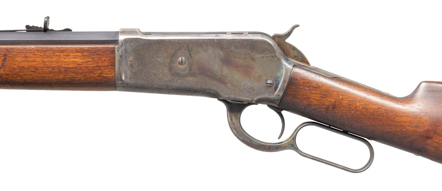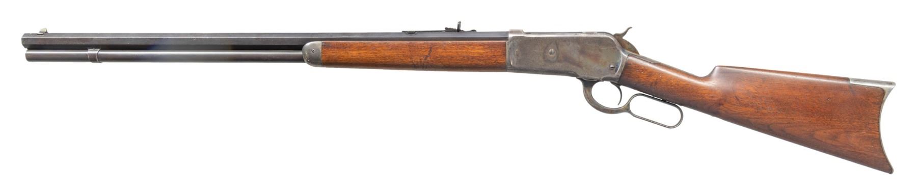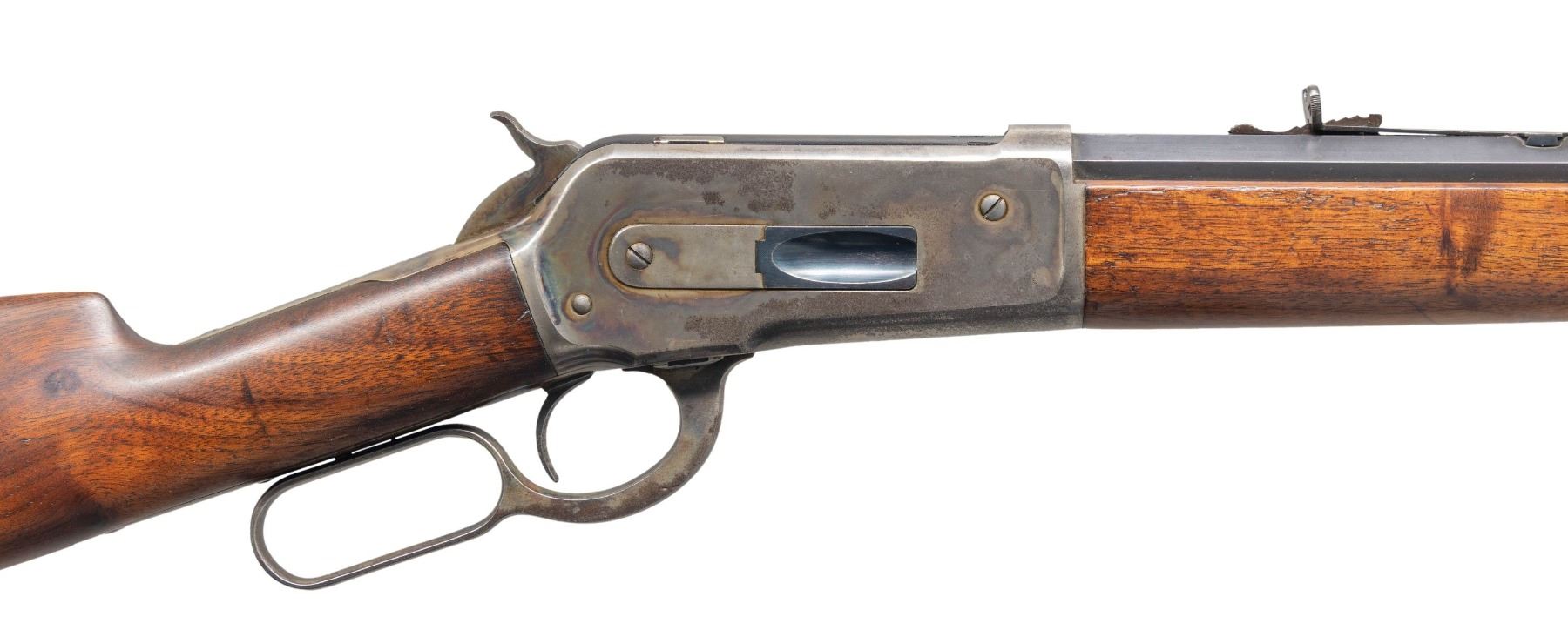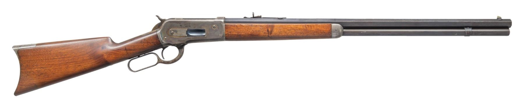 Cal. 45-90 WCF. S#. 78444, an added # 8 is hand stamped behind the S#. Bbl. 26" octagon with sporting sights. Full length mag. Blue & case colored finish. Walnut forend & straight grip stock with crescent steel buttplate. Mfg.1893. CONDITION: bbl. & mag tube retain over 60% lightly faded blue showing dark spotting & carry wear. The action shows 30% lightly visible case colors with the balance fading to gray scratches & areas of dark corrosion. Lightly refinished wood shows scattered marks. Sound action. Very good bright bore.PROVENANCE: The Esteemed Norm Greenberg Collection. (01-27711/DS). ANTIQUE. $3,000-4,500.