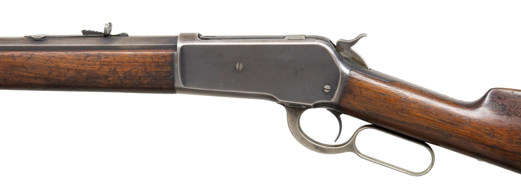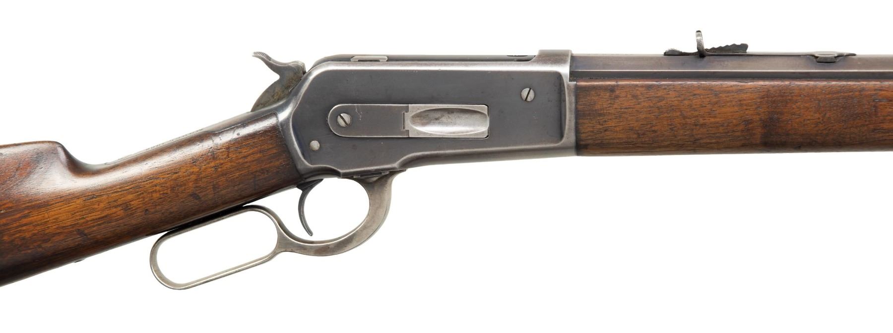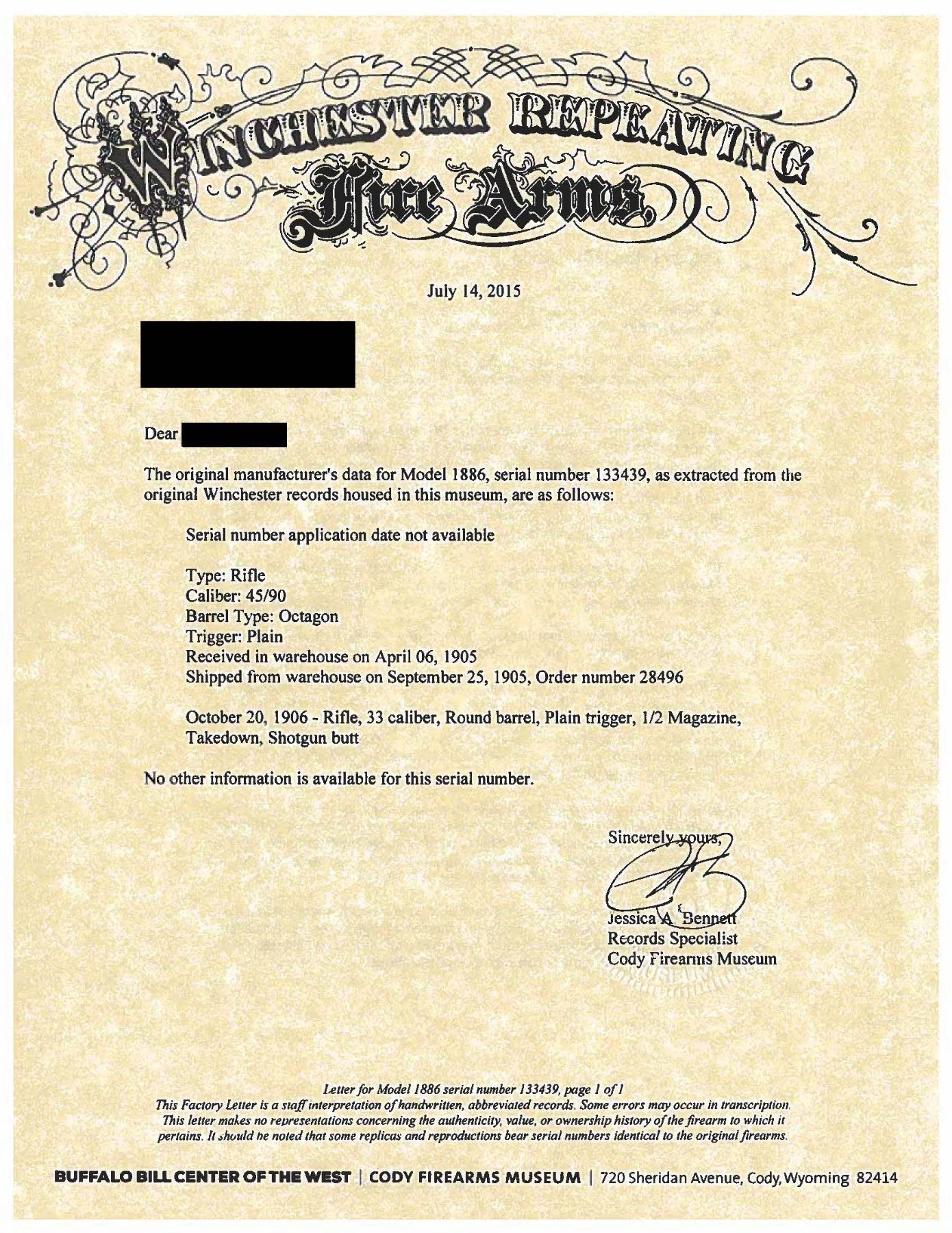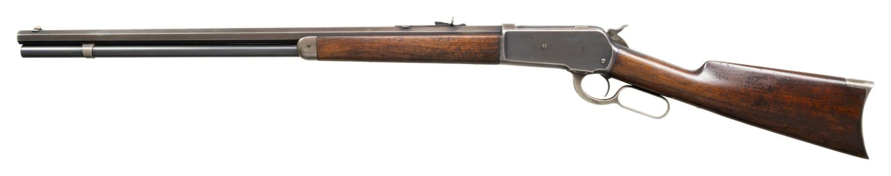 Cal. 45-90 WCF. S# 133439A. Bbl. 26" octagon with original sporting sights. Full length mag. Blue finish with case colored hammer and lever. Walnut forend and straight grip stock with crescent steel buttplate. Mfg. 1905. UNATTACHED ACCESSORIES: letter from the Cody Firearms Museum stating, The original manufacturer's data for Model 1886, serial number 133439, as extracted from the original Winchester records in this museum, are as follows: "serial number application date not available. Type: Rifle. Caliber: 45/90. Barrel Type: Octagon. Trigger: Plain. Received in warehouse on April 06, 1905. Shipped from warehouse on September 25, 1905, Order number 28406". The letter also includes information for a 33 caliber rifle that may have a duplicate serial number. CONDITION: 70% fading blue showing edge & carry wear w/ scattered scratches & marks. Hammer & lever retain some lightly visible case colors. Original wood finish shows wear with areas of darkening & have numerous scratches & marks. Sound action. Good bright bore. PROVENANCE: Estate Collection of John "Jack" Dhooghe. (25-5540/DS). CURIO. $2,000-3,000.