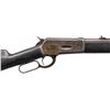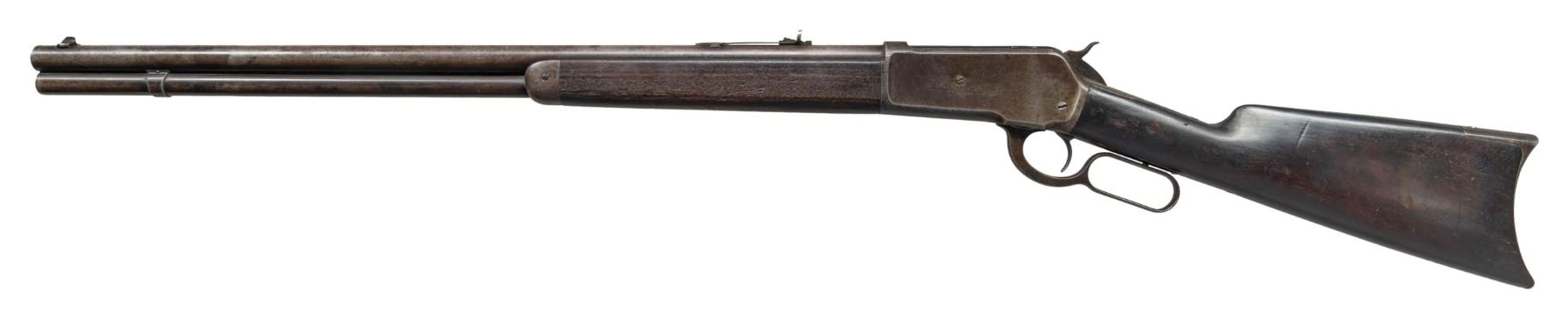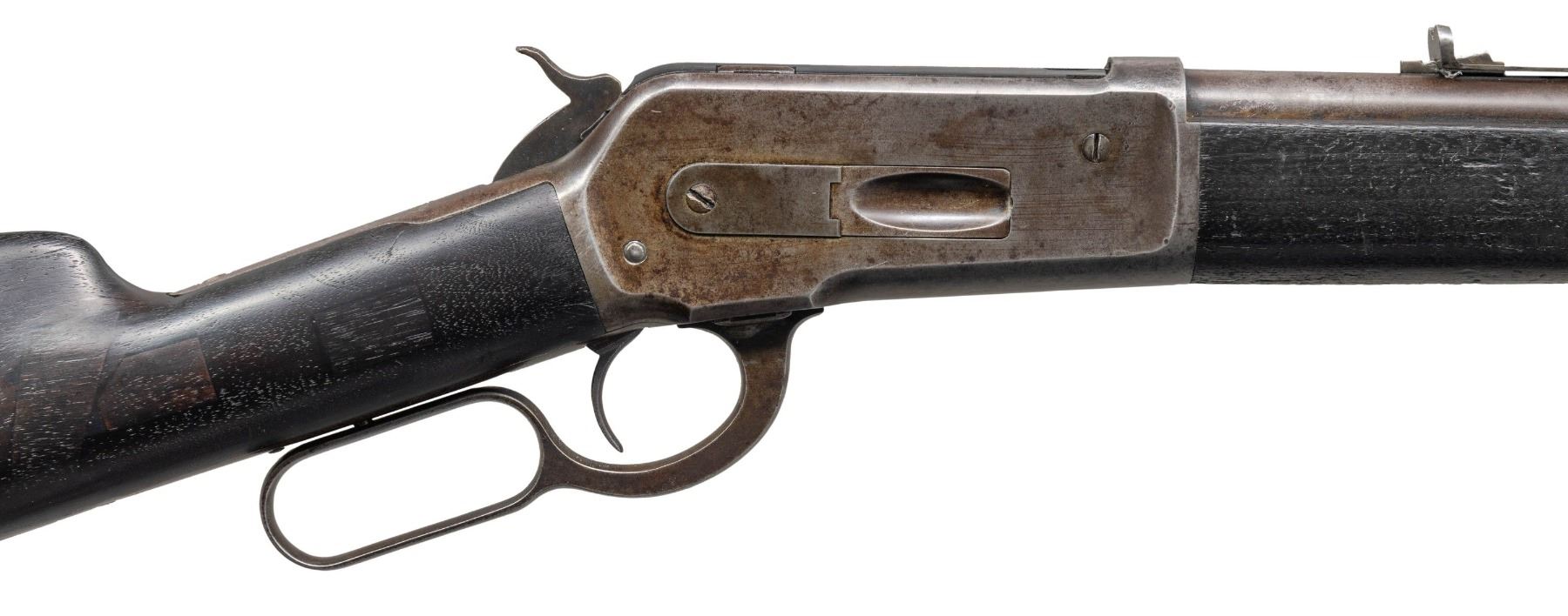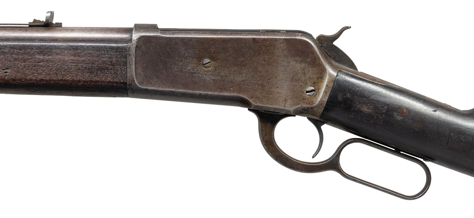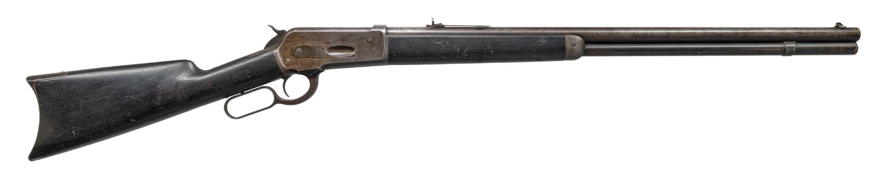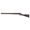 Cal. 45-90 WCF. S#. 22033. Bbl. 26" round. Sporting sights, rear sight has a replacement elevator. Full length mag. Walnut forend & straight grip stock with crescent steel buttplate. Mfg. 1888. CONDITION: Metal finish has faded to gray showing small dents and spots of pitting. Sanded & refinish stocks have a dark appearance with scratches & dents there is an added wood repaired chip right of the top tang. The action operates stiffly indicating wear. Dark lightly pitted bore retains intact rifling. (01-28203/DS). ANTIQUE. $2,000-3,000.