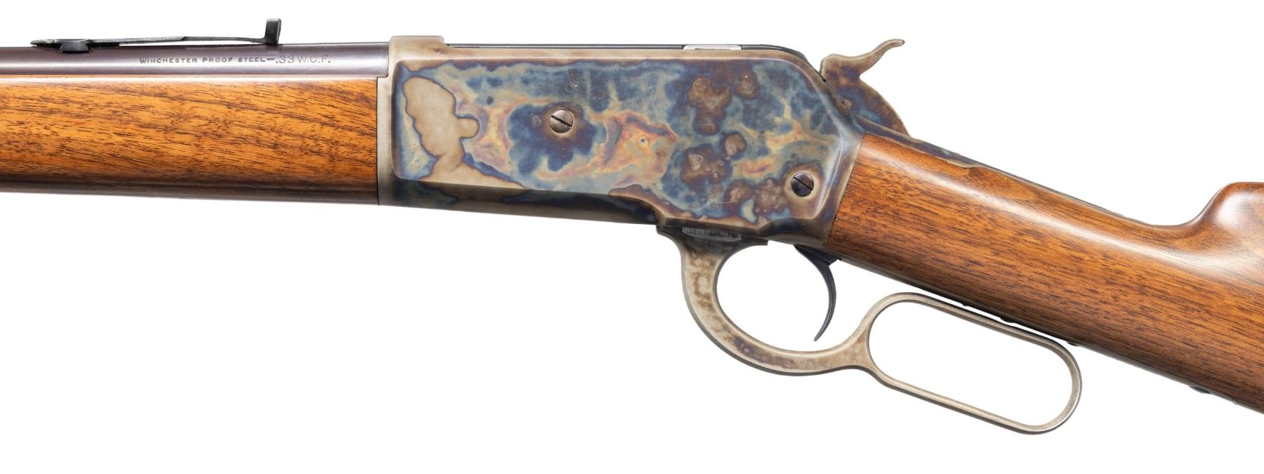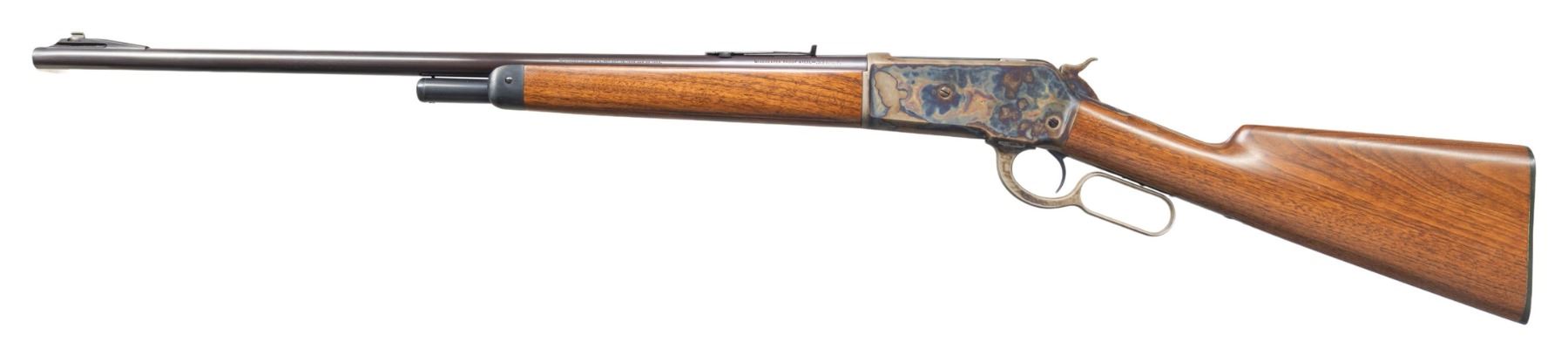 ACTION RIFLE. Cal. 33 WCF. S# 118850. Bbl 24" tapered round. Lyman bead front sight on an added stippled ramp. D.W. King flat top sporting rear sight missing elevator. Half length magazine. Walnut forearm and straight grip stock with hard rubber buttplate. CONDITION: bbl and mag tube have near excellent reblued finish. Action retains over 95% restored cased color finish having a dull appearance. Wood has a very good satin refinish. Sound action. Lightly pitted bore has sound rifling. (25-5485/DS). CURIO. $1,000-1,500.