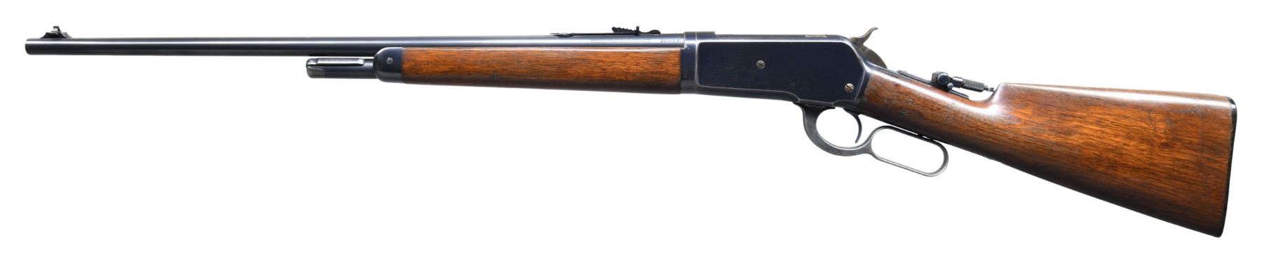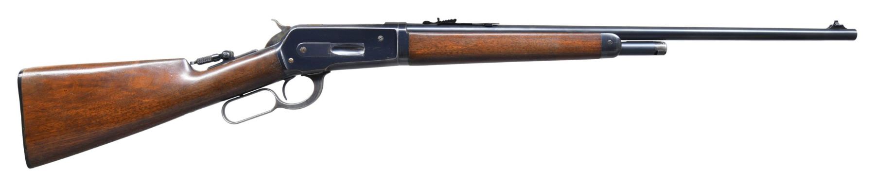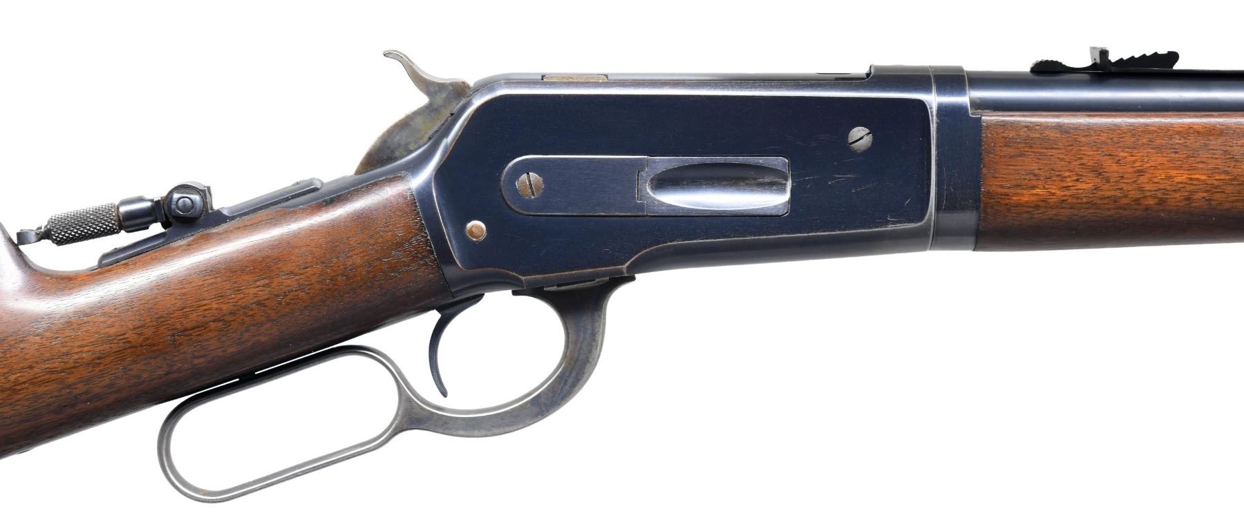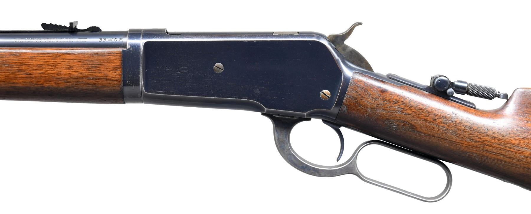 ACTION RIFLE. Cal. 33 WCF. S# 143330. Bbl. 24" tapered rnd. Ramp mounted Marbles brass bead replacement front sight, original flat top sporting rear sight, with a combination tang sight. Half length takedown mag. Blue finish, with case colored hammer and lever. Walnut forearm and straight grip stock, with hard rubber shotgun buttplate. Mfg. in 1907. UNATTACHED ACCESSORIES: original Lyman No. 4 front sight. CONDITION: very fine overall, retaining over 90% bright original blue, showing light carry and edge wear. Wood has good original finish, showing only a few minor scratches and marks. Mechanically excellent. Shiny bore with crisp rifling. (25-1722/DS). CURIO. $3,500-4,500.
