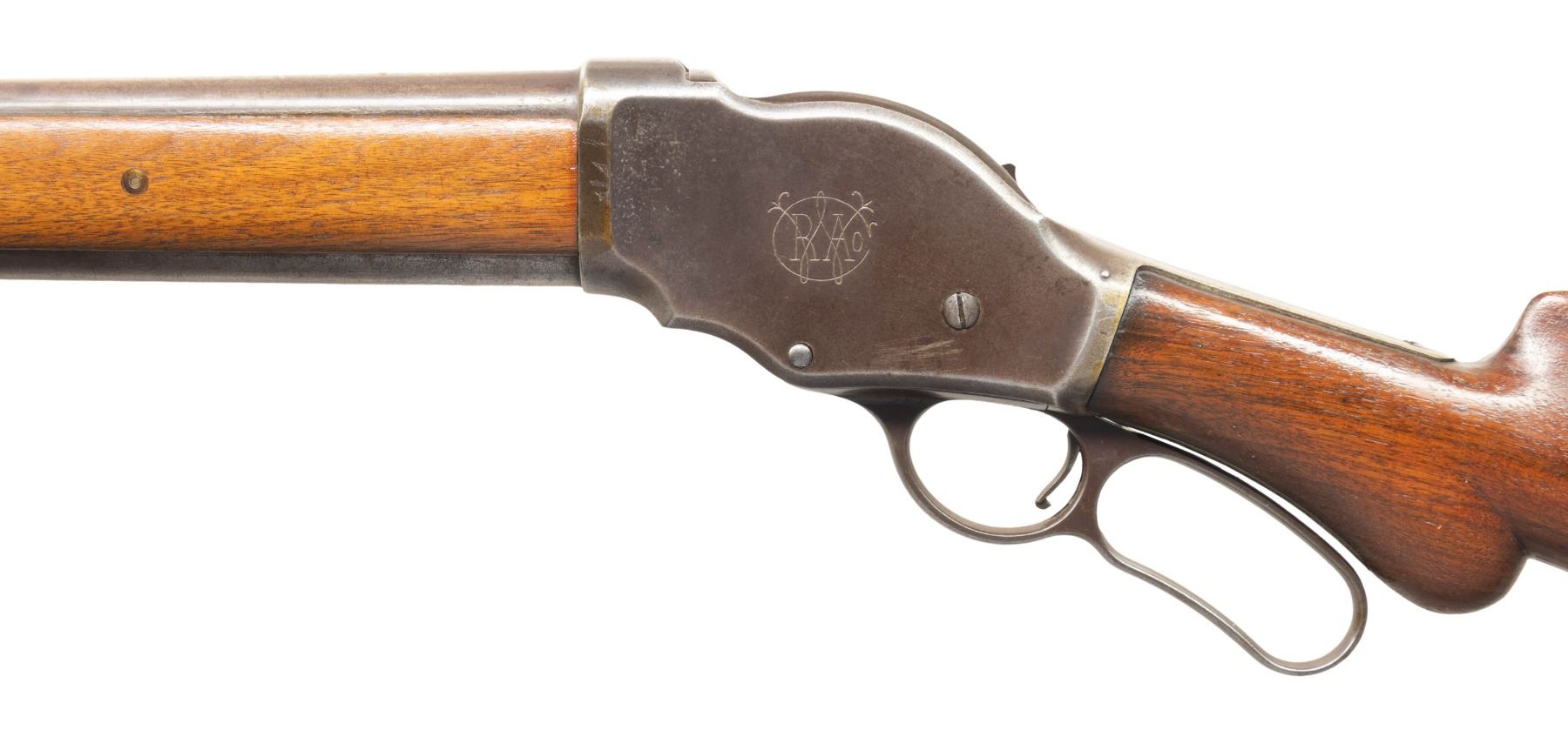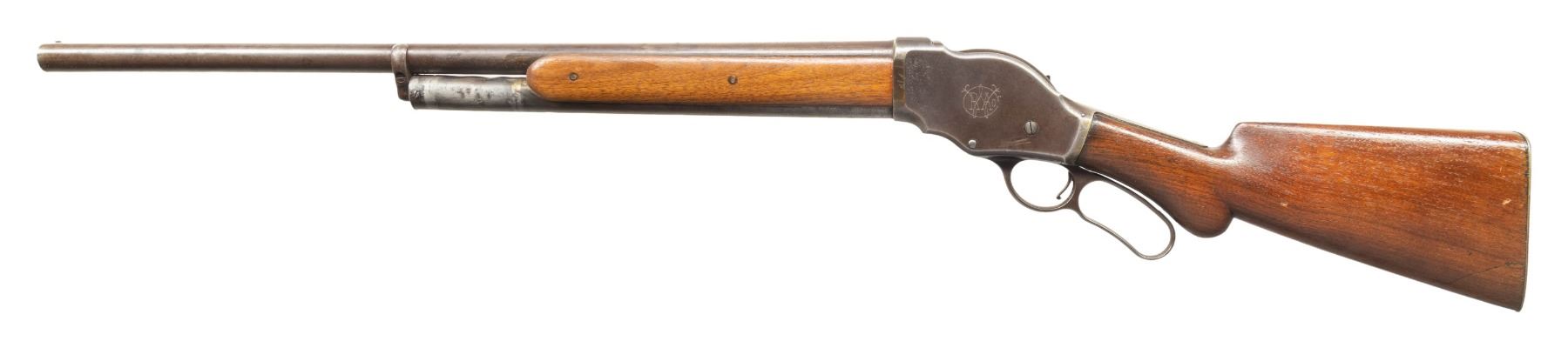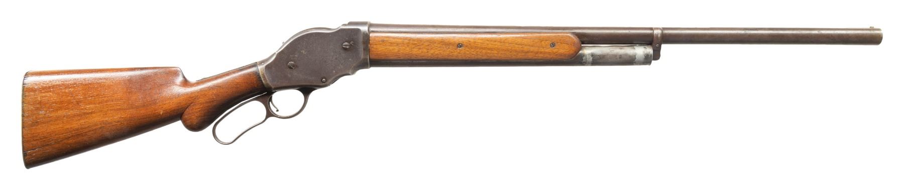 Cal. 10 GA. S# 43689. Bbl. 25 3/4". Model 1887 lever action shotgun mfg. by Winchester in 1892. Left side of the receiver is marked with the intertwined WRA Co. monogram, with Winchester's mfg. and patent information marked on the lower receiver tang. 2-panel sanded and refinished plain wood forearm and rnd. knob buttstock with checkered steel buttplate. Brass bead front sight. CONDITION: metal components retain traces of their original blue finish, with the balance having worn and thinned to a mottled gray patina, exhibiting areas of light to mild surface oxidation and pitting overall. Sides of bbl. and sides of mag. tube (ahead of forearm panels) exhibit a series of impressions, with the mag. tube exhibiting 2 bands of unusual coloration. Relatively bright bore, exhibiting scattered spots and patches of mild to moderate pitting. Proper manual mechanics. Wood furniture shows some scattered marks and impressions from handling and storage, with 2 cracks present on the wrist, stemming from the rear of the upper receiver tang. (01-29017/MLW). ANTIQUE. $400-600.