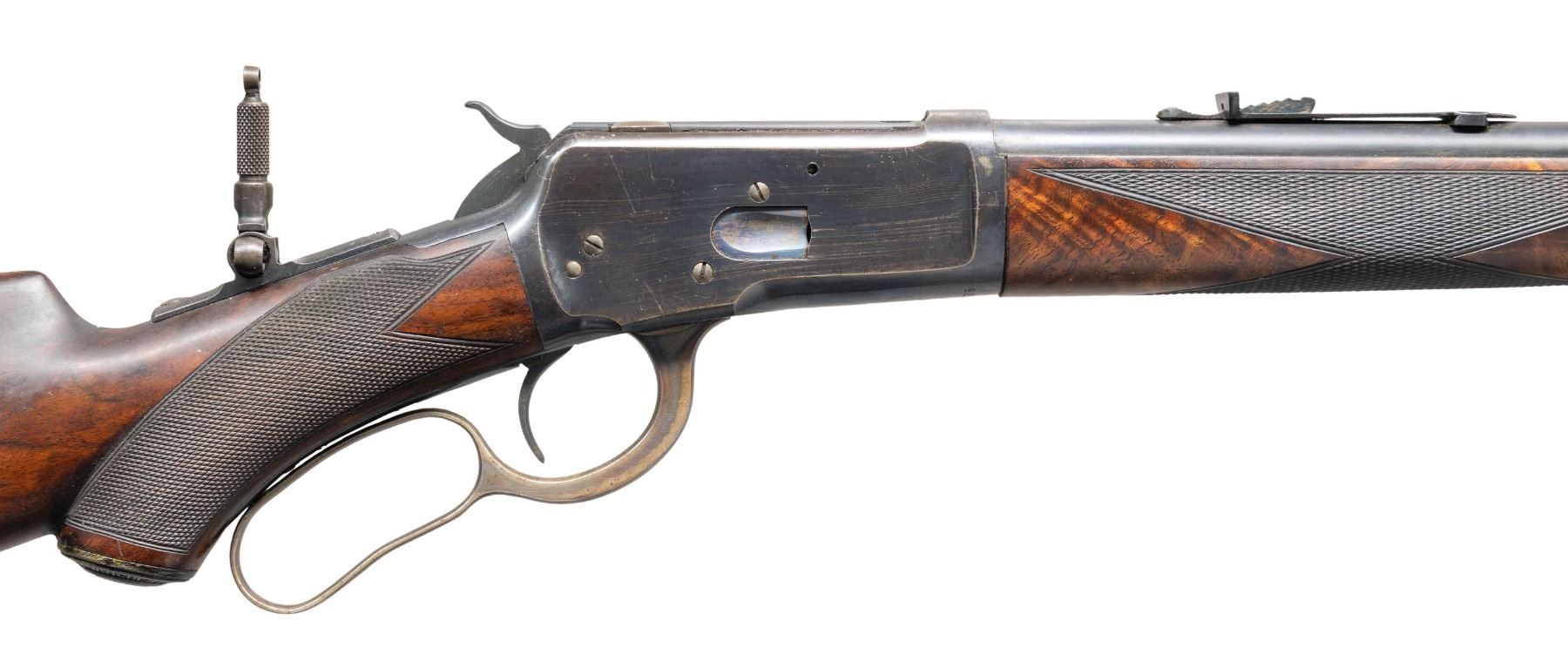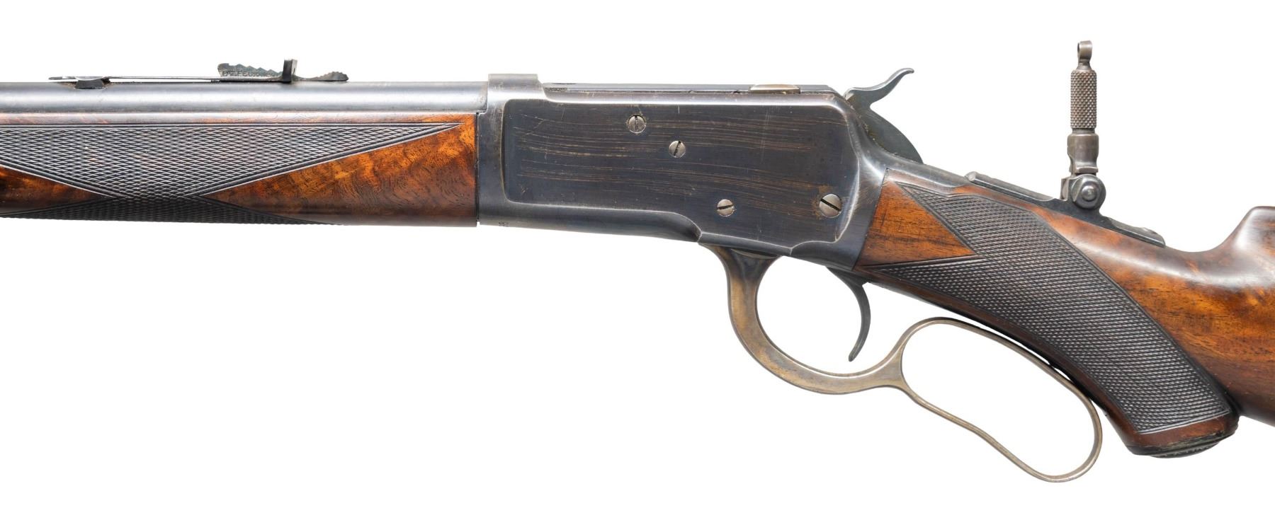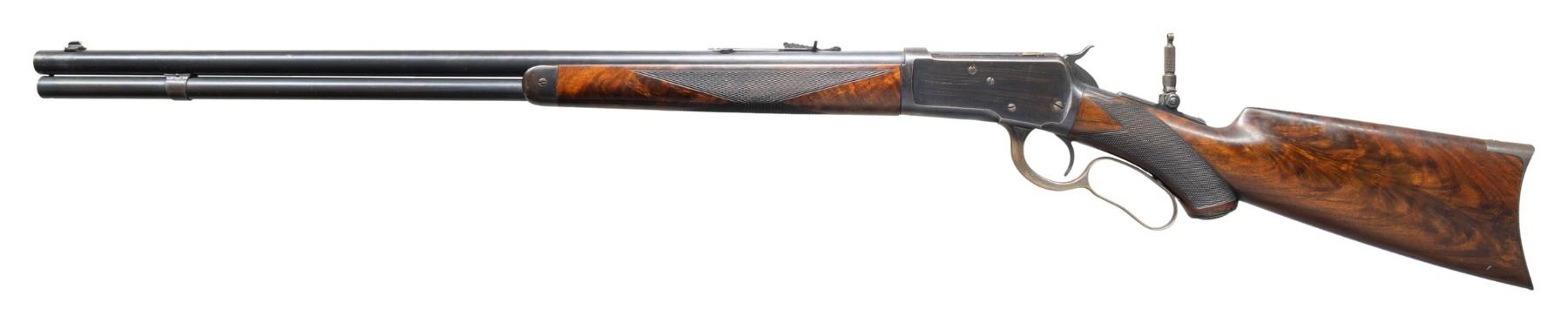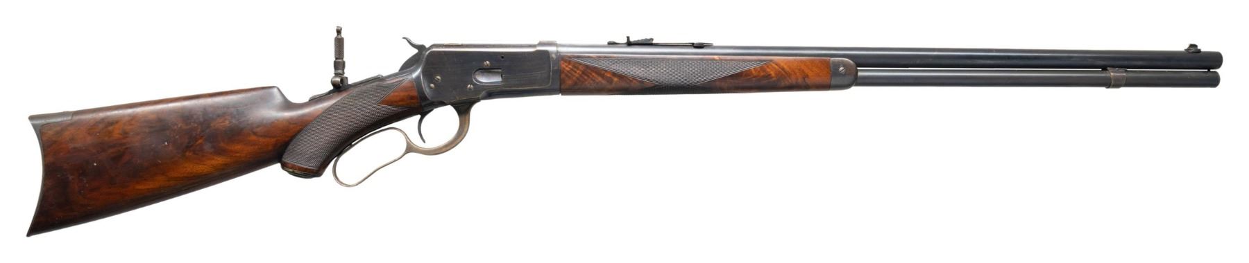 Cal. 44 WCF. S#. 426598. bbl. 24" round. Marble white bead front, flat top sporting rear with combination tang sight. Full length mag. Blue finish with case colored lever. Forend & hard rubber capped pistol grips stock of XX fancy black walnut with crescent steel buttplate. Style H checkering. Left inside of the lower tang is stamped with wood grade marking "XX" followed by assembly no. "2185". Mfg. 1907. CONDITION: After close inspection, the receiver appears to possibly have been professionally refinished/touched up. Over 85% blue showing light edge wear. Lever retains over 75% case colors. Stocks retain good original finish & checkering showing scattered scratches 7 marks. Sound action. Bright near excellent bore. (25-1298/DS). CURIO. $3,000-5,000.