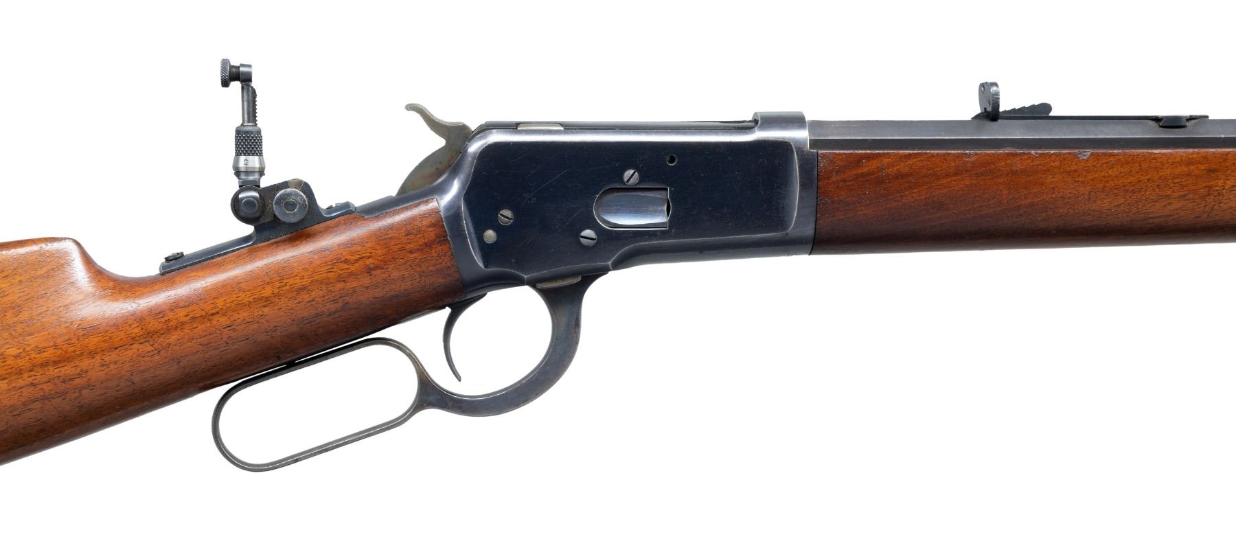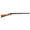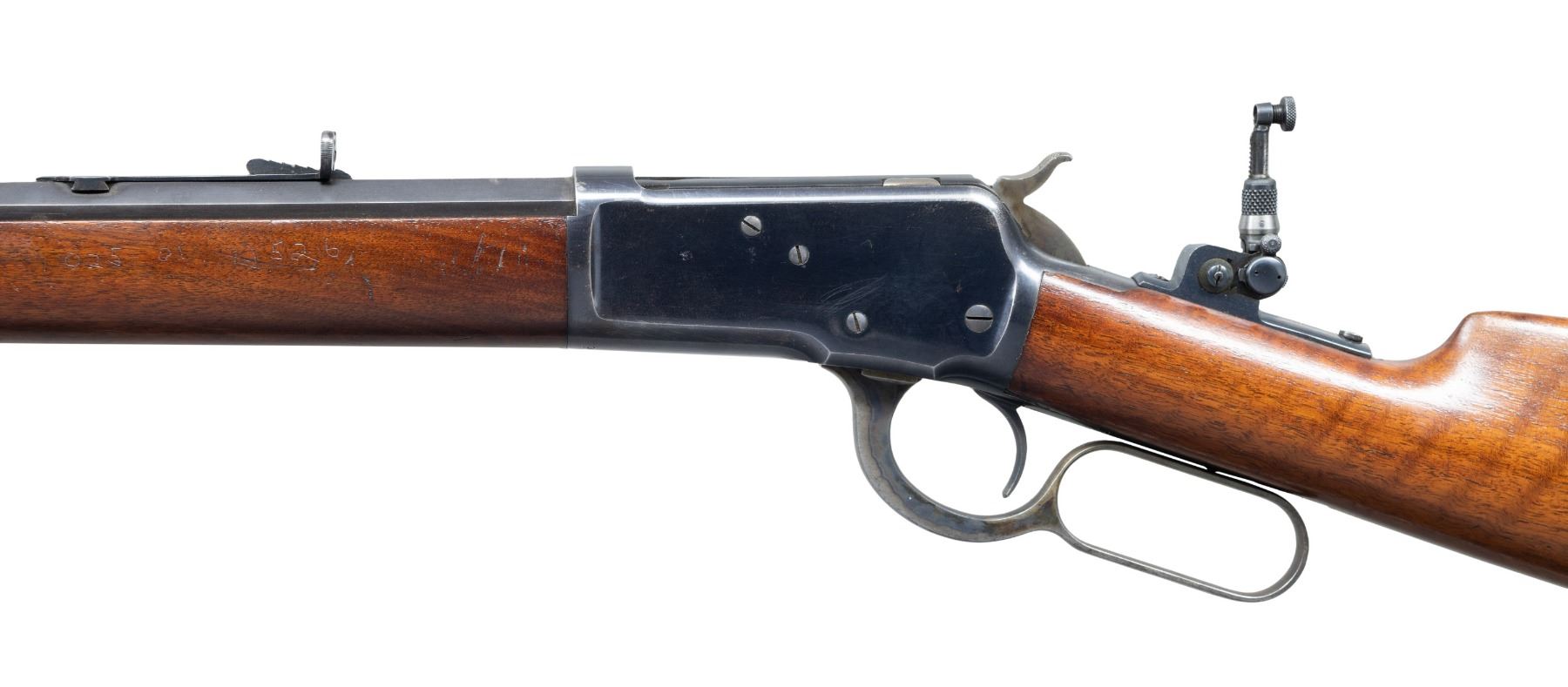 LEVER ACTION RIFLE. Cal. 38 WCF. S# 3856. Mfg. in 1892, first year of production. Bbl. 24" octagon. Rocky Mountain front sight with lowered German silver blade. Sporting rear sight with Lyman No. 103 windage tang sight. Full length tubular mag. Blue finish with case colored hammer, lever, and crescent steel buttplate. Forearm and straight grip stock of nicely grained walnut. Left side of forearm & right side of barrel has hand scratched markings "025 01 1526". CONDITION: over 90% original blue showing light carry and edge wear with scattered small spots of corrosion and handling marks. Original wood finish shows scattered scratches, marks, and small dents. Sound mechanics. Bore retains strong rifling showing scattered pitting. PROVENANCE: The Esteemed Norm Greenberg Collection. (01-27726). ANTIQUE. $1,500-2,500.