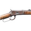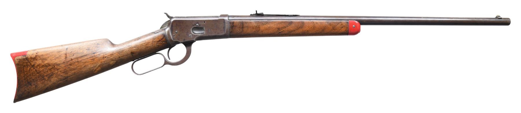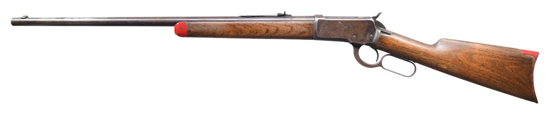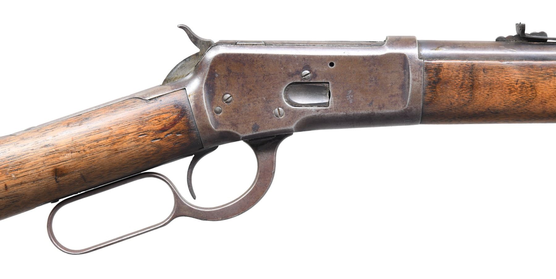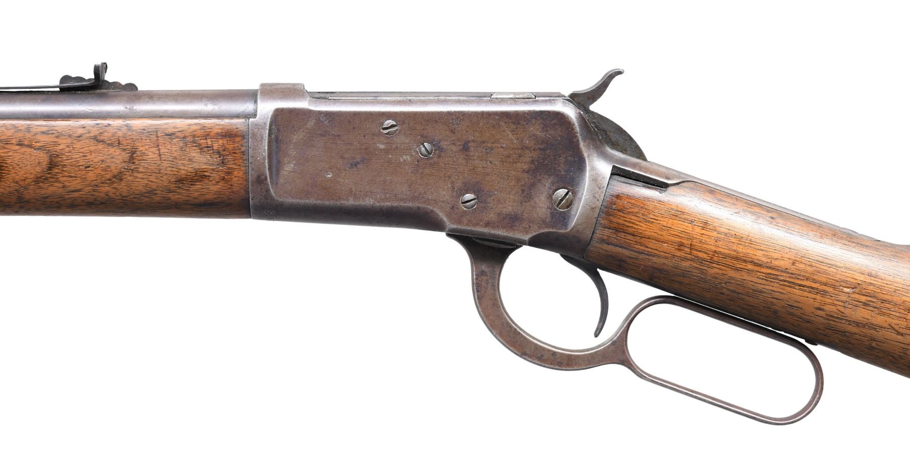 Cal. 38 WCF. S# 188546. Bbl. 24 1/4". Model 1892 lever action rifle mfg. by Winchester in 1901. Top of the bbl. is marked with Winchester's mfg. and patent information, with the cal. designation marked at the breech. Metal components exhibit a blue finish overall, save for on the buttplate, forend cap, and mag. button, which have been painted red. Plain wood straight grip buttstock and forend. Dovetailed German silver blade front sight, with dovetailed U-notch rear sight. CONDITION: metal components retain trace to fair amounts of their original factory blue finish, with the balance exhibiting a brown patina, and scattered spots of light to mild surface oxidation and pitting. Bright bore, exhibiting areas of dark pitting, while retaining strong rifling throughout. Wood furniture shows scattered marks and impressions from handling and storage, with the buttstock exhibiting a chip on the left side of the wrist at the receiver, and a few small filled in repairs. (25-1537/MLW). CURIO. $700-1,100.