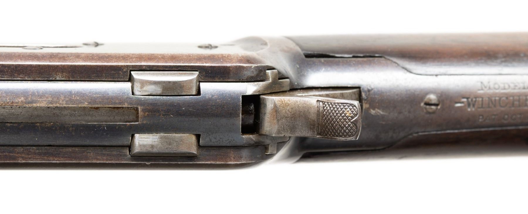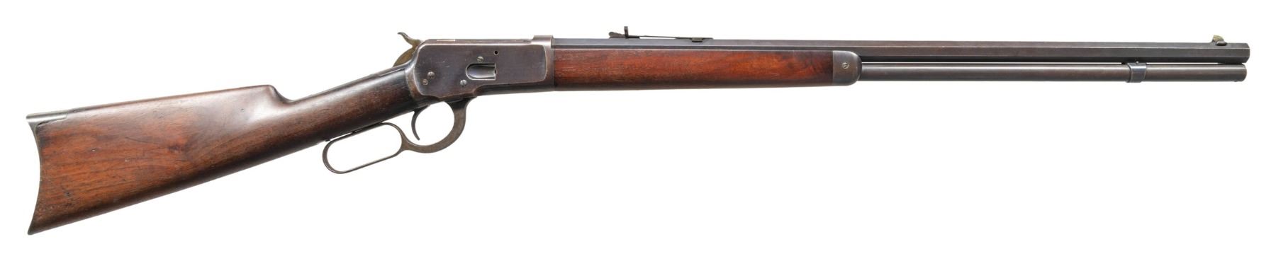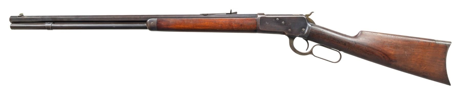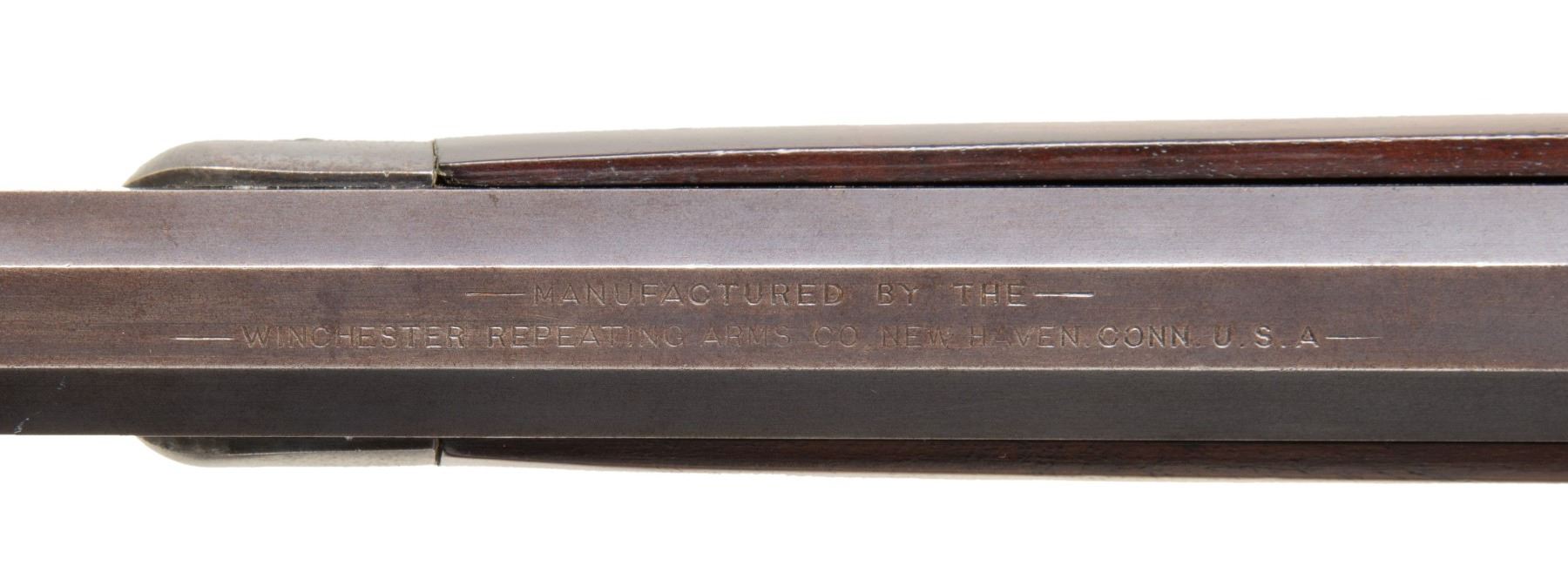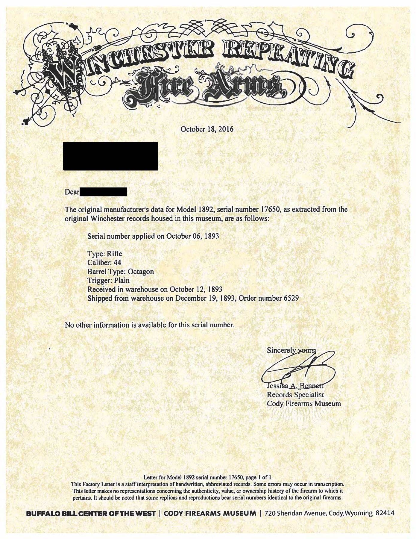Cal. 44 WCF (44-40). S#. 17650. Bbl. 24" octagon with original sporting sights. Full length mag. Blue finish with case colored hammer & lever. Walnut forend & straight grip stock having a crescent steel buttplate. UNATTACHED ACCESORIES: Cody Firearms Museum letter stating: Type: Rifle, Caliber: 44, Barrel Type: Octagon, Trigeer: Plain, Received in warehouse on October 12, 1893, Shipped from warehouse on December19, 1893, Order Number 6529. CONDITION: bbl & action retain over 50% dull fading blue showing carry wear and spotted corrosion. Hammer & lever show faint traces of case colors. Sanded & refinished wood shows handling marks with small chip on both sides of the top tang. Sound mechanics. Very good bright bore. PROVENANCE: Estate Collection of John "Jack" Dhooghe. (01-28260/DS). ANTIQUE. $2,000-3,000.