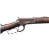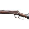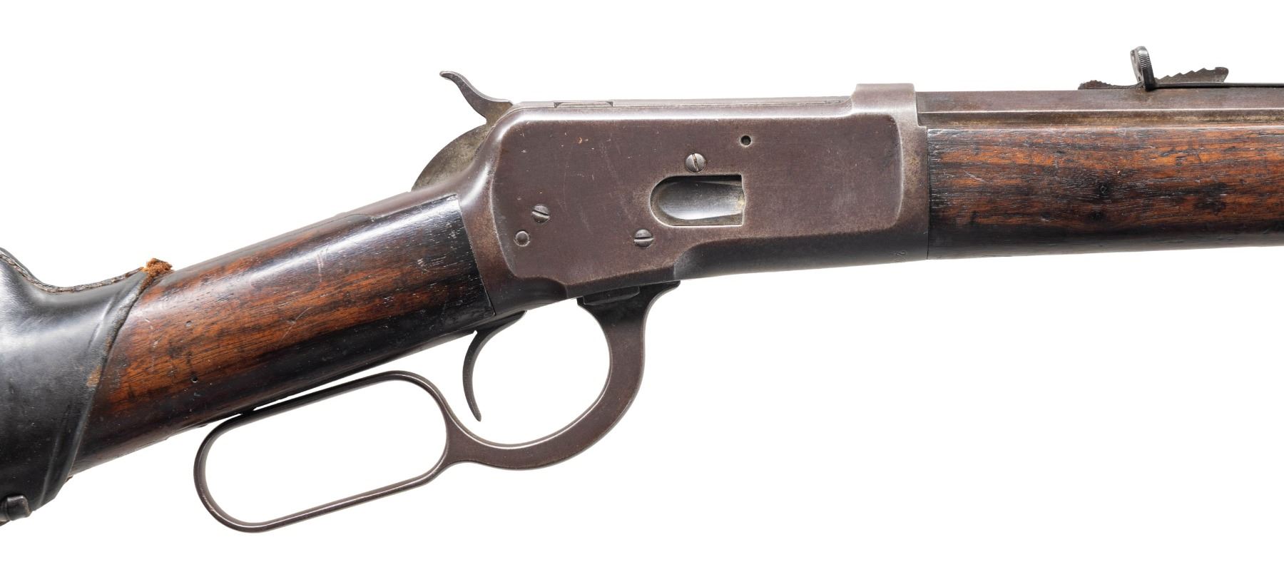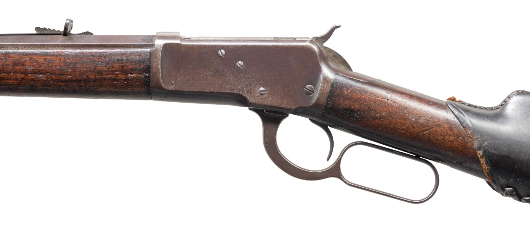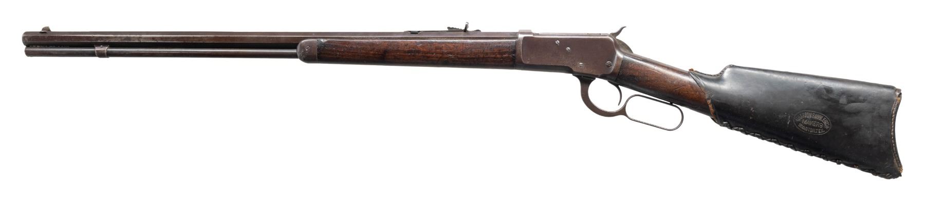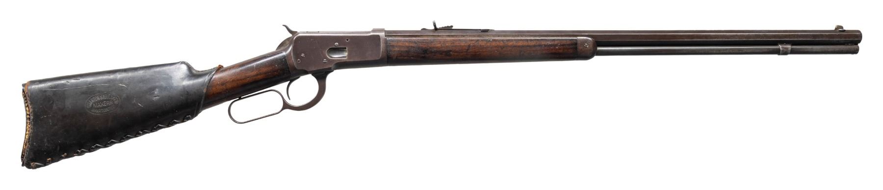Cal. 32 WCF. S# 205982. Bbl. 24 1/4". Model 1892 mfg. in 1902. Top flat of the octagonal bbl. is marked with Winchester's mfg. information, with the cal. designation marked towards the breech. Upper receiver tang is marked with the model designation and patent information. Plain wood forearm and buttstock with crescent steel buttplate. Buttsock is wrapped in a leather cover marked "WHARTON SADDLERY CO./ MAKERS/ WHARTON, TEX." on either side. German silver blade front sight with semi-buckhorn V-notch rear sight. CONDITION: metal components exhibit a dark gray patina, with scattered spots and patches of pitting overall. Fair bore, exhibiting scattered patches of dark pitting and a bulge towards the muzzle, while retaining good rifling throughout. Wood furniture shows scattered marks and impressions from handling and storage. Stocks leather wrap shows general overall wear and some spots of crazing, with some losses present at the rear. Stitching on butt has torn along the right side. PROVENANCE: The Esteemed Norm Greenberg Collection. (25-4209/MLW). CURIO. $600-900.