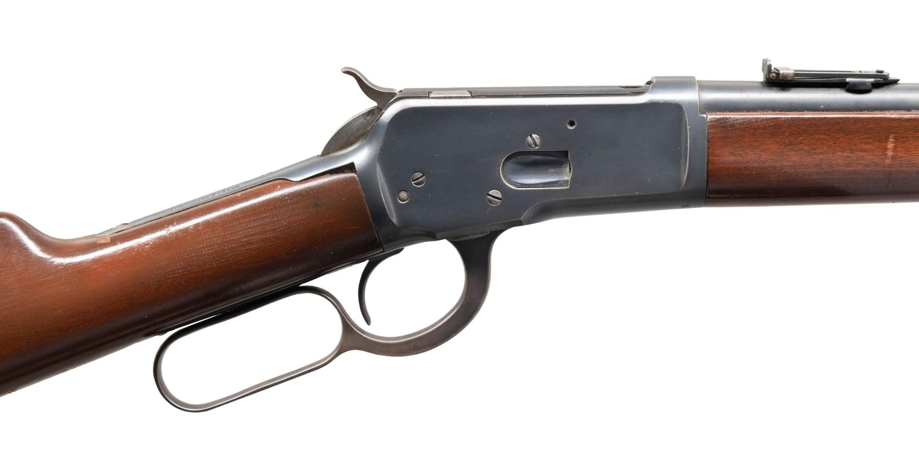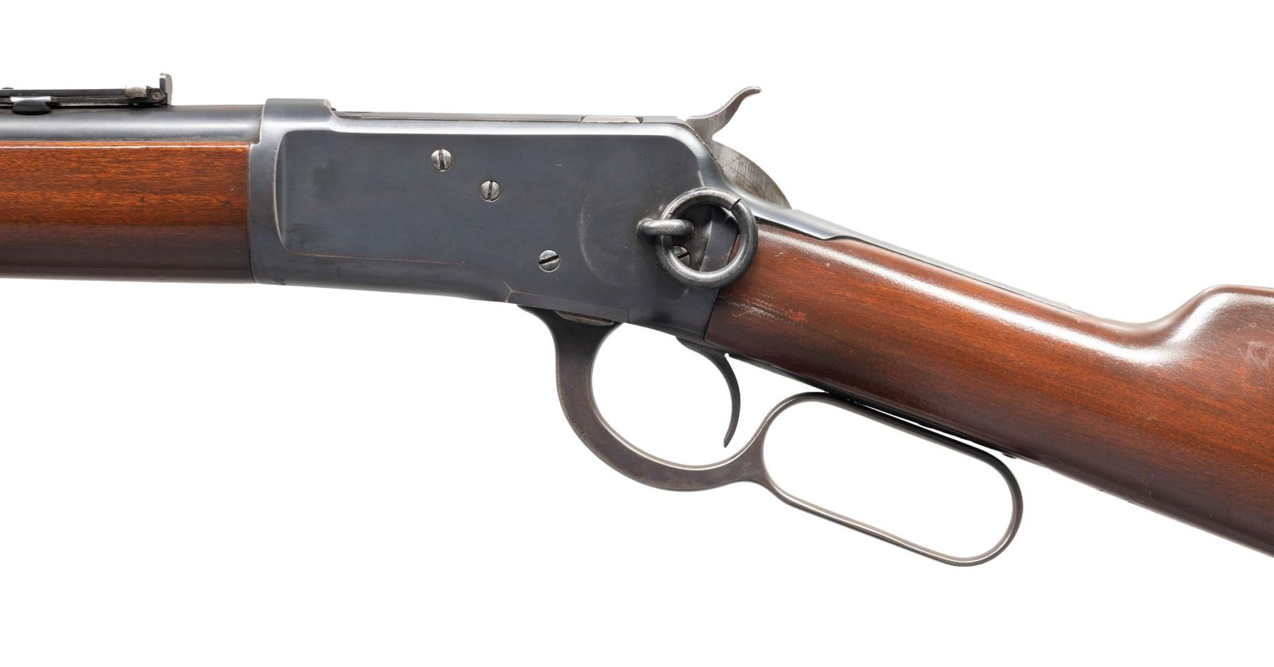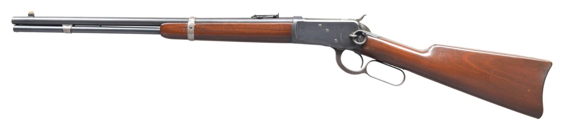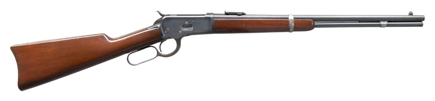 CARBINE. Cal. 32 WCF. S# 513900. Bbl. 20". Model 1892 lever action saddle ring carbine mfg. by Winchester in 1909. Top of the bbl. is marked with Winchester's 2-line mfg. and patent information, with the cal. designation marked towards the breech. Metal components exhibit a reapplied blue finish overall, save for on the mag. tube band and bbl. band, which are polished in-the-white. Buttplate exhibits a nickel plated finish. Single band fastened plain wood forearm and straight grip buttstock with steel carbine buttplate. Wood furniture has been sanded and refinished at one time. Pinned blade front sight with carbine folding leaf V-notch rear sight. Left side of receiver features a lanyard staple and ring. CONDITION: metal components retain the vast majority of their reapplied blue finish, exhibiting some light edge wear, with scattered spots/areas of light to mild pitting present beneath the bluing. Buttplate retains fair to good amounts of its nickel plated finish, exhibiting areas of flaking and wear showing through to a dark patina. Relatively bright bore, exhibiting scattered patches and areas of mild to moderate pitting, while retaining good, albeit worn rifling throughout. Proper manual mechanics. Wood furniture shows scattered superficial handling marks and impressions from handling and storage, with some scattered spots of flaking to the varnish. PROVENANCE: The Esteemed Norm Greenberg Collection. (25-4205/MLW). CURIO. $700-1,000.