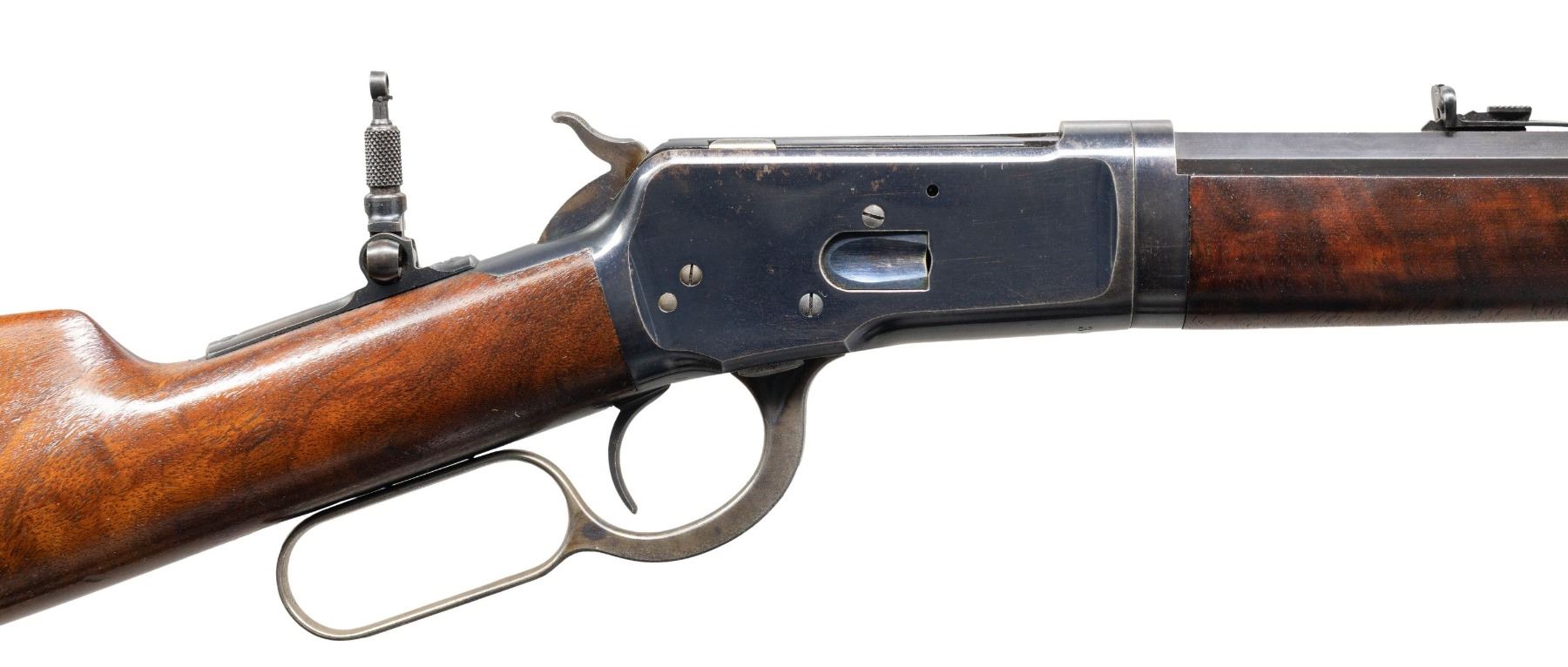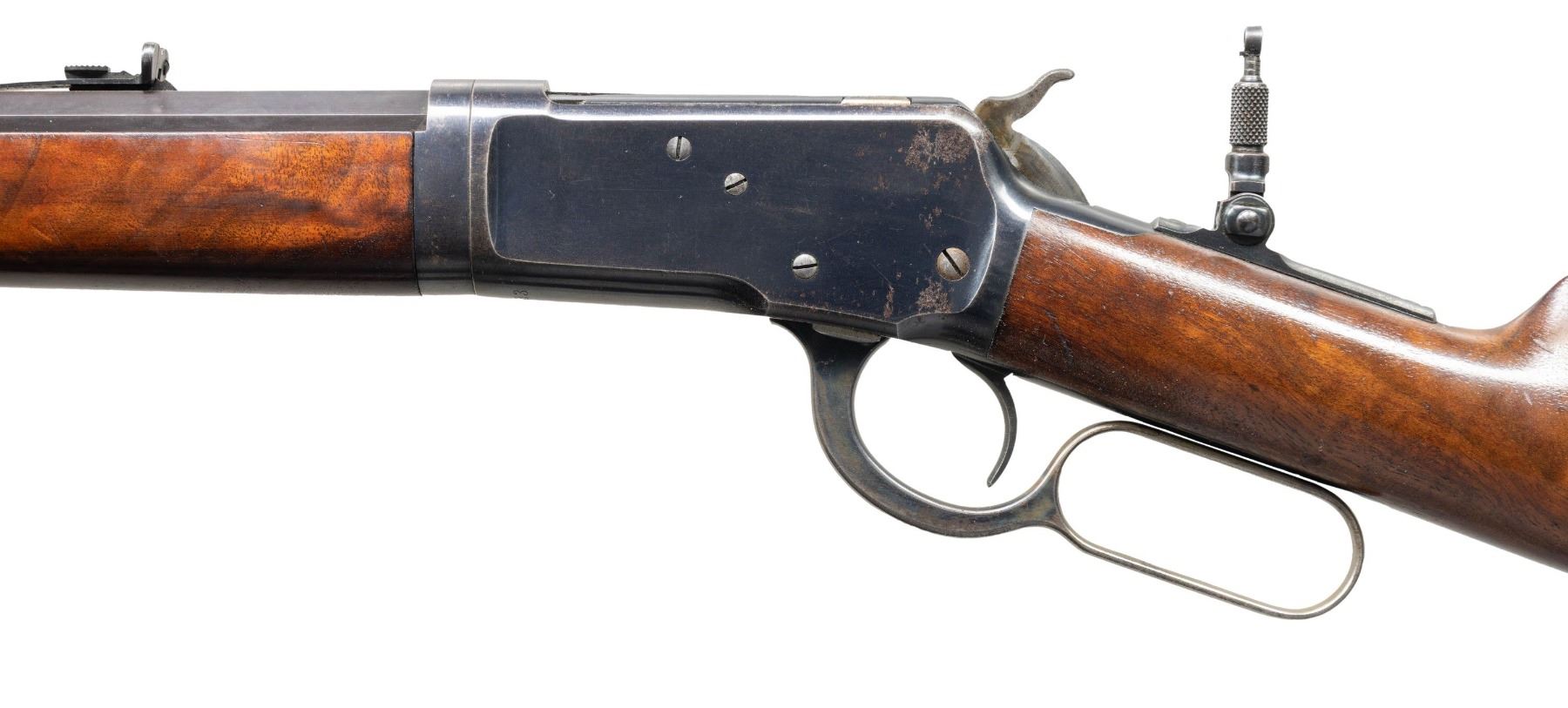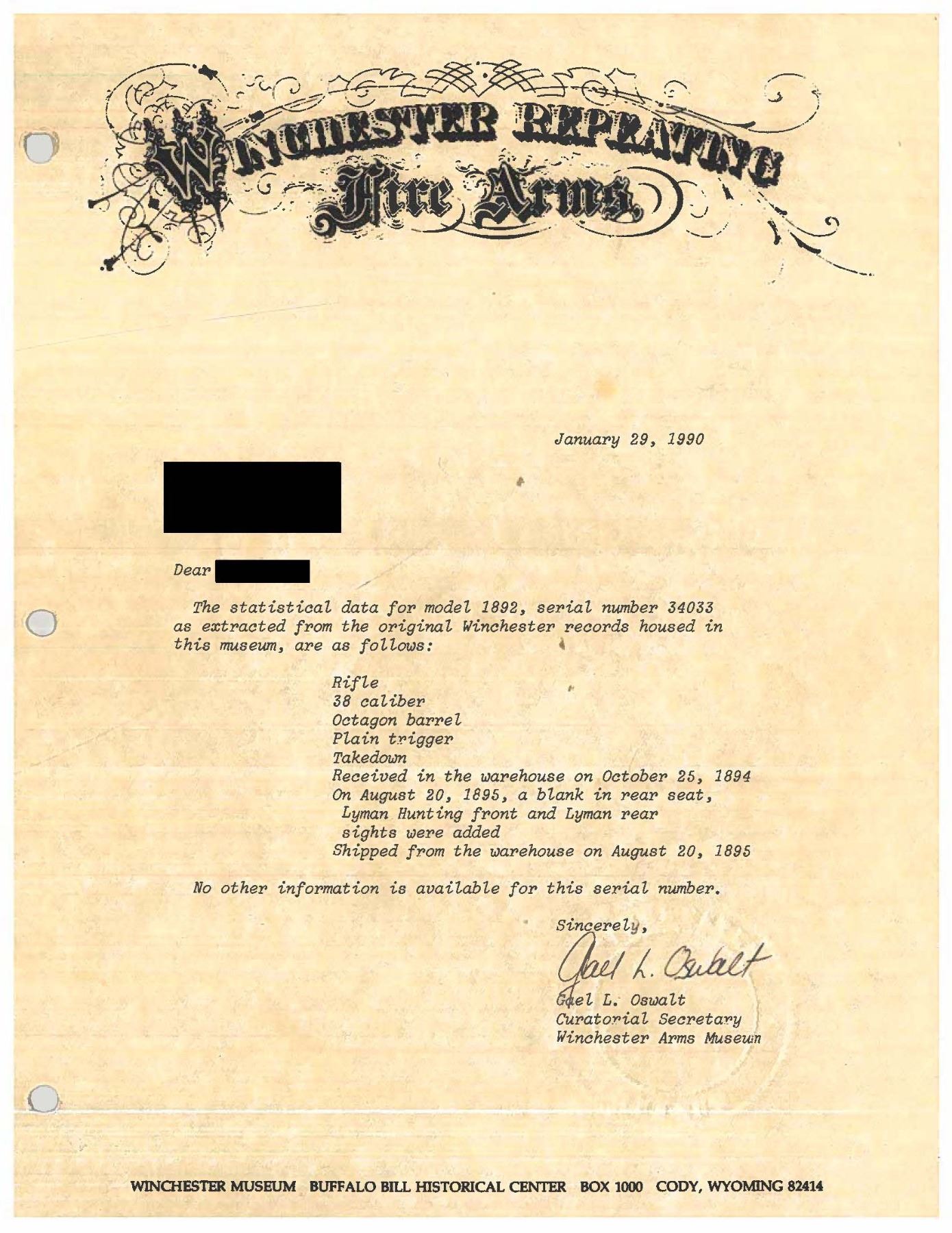 Cal. 38 WCF. S# 34033. Bbl. 24" octagon. Added Lyman No. 4 ivory bead hunting front sight, sporting rear sight, and combination tang sight. Full length takedown mag. Blue finish with case colored hammer lever and buttplate. Forearm and straight grip stock of nicely grained walnut with crescent steel buttplate. UNATTACHED ACCESSORIES: Winchester Arms Museum / Buffalo Bill Historical Center letter stating: "Rifle/ 38 caliber/ Octagon barrel/ Plain trigger/ Takedown/ Received in the warehouse on October 25, 1894/ On August 20, 1895, a blank in rear seat, Lyman Hunting front and Lyman rear sights were added/ Shipped from the warehouse on August 20, 1895". CONDITION: over 80% original blue showing light edge and carry wear with spots of flaking on the receiver and forearm cap. Hammer, lever, and buttplate retain some fading case colors. Original wood finish shows scattered scratches and marks. Sound mechanics. Good bright bore. PROVENANCE: The Esteemed Norm Greenberg Collection. (01-27727/DS). ANTIQUE. $2,000-3,000.