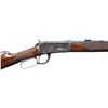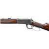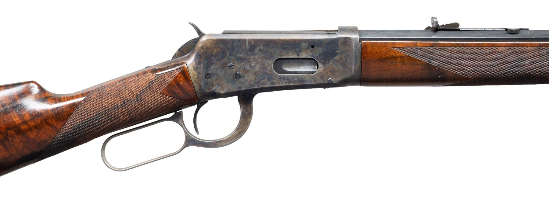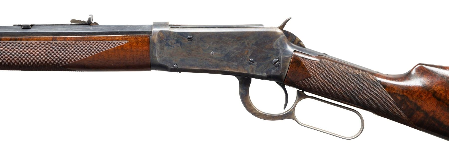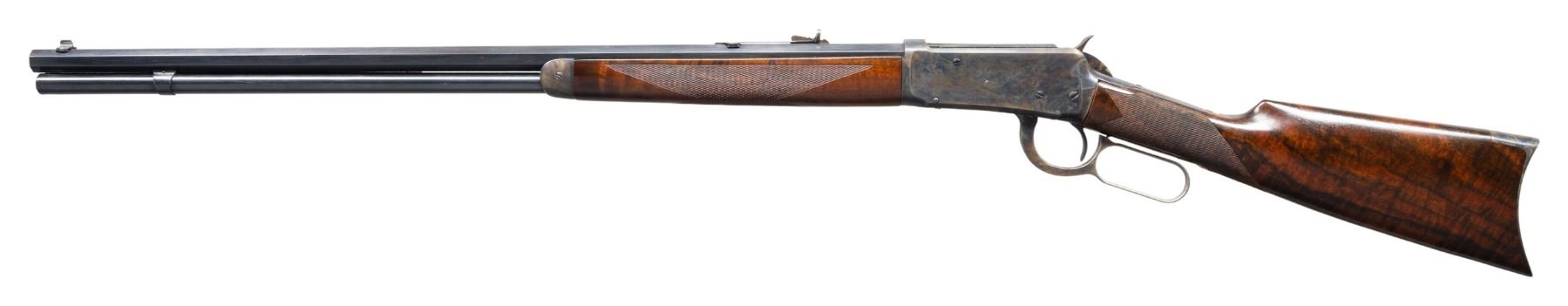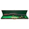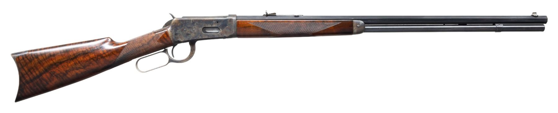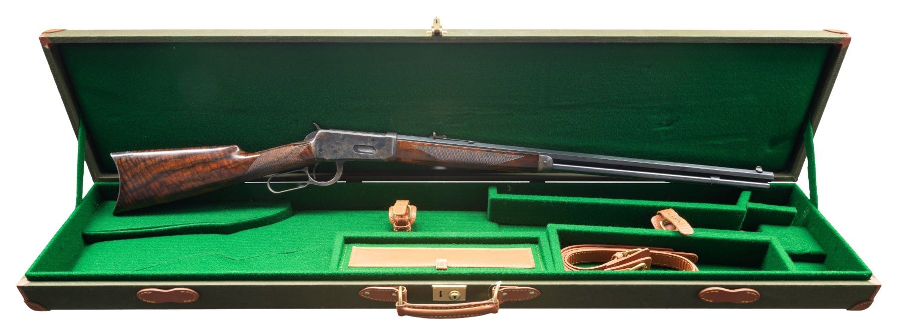 RIFLE. Cal. 32-40. S#. 13653, first year of mfg. Bbl. 26" octagon. Bead front with sporting rear sight altered to flat top configuration. Full length mag. Custom forend & straight grip stock of fancy Bastogne walnut have borderless wrap around hand checkering and original crescent steel buttplate. UNATTACHED ACCESORIES: green canvas covered hardcase with leather trim & straps. Green felt covered fitted interior. CONDITION: bbl. & mag. tube retain nearly all reblued finish. Action, forend cap and buttplate retain most of a dull restored case colored type refinish showing spots of remaining pitting. Stocks have good finish showing a few handling marks. Front sight is missing the bead. Functioning action. Dark lightly pitted bore retains intact rifling. (01-27964/DS). ANTIQUE. $2,000-3,000.