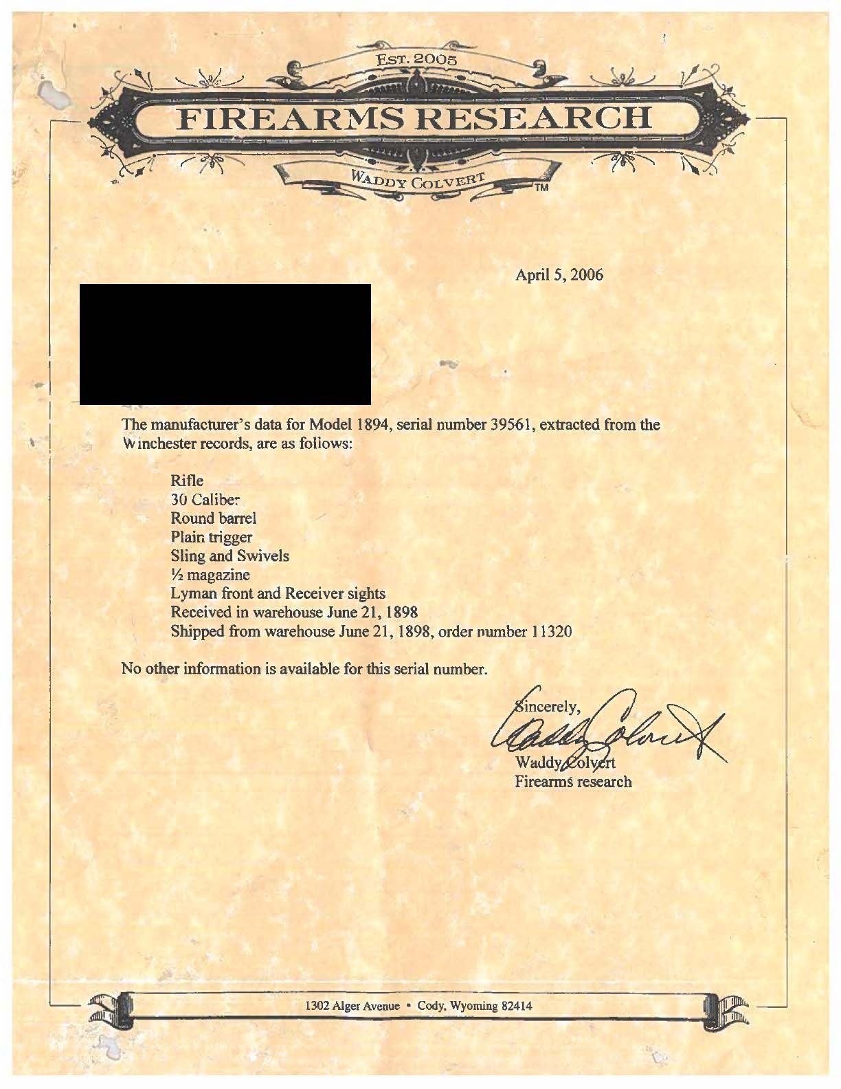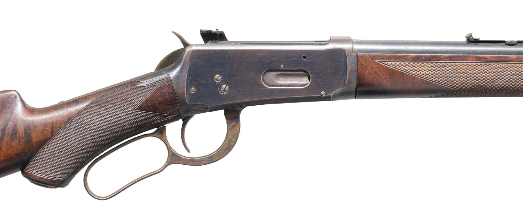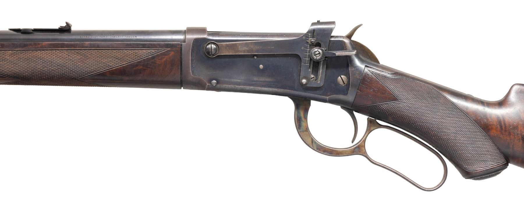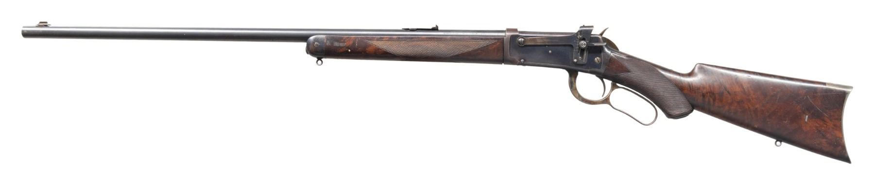 Cal. 30 WCF. S#. 39561. Bbl. 26" round. Replacement bead front with original style express rear sight &"Climin Lyman" receiver sight missing eye piece. Blue finish with case colored hammer & lever. . Button mag. Forend & hard rubber capped pistol grip stock of XXX fancy walnut. Features include style "H" checkering, crescent steel buttplate and Winchester sling eyes. Left inside of the lower tang is marked with assembly # "5541" followed by wood grade marking "XXX". Mfg. in 1895, 2nd year of production. CONDITION: bbl. & action retains over 70% dull blue showing edge wear & light spotting. Lever & hammer have over 70% case colors. Refinished wood shows scattered handling marks. Checkering is recut. Forend exhibits some back & forth play on the mag. tube. Sound action. The bore retains sound rifling. (01-26794/DS). ANTIQUE. $ 2,000-3,500.