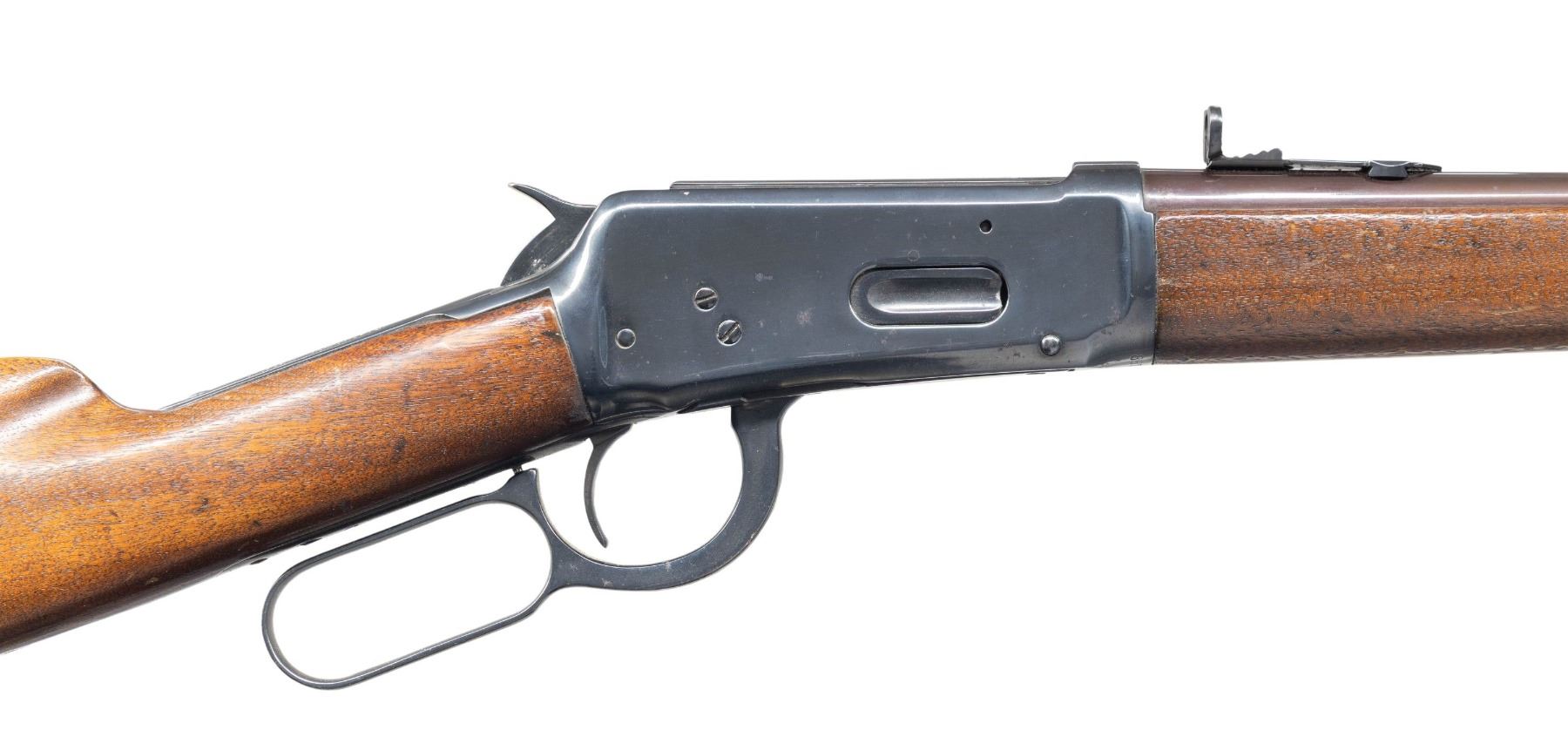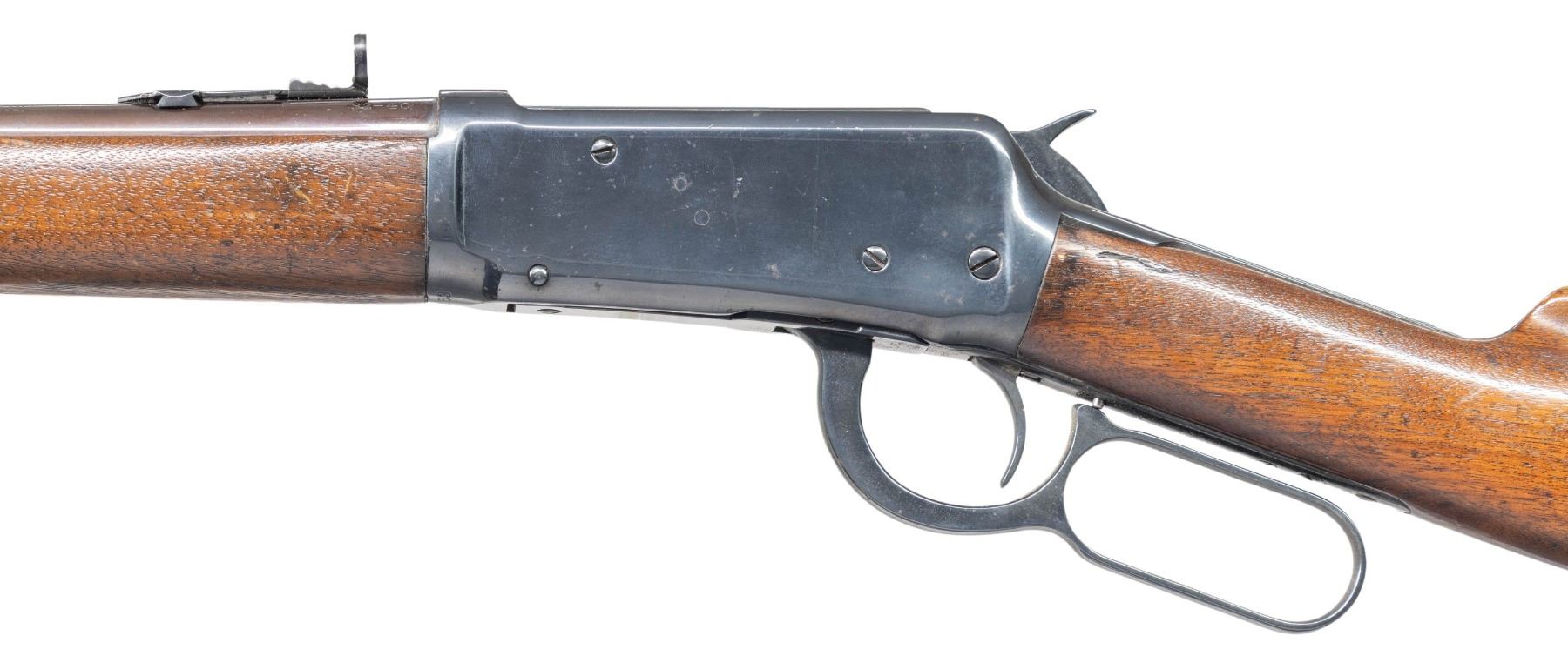 Cal. 32-40. S# 852453. Bbl. 20" w/ replacement brass bead pinned blade front sight & a Redfield full buckhorn replacement rear sight. Full length mag. Walnut forearm & straight grip stock w/ hard rubber buttplate. Forearm band & toeline of stock have added swing swivels. Mfg. 1919. CONDITION: brightly polished reblued metal showing some remaining pitting. Barrel has a slightly plumb color. Sanded & refinished wood shows dents & marks. Toeline of stock have a small added hole about 2 1/2" behind the top tang. Sound action. The bore shows darkening in the grooves & retains intact rifling. (25-6529/DS). CURIO. $300-600.
