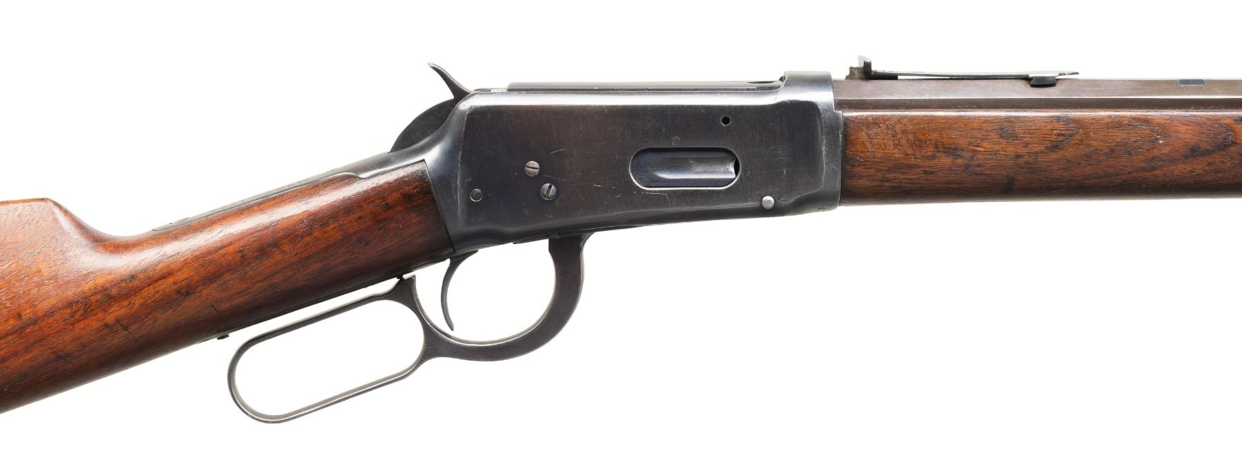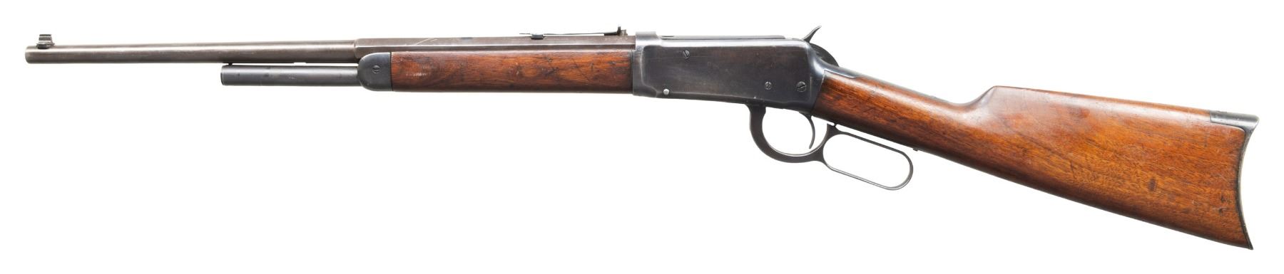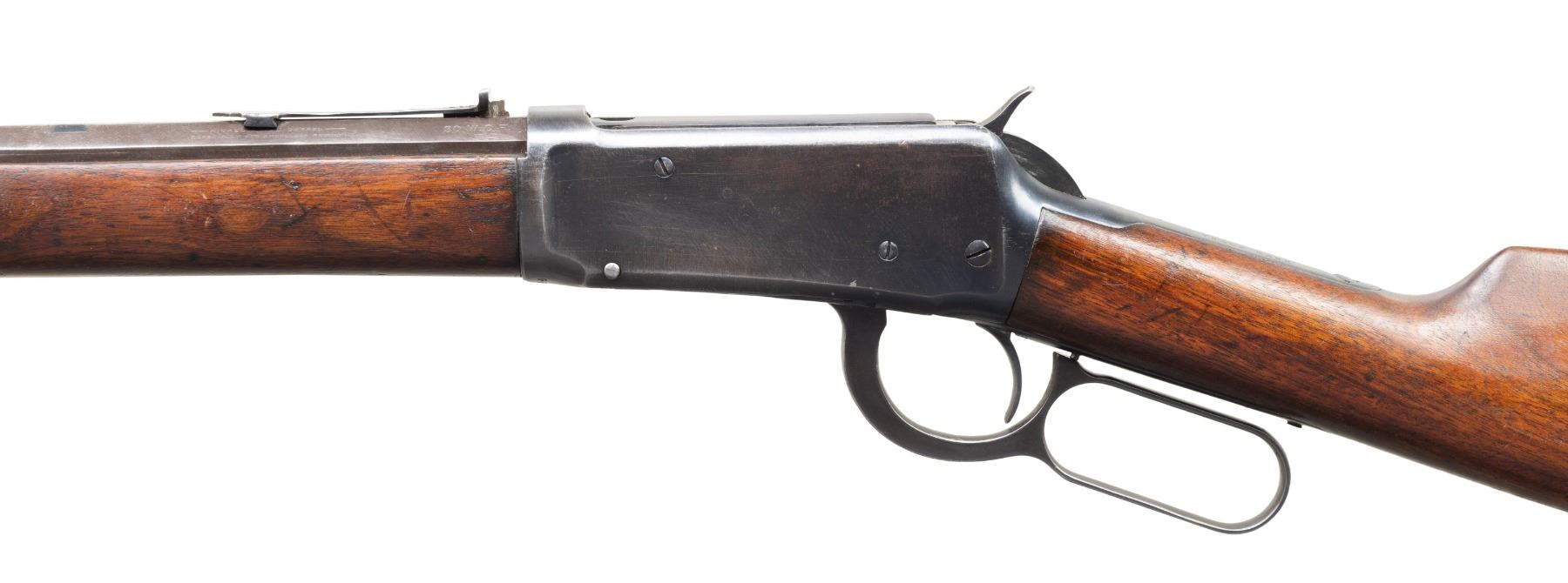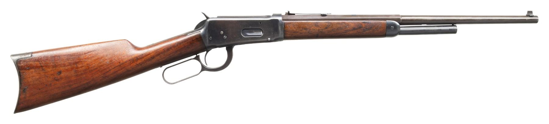 Cal. 30 WCF. S# 424044. Bbl. 18 1/2". Model 1894 lever action rifle mfg. by Winchester in 1907. Left quarter flat of the half-octagonal bbl. is marked with the cal. designation towards the breech, with the model designation marked on the upper receiver tang. Metal components exhibit a reapplied blue finish overall. Sanded and refinished plain wood forearm and straight grip buttstock with crescent steel buttplate. Dovetailed aftermarket King brass beaded blade front sight. Original rear sight dovetail has been filled in, with a new dovetail cut 1 3/4" further to the rear. Dovetailed U-notch rear sight with shortened elevation slide. Left side of receiver exhibits 2 filled in holes, with 1 filled in hole on the right above the loading gate. Upper receiver tang exhibits an added threaded hole, likely for a tang sight attachment. Bbl. and mag. tube have been shortened at one time. CONDITION: metal components retain large amounts to the majority of their reapplied blue finish, exhibiting light to mild edge wear fading to gray patina, scattered spots and patches of light surface oxidation and pitting, as well as striations from prior cleaning. Dark bore, exhibiting consistent dark mild to moderate pitting, while retaining fair rifling throughout. Proper manual mechanics. Wood furniture shows scattered marks and small impressions from handling and storage, with a crack present on the left side of the forearm stemming from the nose cap. (25-5346/MLW). CURIO. $400-600.