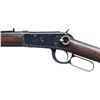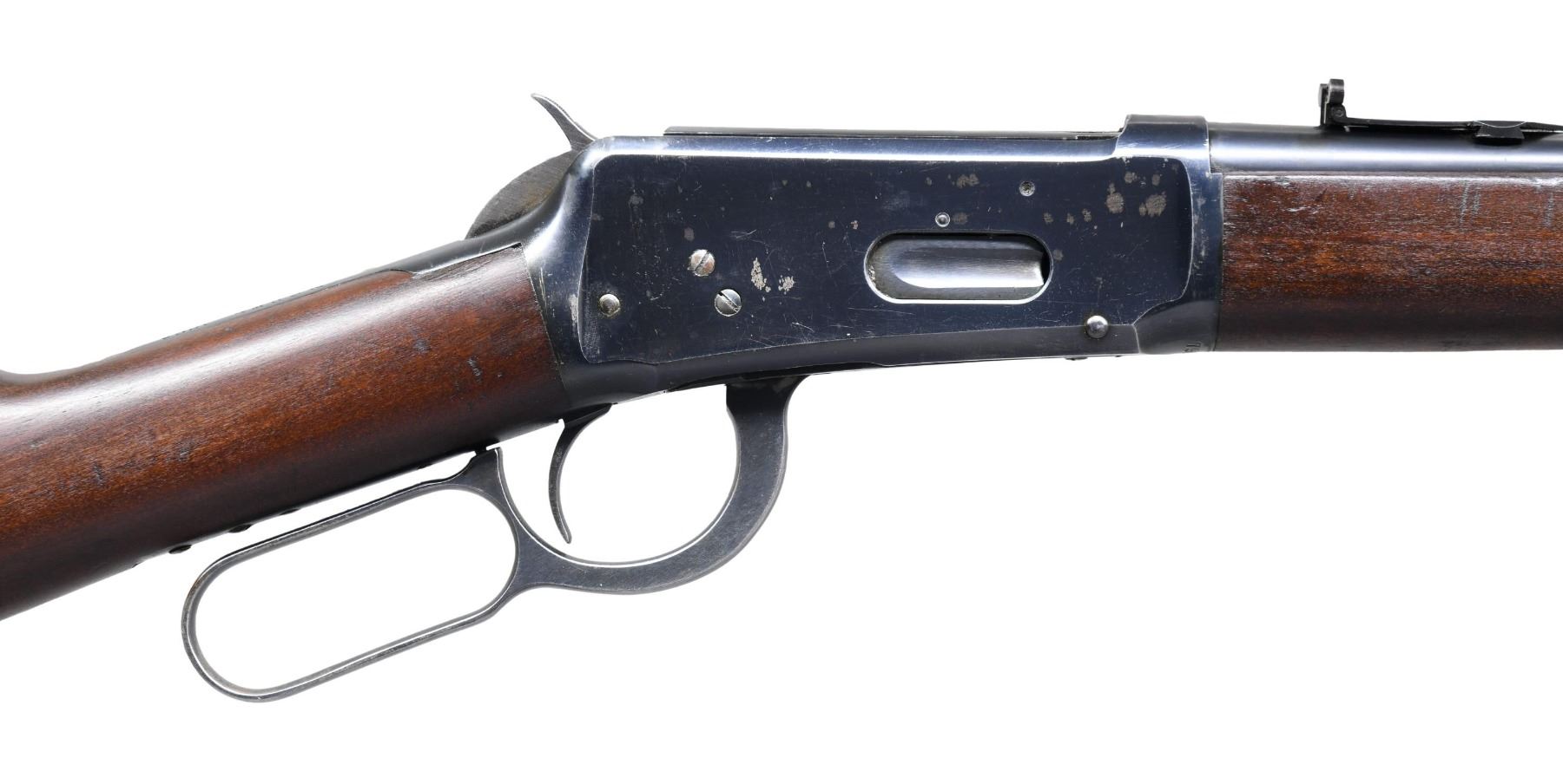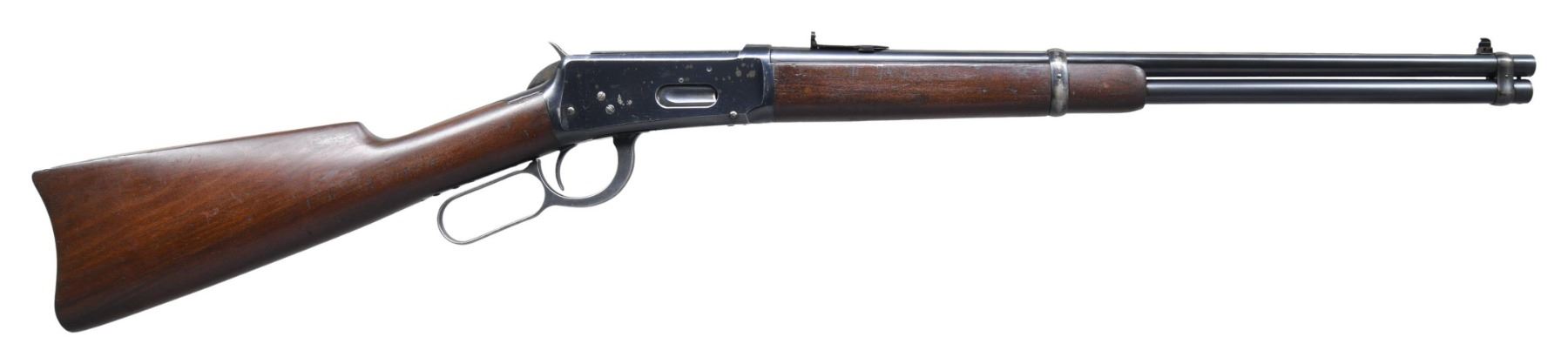 CARBINE. Cal. 30 WCF (30-30). S# 794113. Bbl. 20". Sheard No. 894L brass bead replacement front sight with a Marbles folding leaf express style replacement rear sight. Full length mag. Action has saddle ring on left side. Blue finish. Band fastened forearm and straight grip gumwood stock with steel carbine buttplate. Peak of buttplate is stamped "72". Mfg. in 1916. CONDITION: 80% lightly worn blue showing edge wear with scattered spots of flaking and scratches. Lightly sanded and refinished wood shows some remaining scratches and marks. Sound action. Very good bright bore. PROVENANCE: Estate of Russell Dickerman. (25-1863/DS). CURIO. $1,500-2,000.