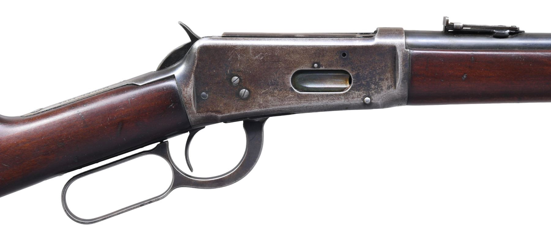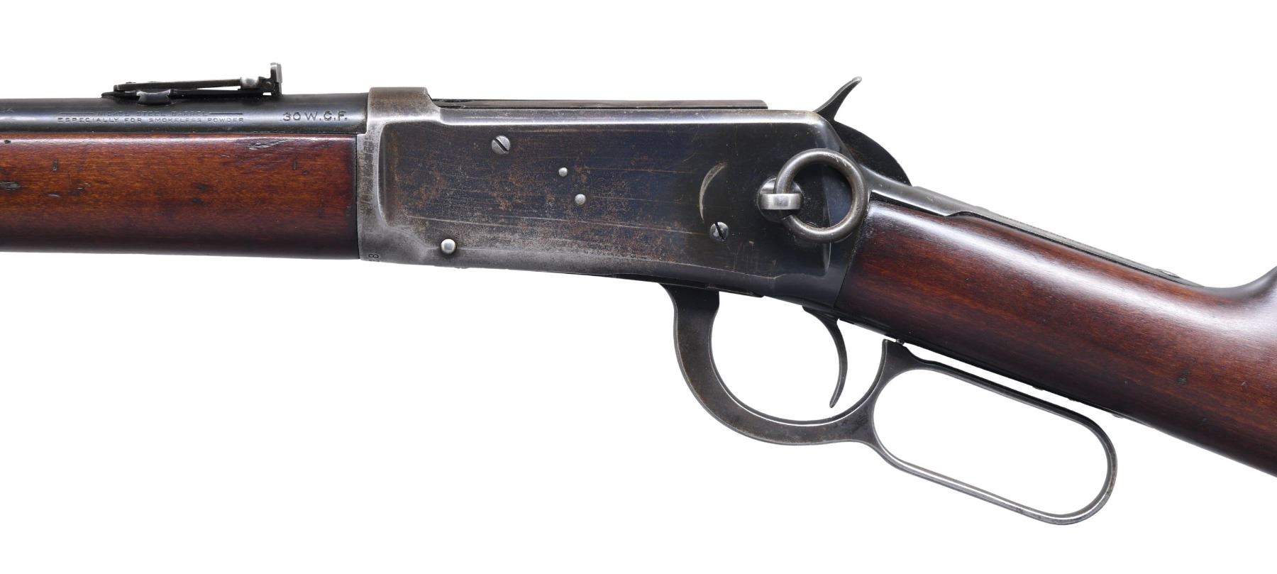 Cal. 30 WCF. S# 863838. Bbl. 20". Replacement pinned blade front sight w/ adjustable carbine leaf rear sight. Action has saddle ring on left side. Gumwood forearm & straight grip stock w/ steel carbine buttplate. Mfg. 1919. CONDITION: bbl. & mag. tube retain 90% lightly faded blue. Action has 50% blue fading to brown/gray. Sanded & refinished stocks show dents & marks. Right side of stock has a long grain check. Bore retains strong rifling. (25-712/DS). CURIO. $700-1,000.