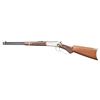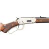 CARBINE. Cal. 30 WCF. S# 840834. Bbl. 20" carbine style. Full length mag. Pinned blade front with express style rear sight. Blued bbl. & mag. tube. Action, bbl. bands & crescent steel rifle style buttplate have and added nickel finish. Left side of receiver has a saddle ring. Special order hard rubber capped pistol grip stock. Left inside lower tang is marked with assembly # 748 followed by "O". Butt of the stock has matching assembly # 748. Stock & forend have added spade pattern hand checkering. S# indicates 1919 mfg. CONDITION: 90% bbl. & mag blue show light scratches. Action & fittings retain over 98% renickeled finish. Sanded wood has a non-gloss finish showing small chips along the top tang. Sound mechanics. Good bore. (25-1388/DS). CURIO. $500-800.