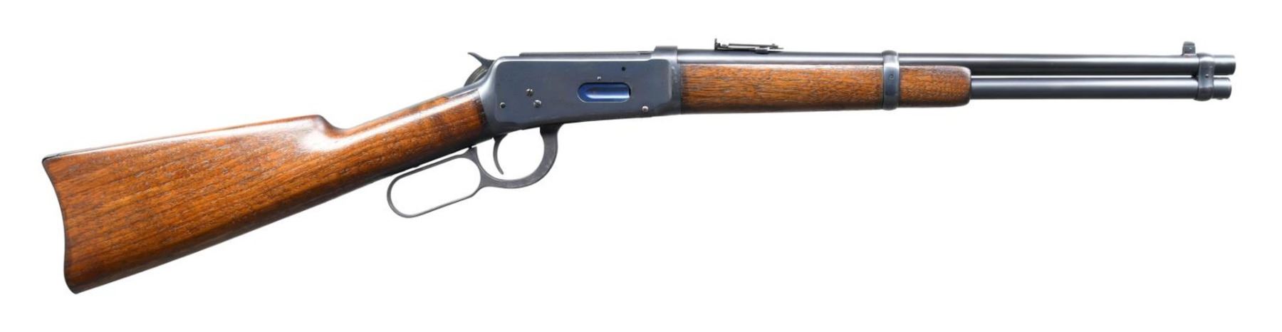SRC. Cal. 38-55 WCF. S# 753920. Bbl. appears to be shortened to 16" round carbine style. Pinned blade front sight w/ carbine leaf rear sight. Full length mag. Blue finish. 8" Trapper length walnut forearm (1" shorter than standard). Straight grip walnut stock w/ steel carbine buttplate. Serial number indicates 1914 mfg. CONDITION: over 95% finely reblued finish showing marks & spots of finish loss on action. Area around front sight boss shows small holes & plum coloring where it was welded to the bbl. Wood has good open grain refinish. Very good bright bore. PROVENANCE: The Collection of Edward Scott Meadows. (24-715). CURIO. $4,000-6,000.